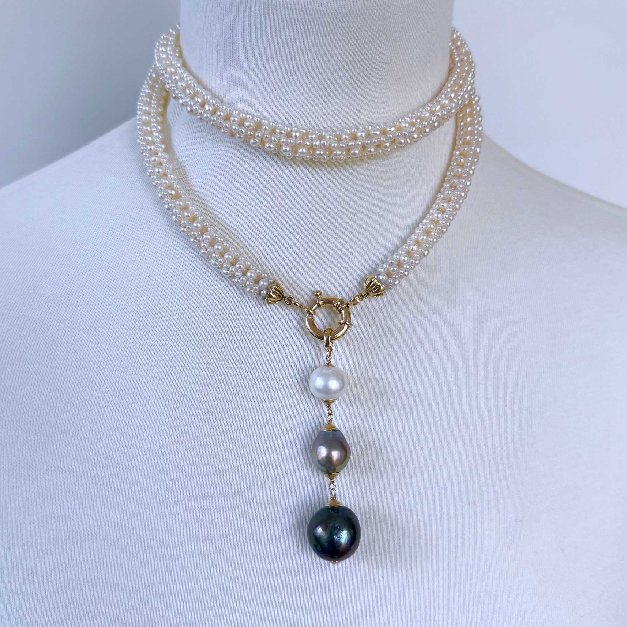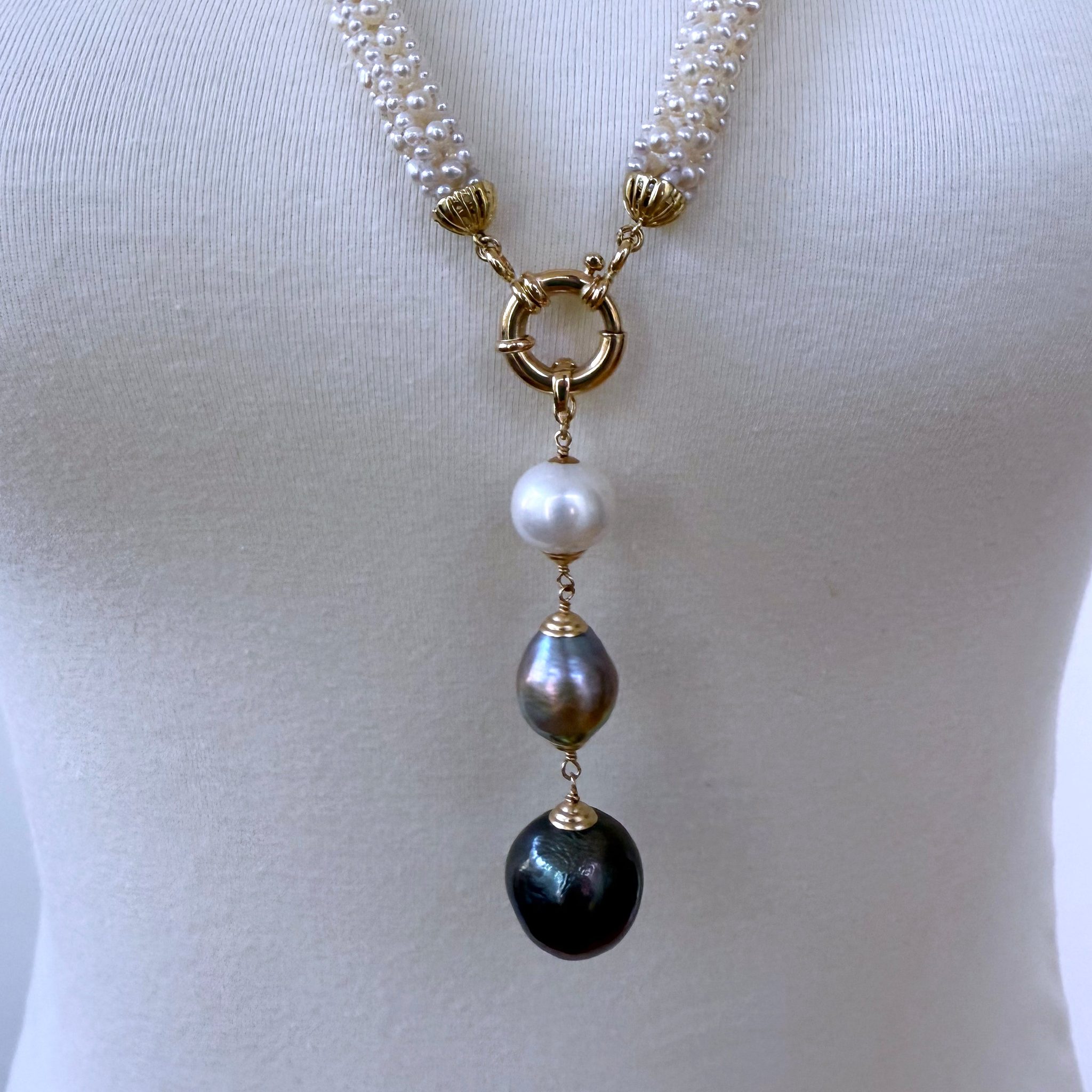 A absolutely stunning 3.5 inch removable Graduated Drop hangs from the Ring Clasp. The Tassel is made of one White Pearl, Grey Pearl and Black Pearl all displaying a vivid iridescent luster and sheen. Each Pearl hangs off one another from Solid 14k Yellow Gold Wiring, perfectly matching the rest of the gold in the Necklace.