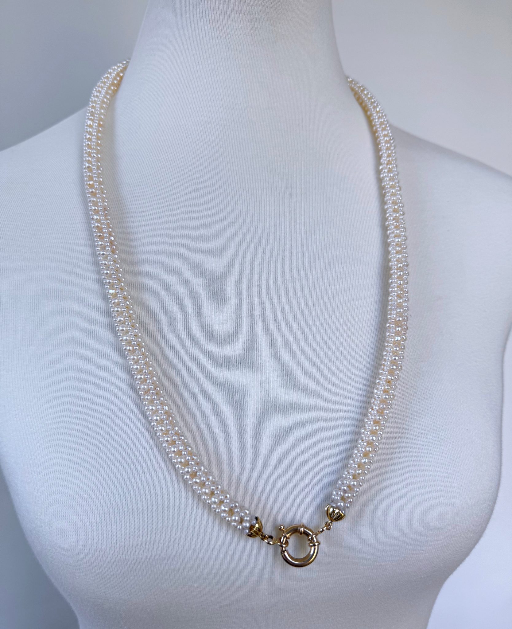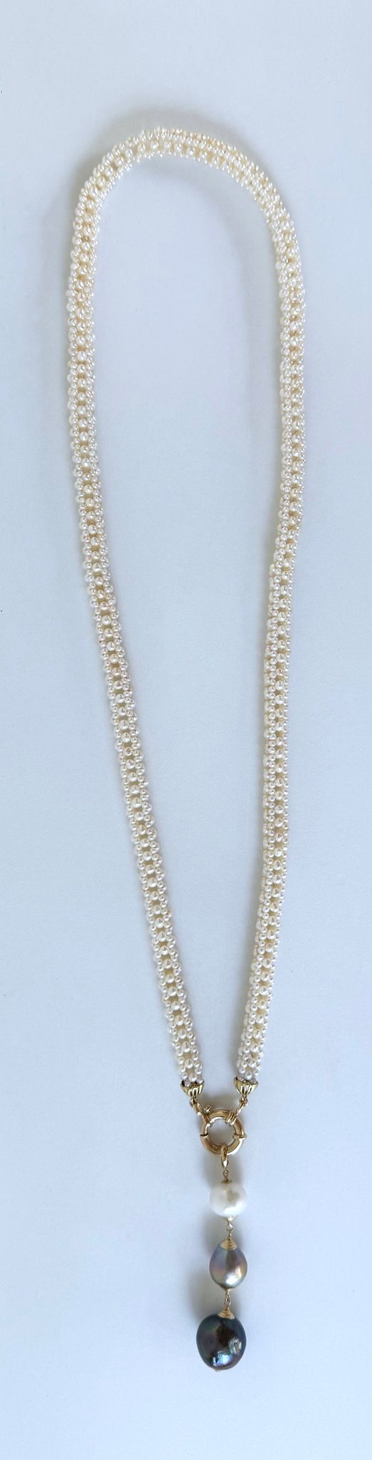 Fine Seed Pearls are intricately woven into a 3 dimensional Square column. The Pearl collumn displays a magnificent Lace like design. Measuring 29.5 inches long, both ends of the Pearl woven Necklace meet at Solid 14k Yellow Gold decorative Cups, which latch onto a large high shine Solid 14k Yellow Gold Ring Clasp.