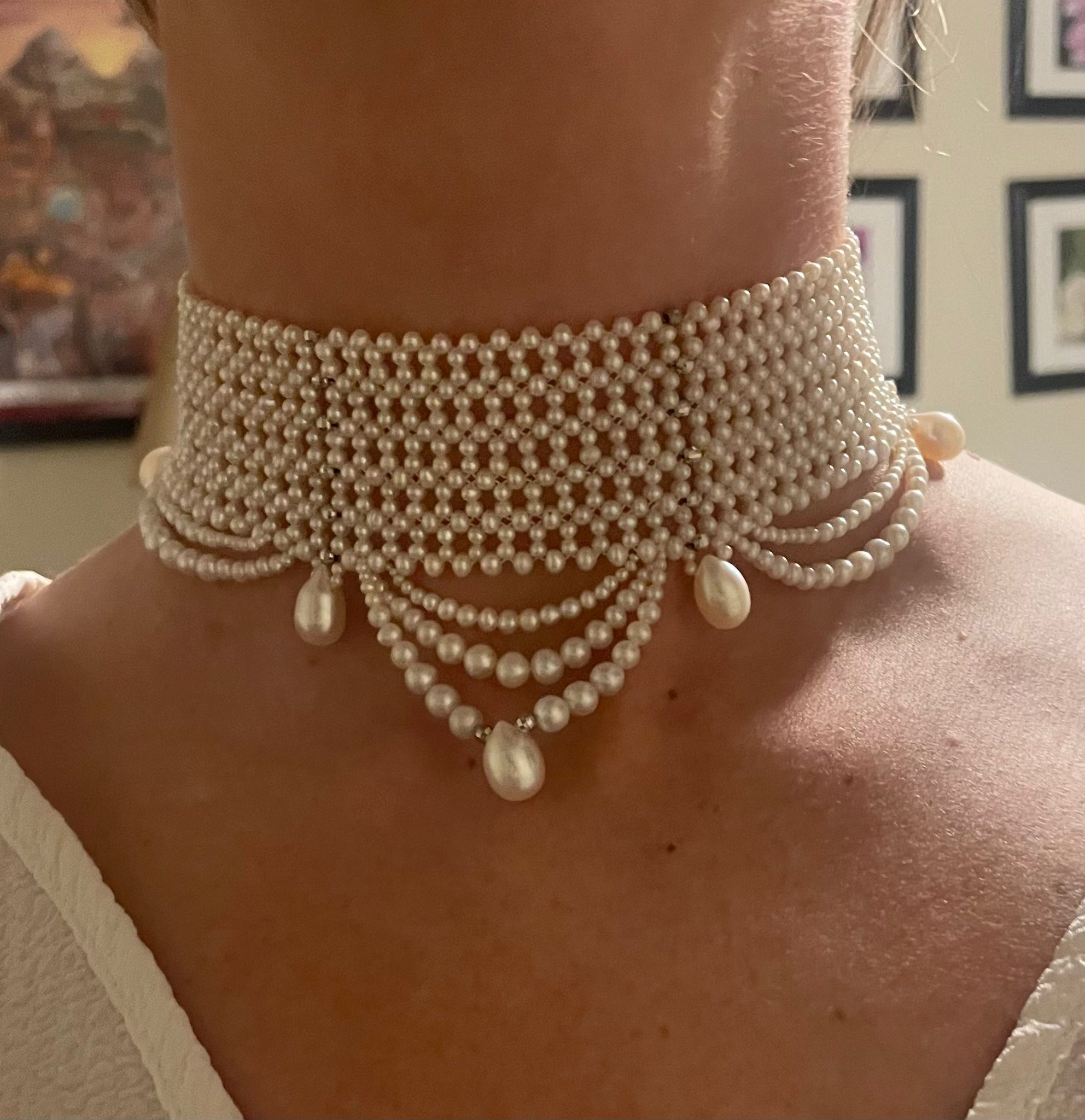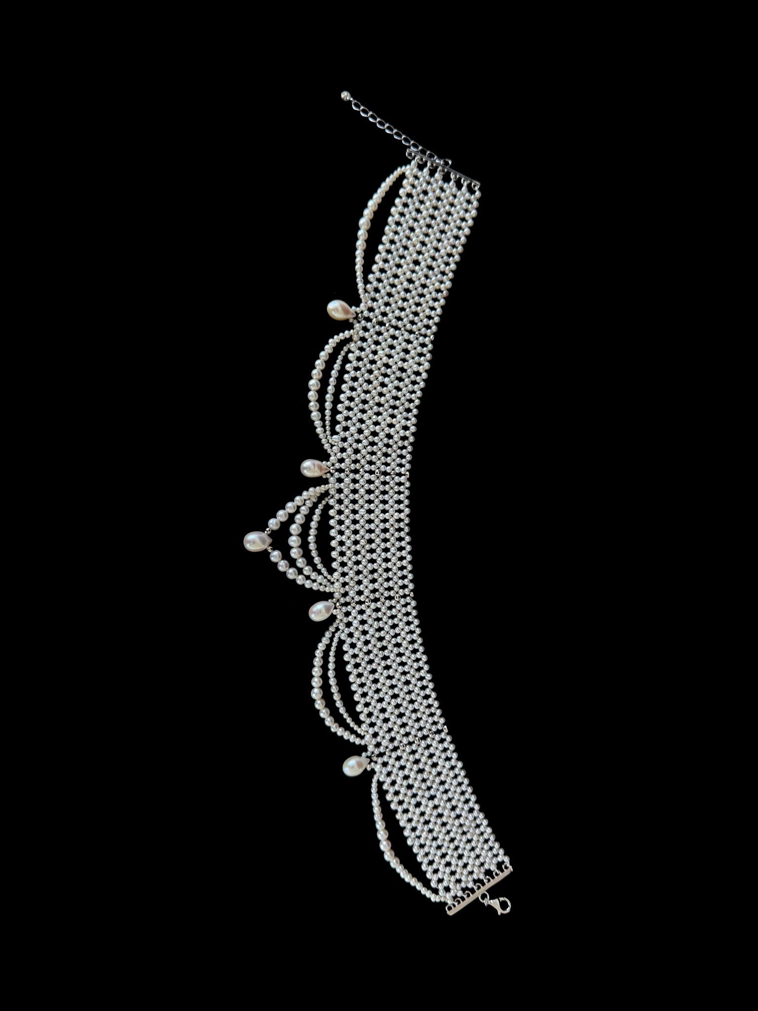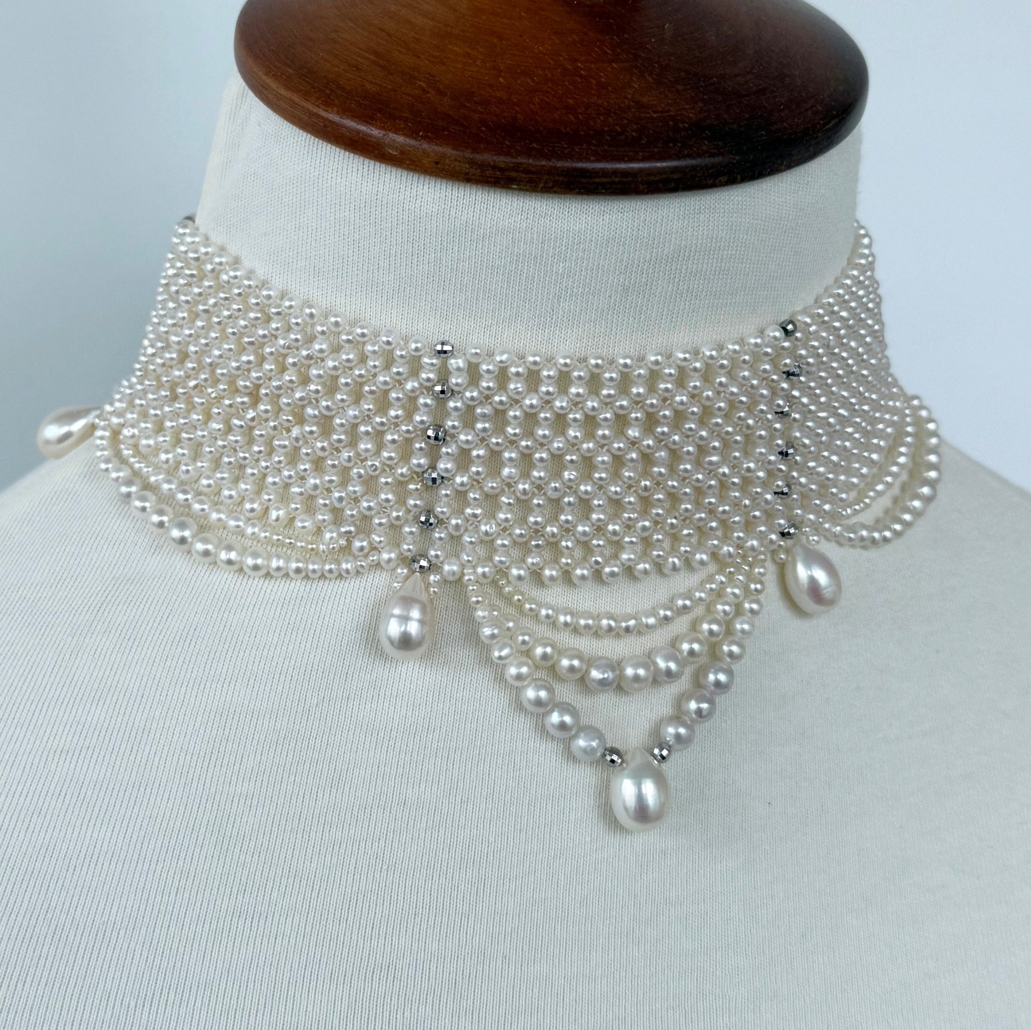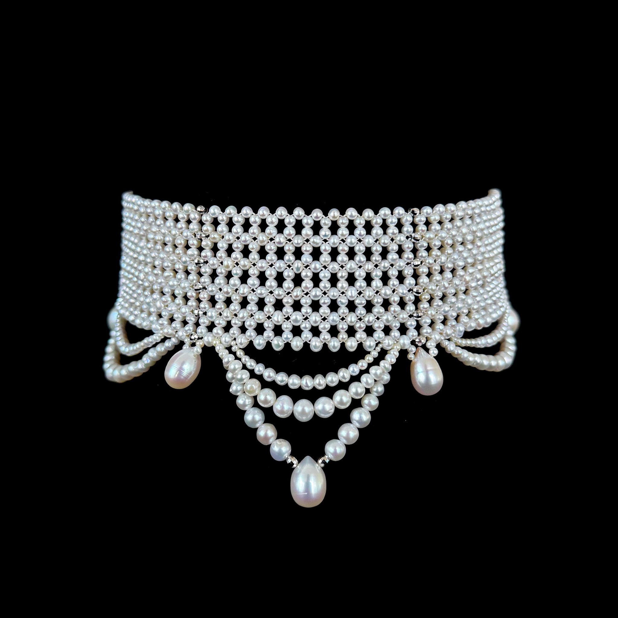 Beautiful Bridal Choker by Marina J.This piece is made with all Pearls intricately woven together into a fine lace like design. Adorned by Draped Pearls and Faceted Rhodium Silver beads, this Choker combines a contemporary feel with old world Victorian influence. The Faceted Silver beads shine with every step. A perfect piece for any formal or Bridal event. This Choker meets at a Rhodium plated Silver Adjustable Clasp, allowing it to measure between 12.75 and 14.75 inches long. Rhodium plating ensures a life long tarnish free high shine look. Woven with a slight Graduation, this Choker perfectly curves with the neck allowing it to sit comfortably.