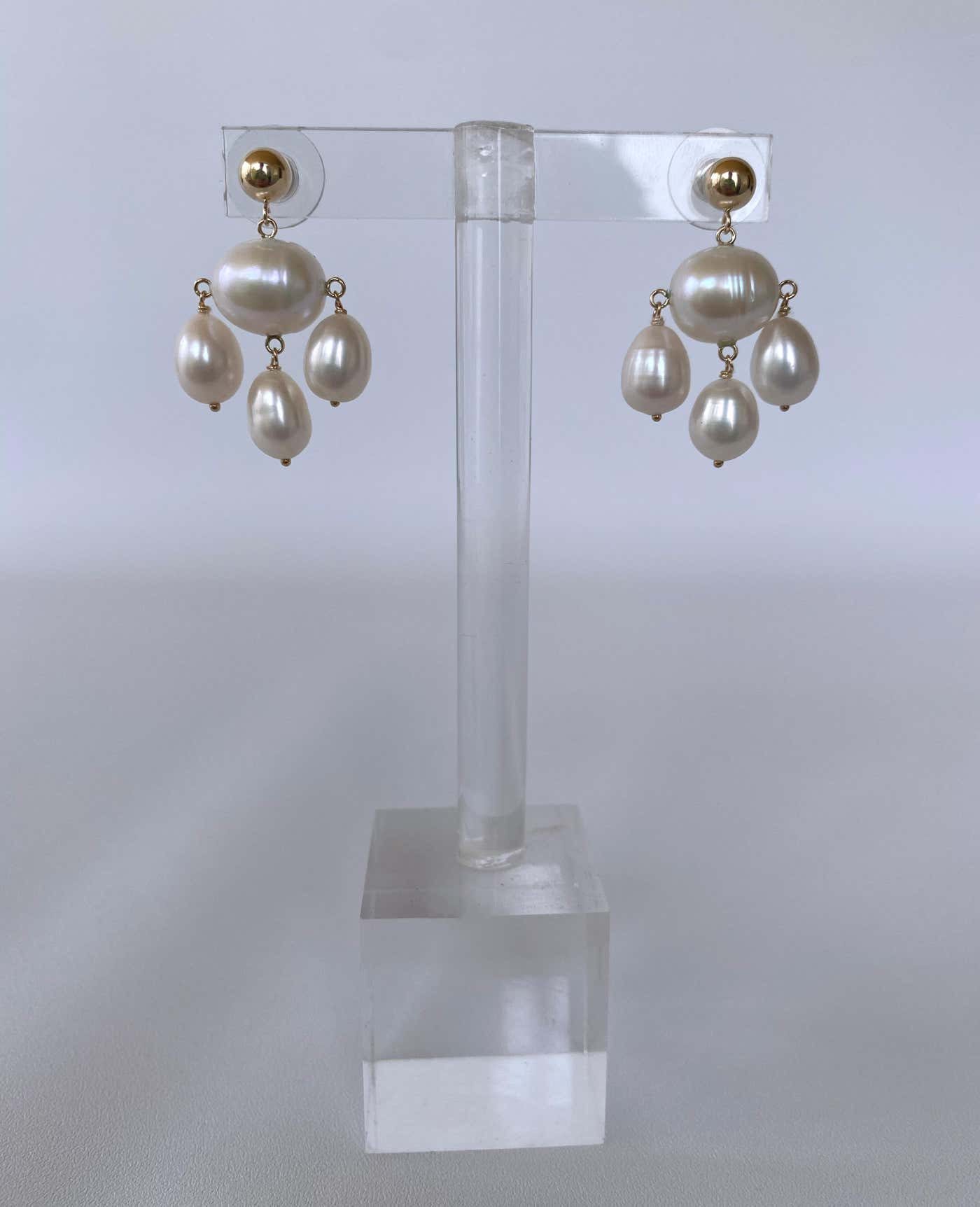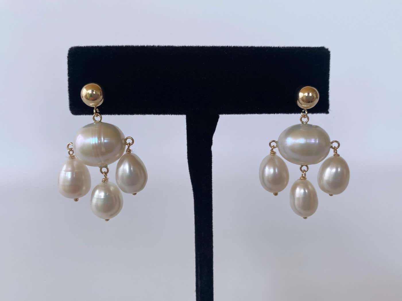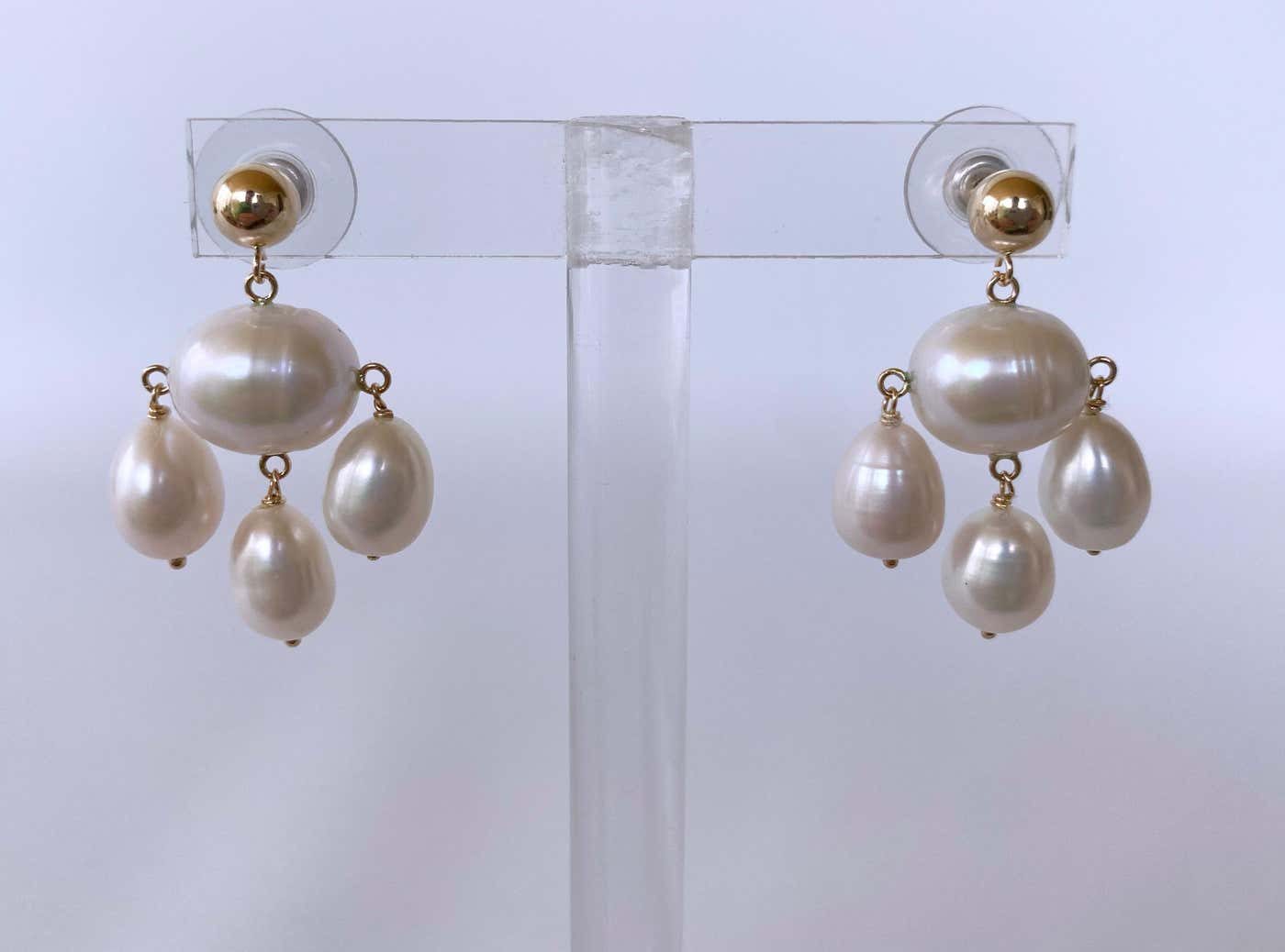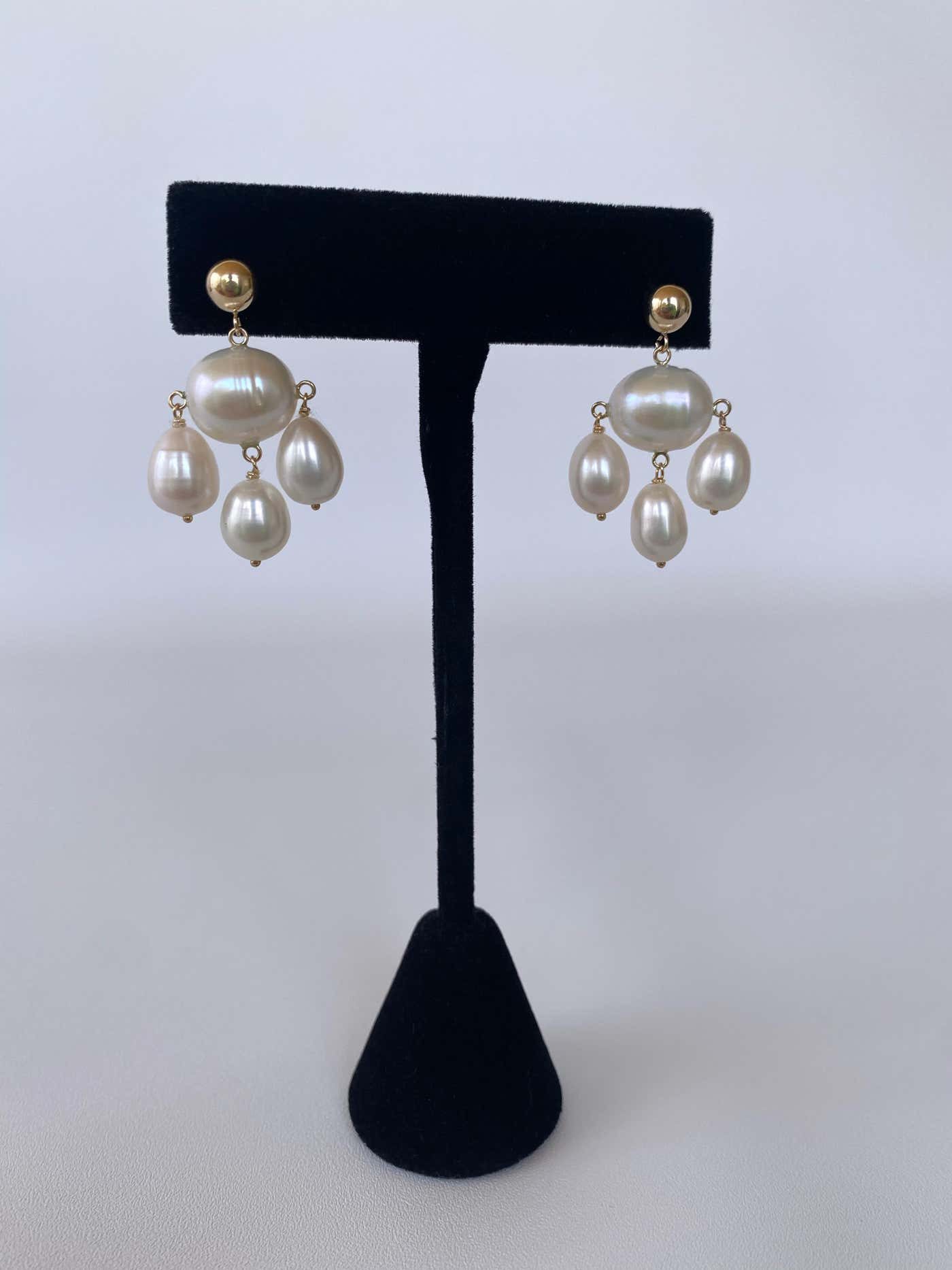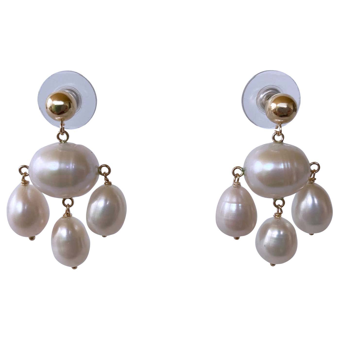Classic pair of Marina J. Chandelier earrings. This lovely pair is made entirely of high luster white Pearls which display a wild iridescence. Three teardrop Pearls dangle from oval shaped Baroque Pearl bead, fitted with 14k Yellow Gold findings and ear Wire. This pair is timeless and elegant and matches any ensemble! Hanging off studs, this pair features a beautiful high polish solid 14k Yellow Gold Beaded Stud. Perfect for bridal or other formal occasion! From top to bottom this pair measures 1.25 inches long. Large Baroque Centerpiece Pearl measures .5 inches wide