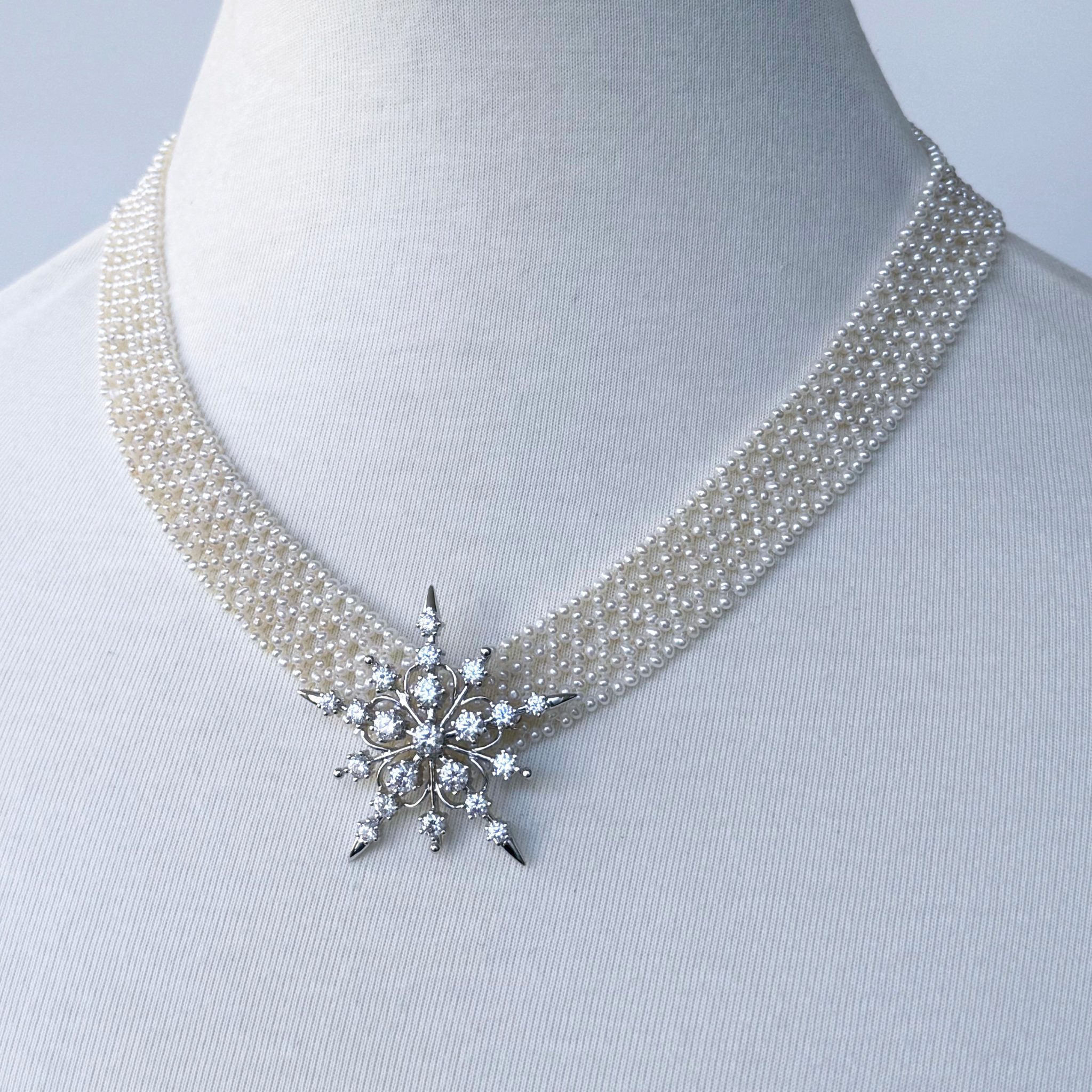 Beautiful Bridal Necklace by Marina J. This stunning necklace features all real cultured White Pearls intricately woven together into a tight lace like design. Woven into a ‘V” shape, this piece perfectly accentuates the neck and cleavage. In totality, this necklace measures 18 inches long and meets at a solid 14k Yellow Gold Decorative sliding clasp. A perfectly simple yet elegant piece for any Bridal or Formal occasion! ** Brooch not included **