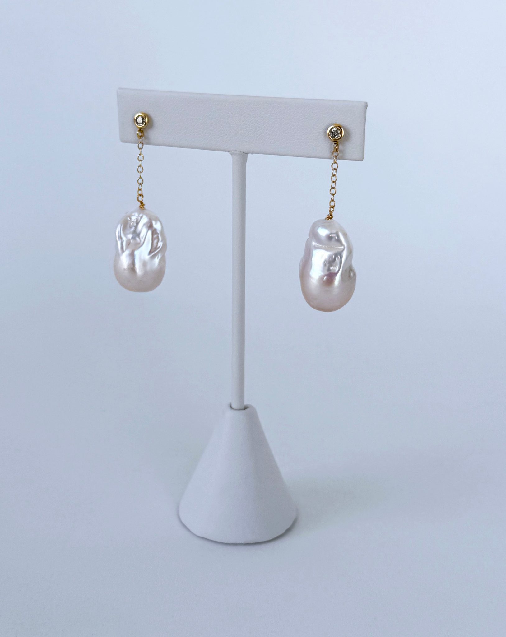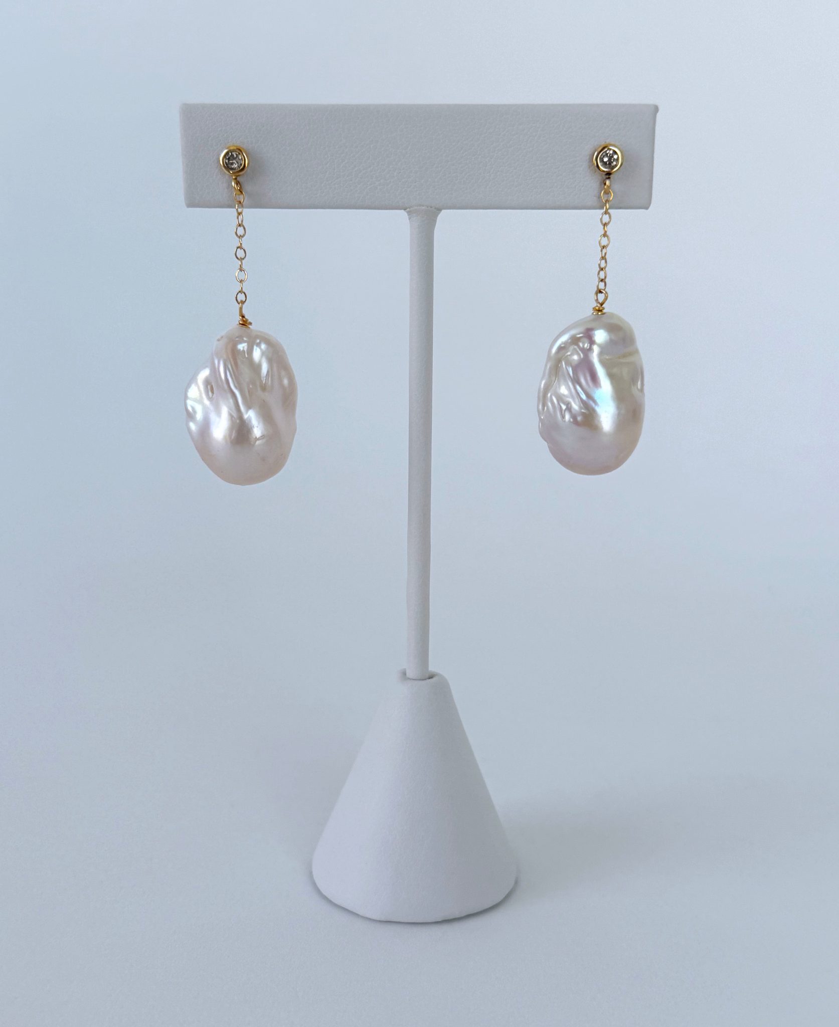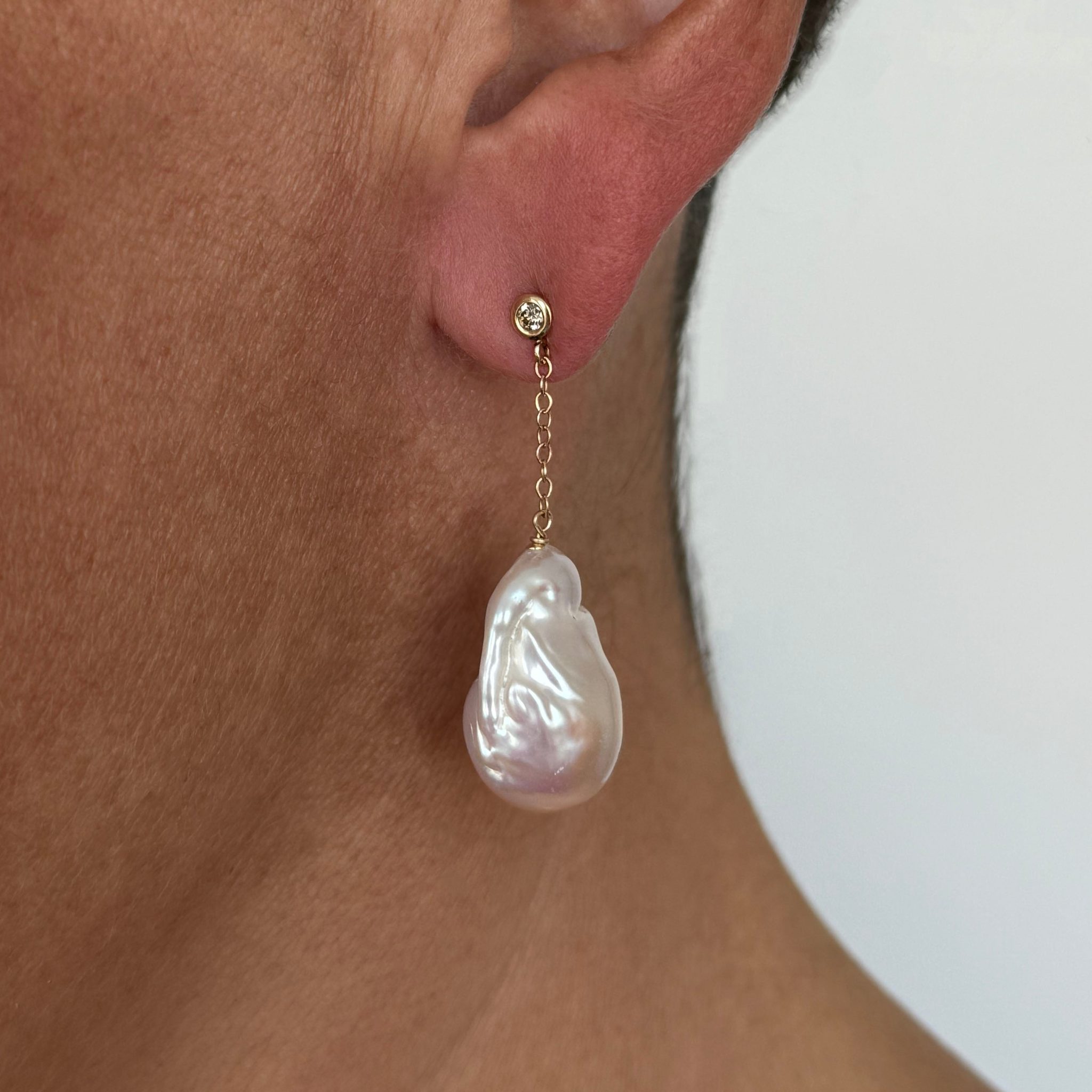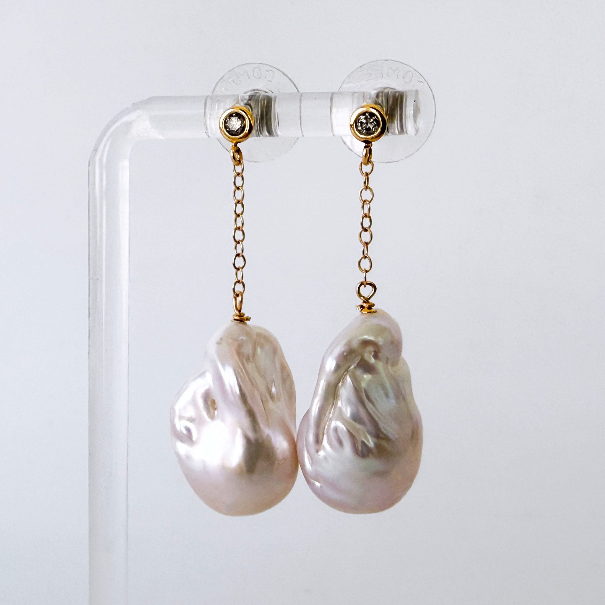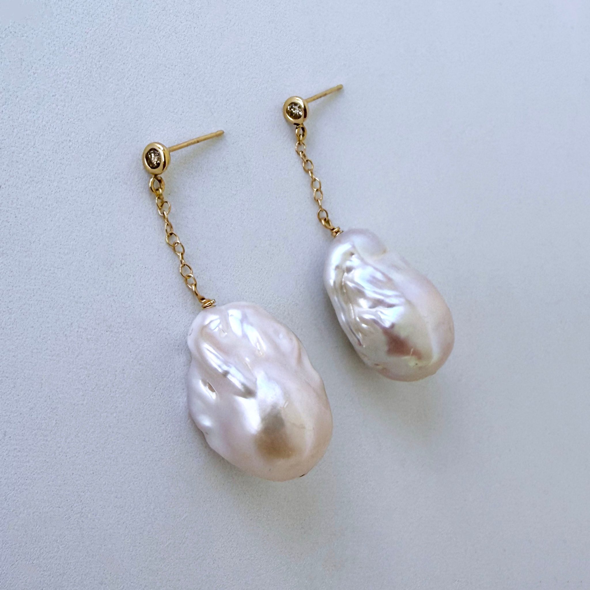 Gorgeous one of a kind pair This pair features a beautiful 14k Yellow Gold set Diamond studs, from which large Baroque Pearls with vivid multi color iridescent sheen hang from 14k Yellow Gold chain. Earrings measure 1.25 inches long and are perfect for any Bridal or formal occasion.