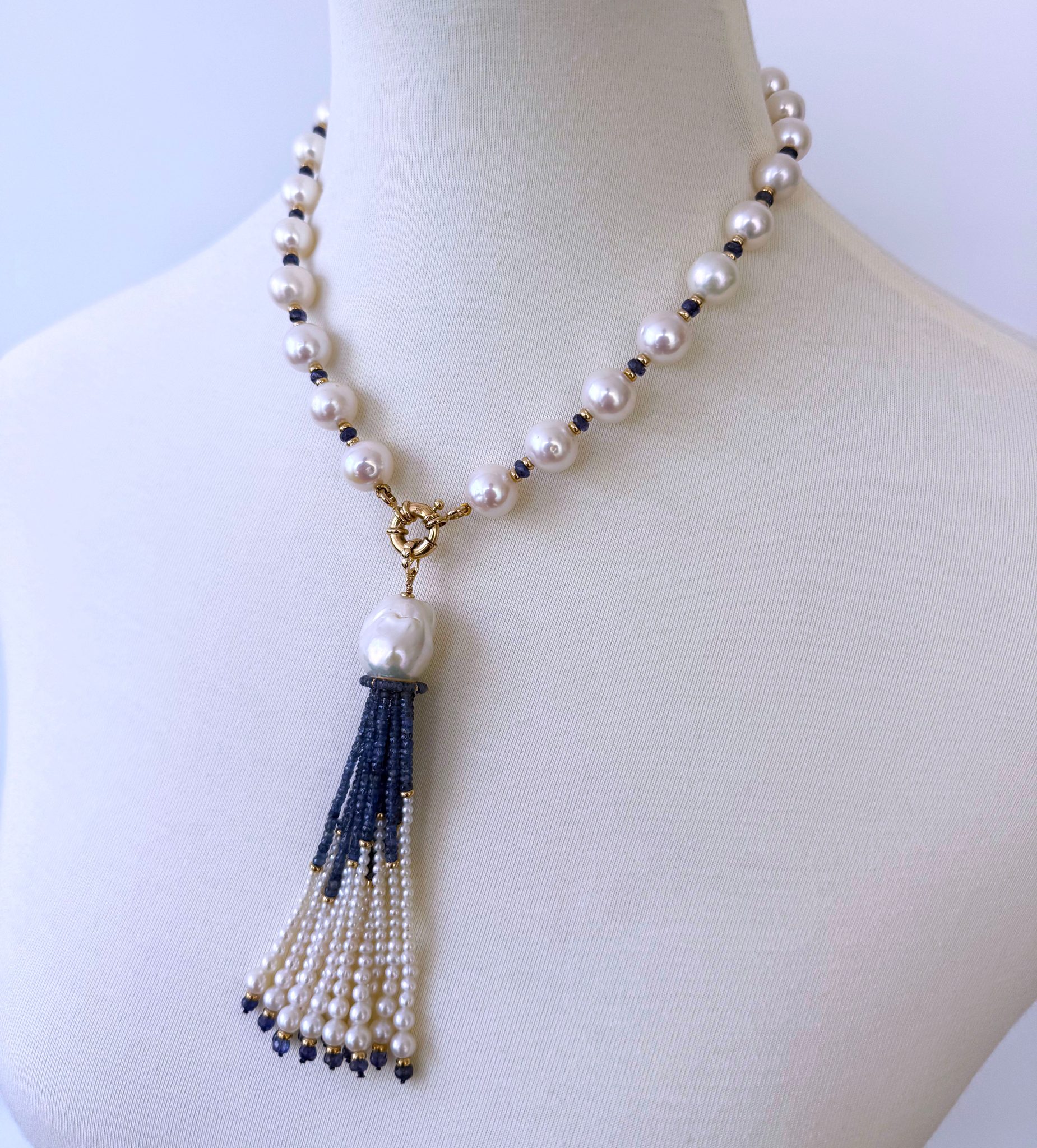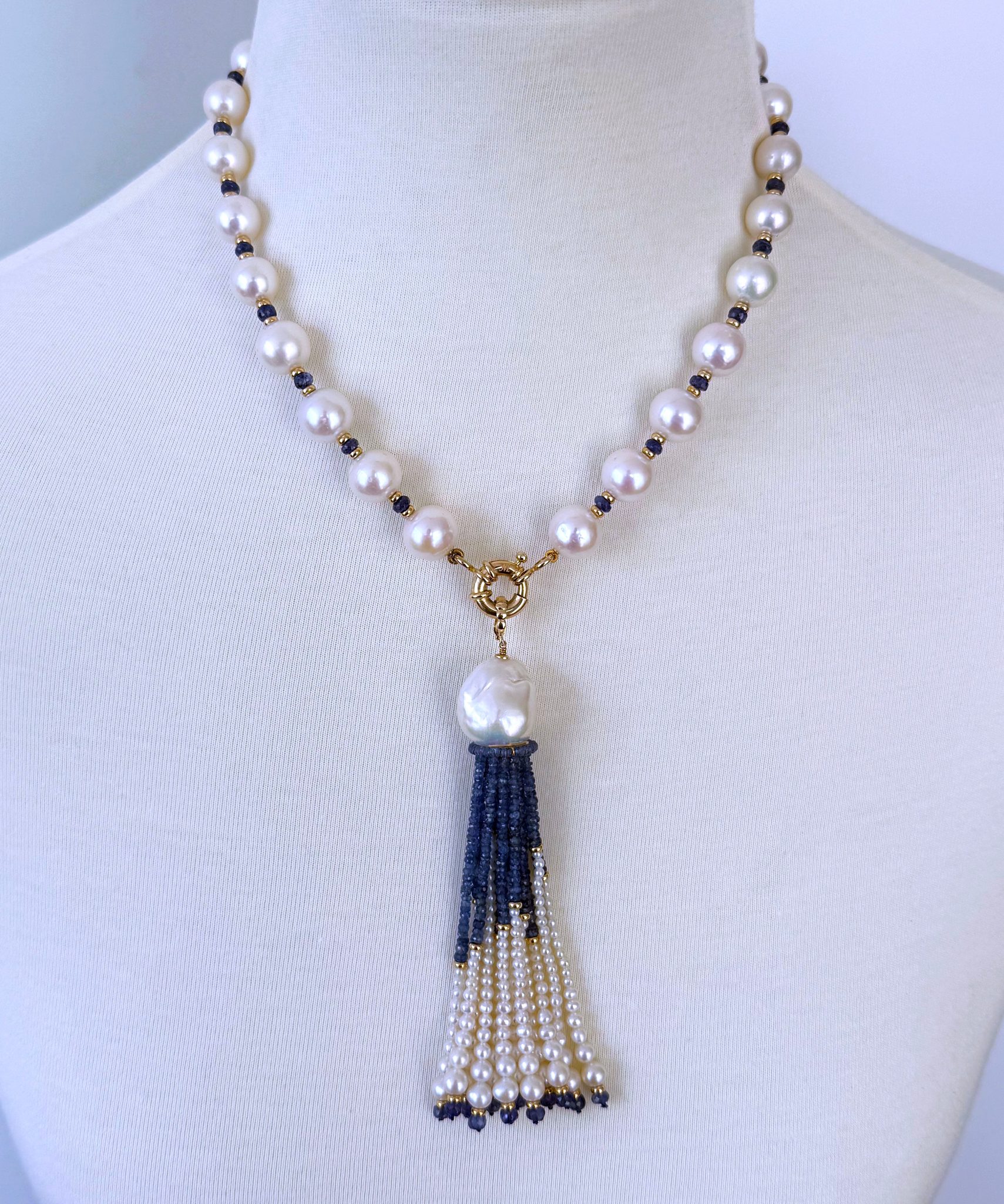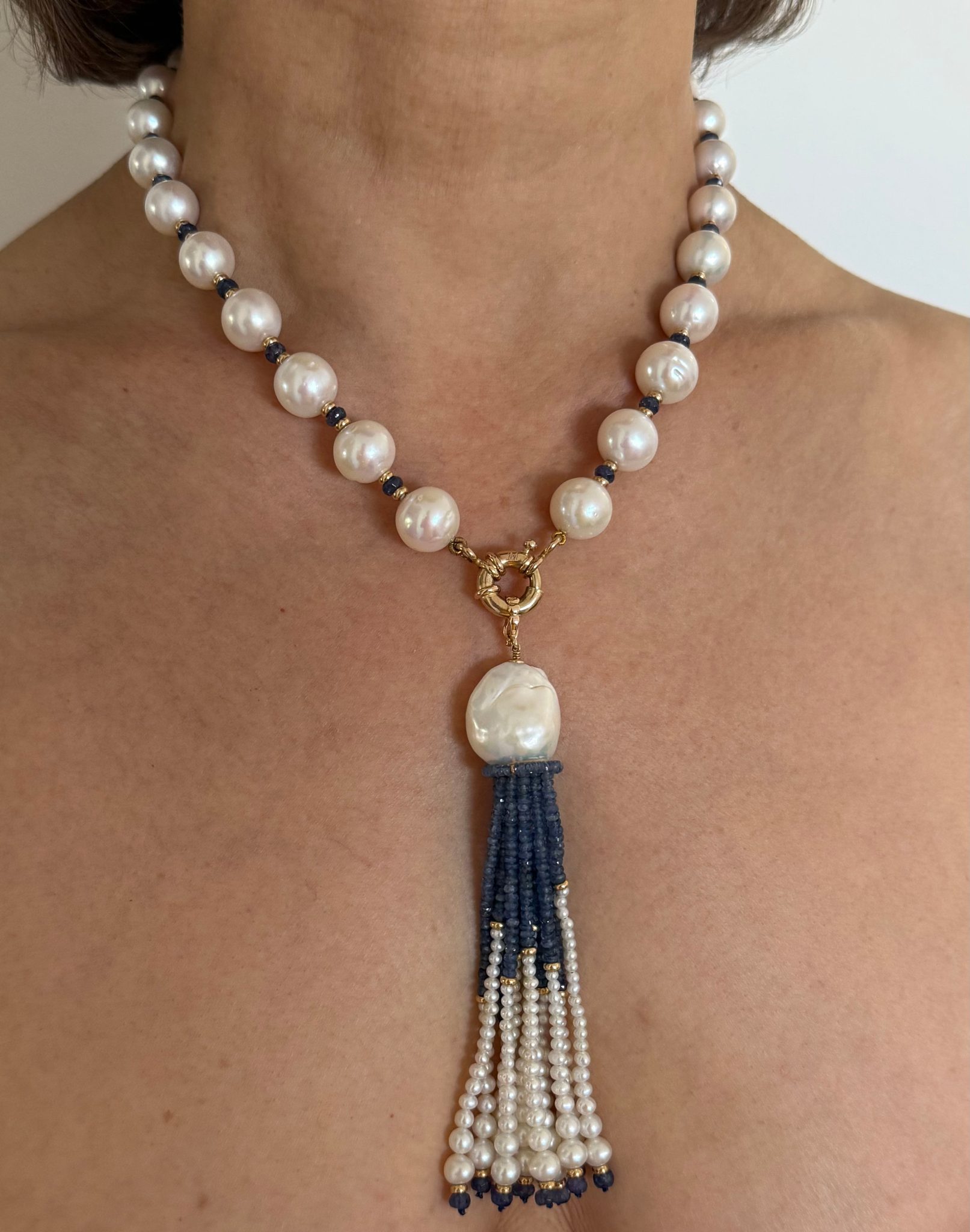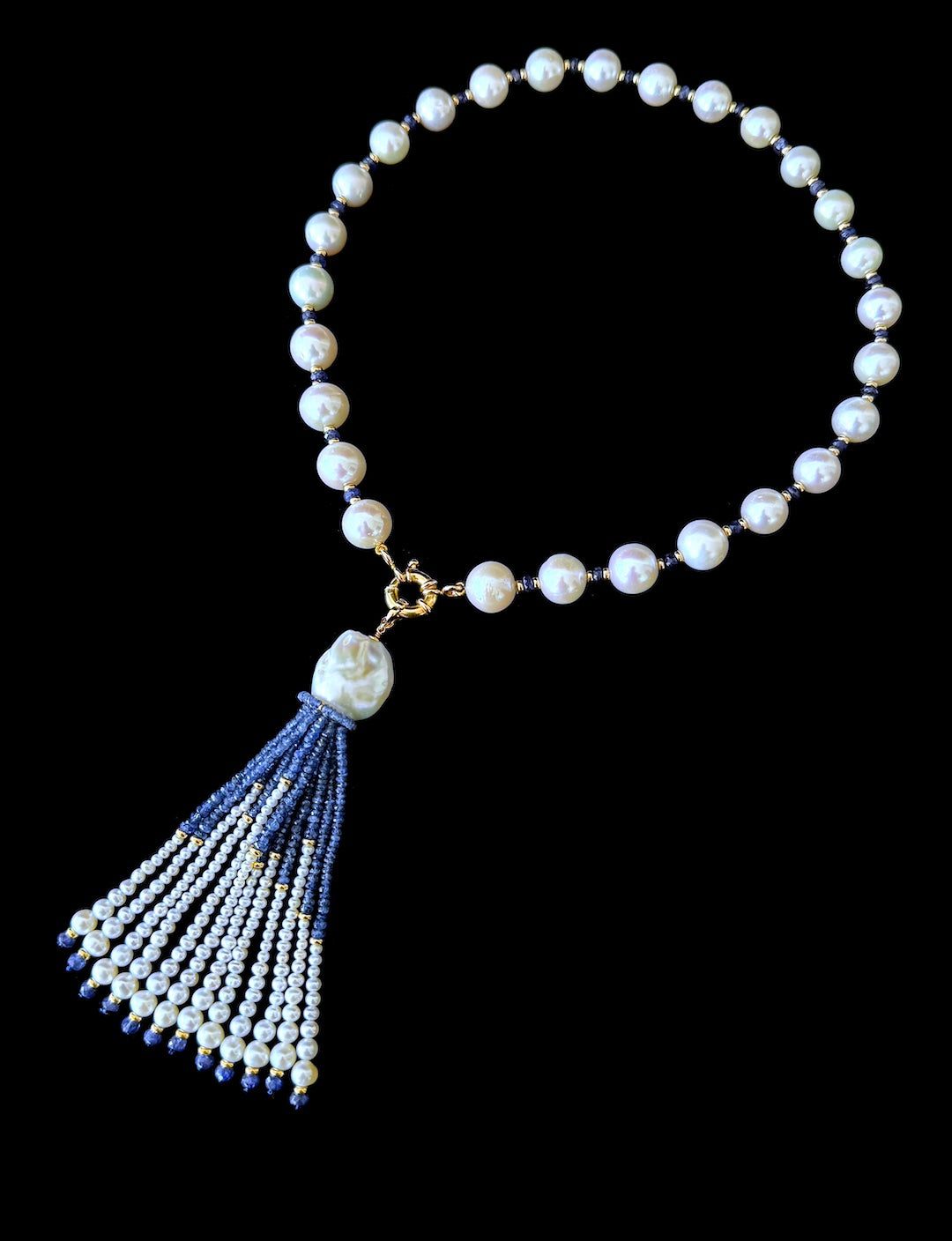 This piece is made with baroque Pearls all displaying a beautiful soft iridescent luster – all contrasted by Solid 14k Yellow Gold and Faceted Blue Sapphire findings. Measuring 17 inches long, this slightly Graduated Necklace meets at a Solid 14k Yellow Gold Ring Clasp from which a 4 inch removable Tassel hangs.The Tassel hangs off a decorative Solid 14k Yellow Gold Latch and features a large Baroque Pearls whose luster perfectly matches the Pearls in the Necklace, sitting atop a Faceted Blue Sapphire encrusted Solid 14k Yellow Gold ring, from which multiple strands of Faceted Blue Sapphire, Solid 14k Yellow Gold Findings and Graduated Pearls hang.A gorgeous statement piece perfect for any bridal or formal occasion!