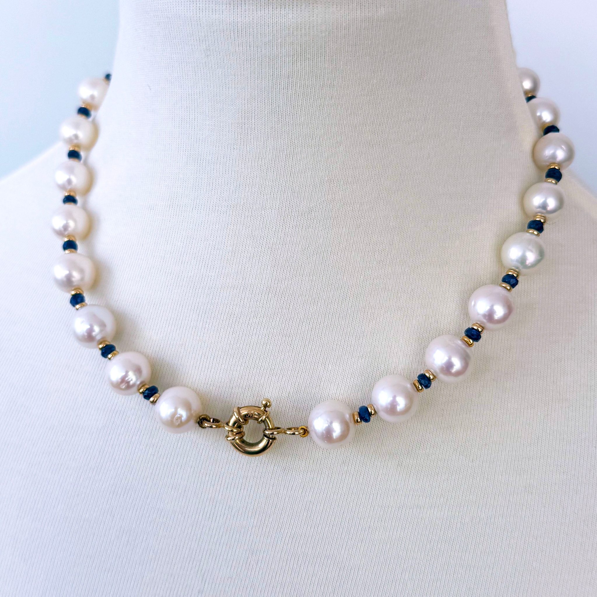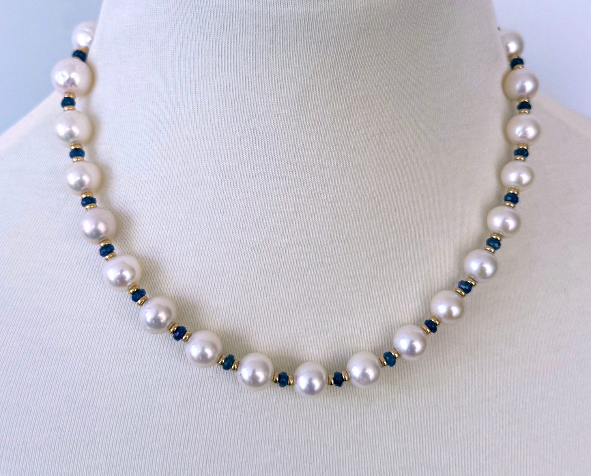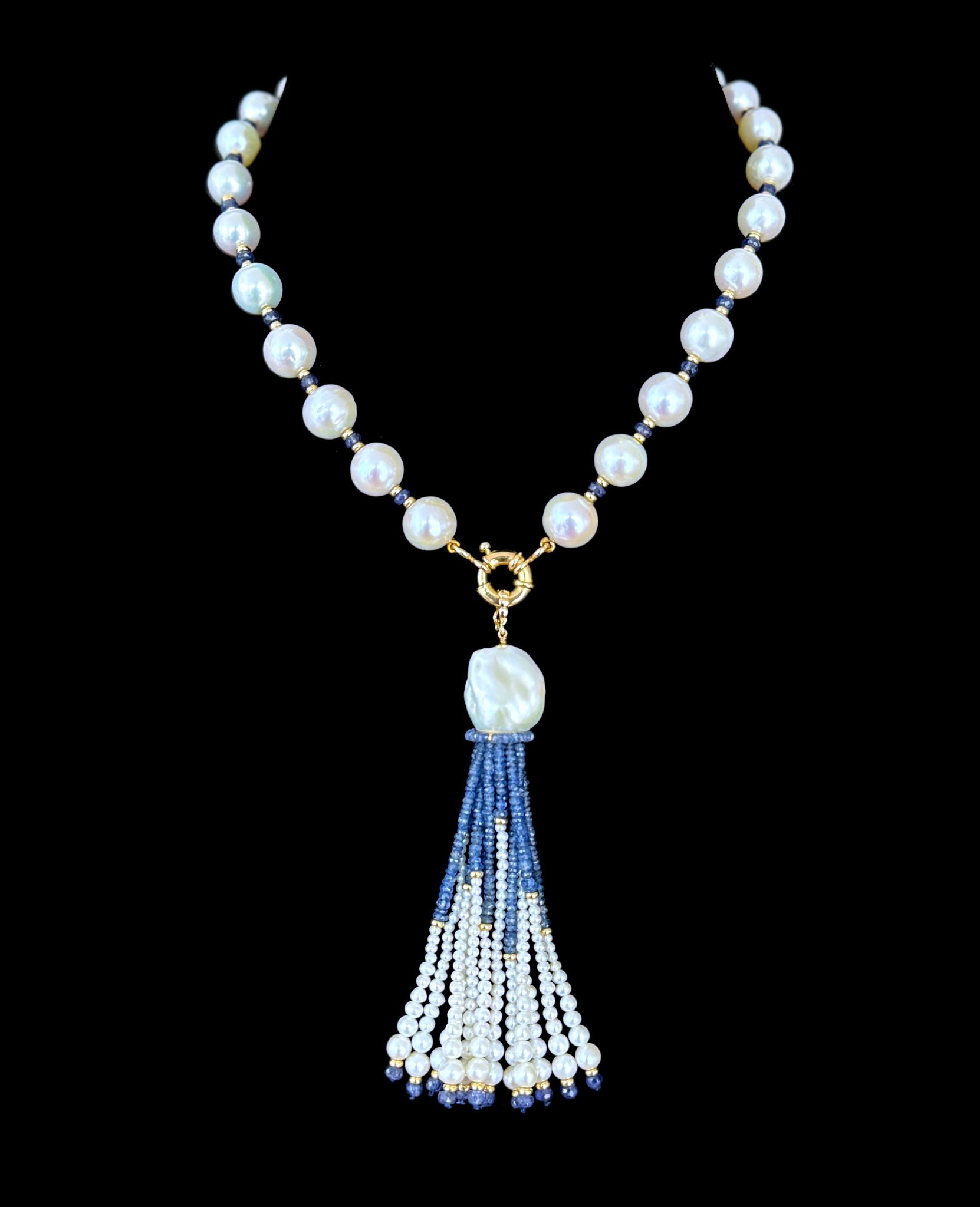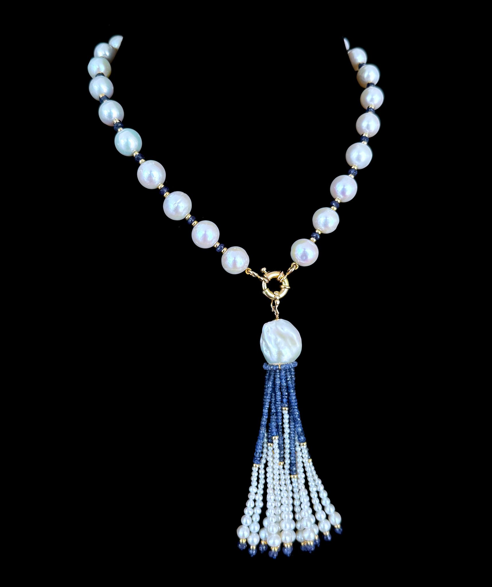 This piece is made with baroque Pearls all displaying a beautiful soft iridescent luster – all contrasted by Solid 14k Yellow Gold and Faceted Blue Sapphire findings. Measuring 17 inches long, this slightly Graduated Necklace meets at a Solid 14k Yellow Gold Ring Clasp from which a 4 inch removable Tassel hangs.The Tassel hangs off a decorative Solid 14k Yellow Gold Latch and features a large Baroque Pearls whose luster perfectly matches the Pearls in the Necklace, sitting atop a Faceted Blue Sapphire encrusted Solid 14k Yellow Gold ring, from which multiple strands of Faceted Blue Sapphire, Solid 14k Yellow Gold Findings and Graduated Pearls hang.A gorgeous statement piece perfect for any bridal or formal occasion!