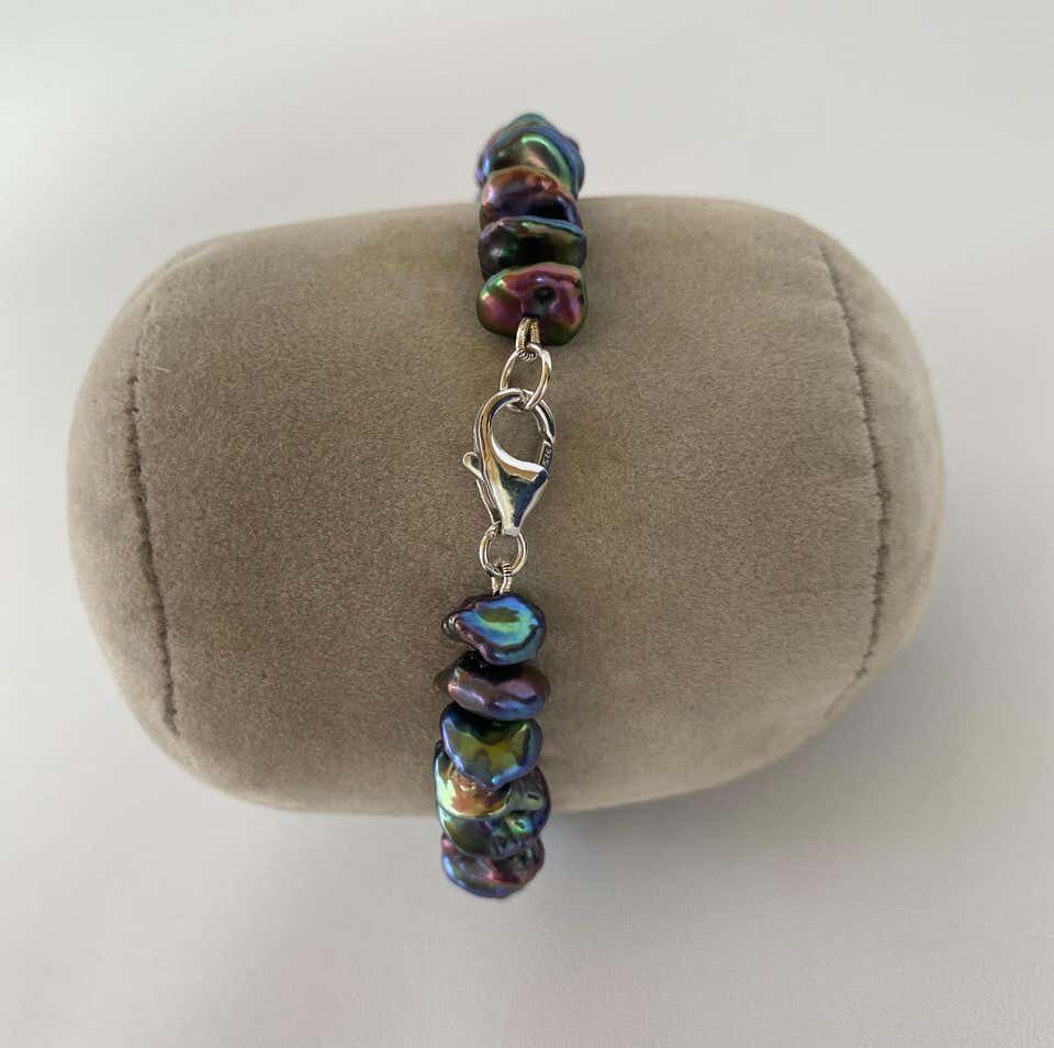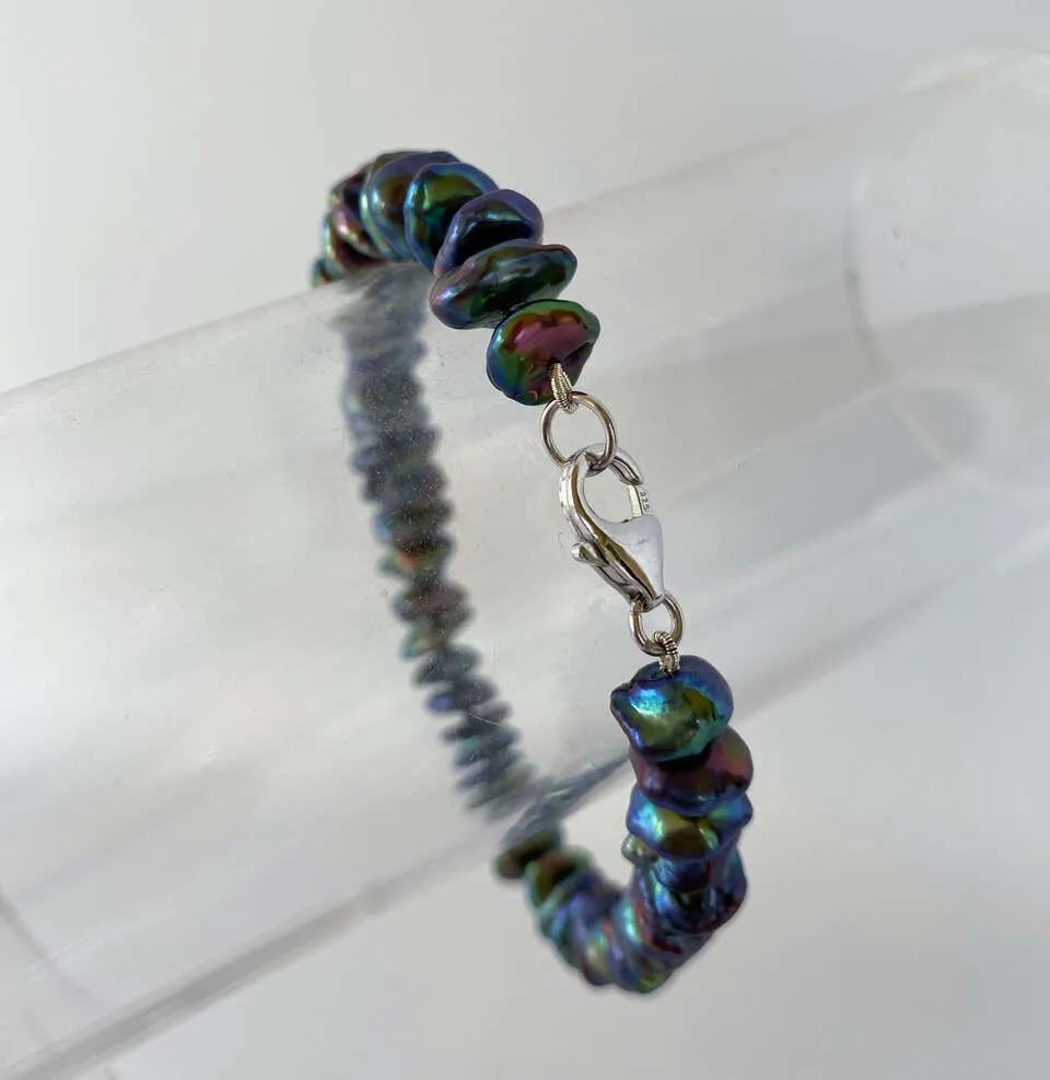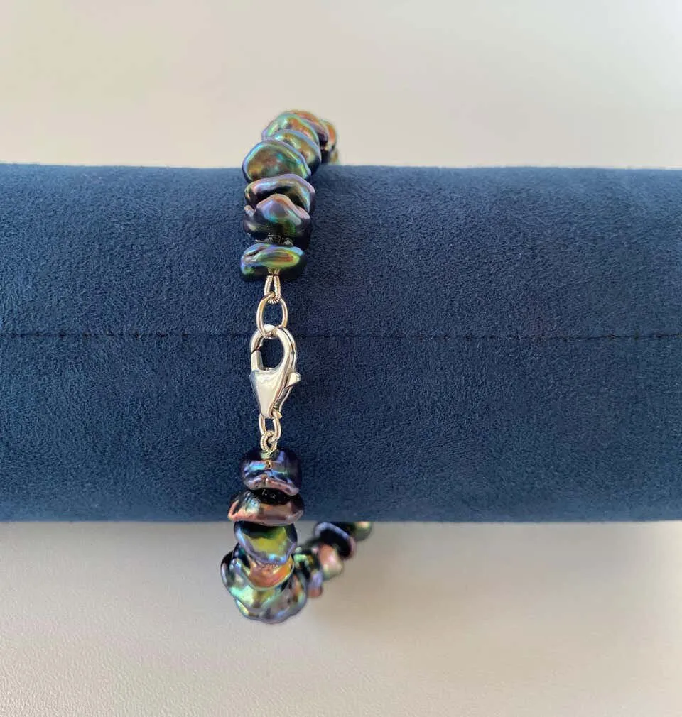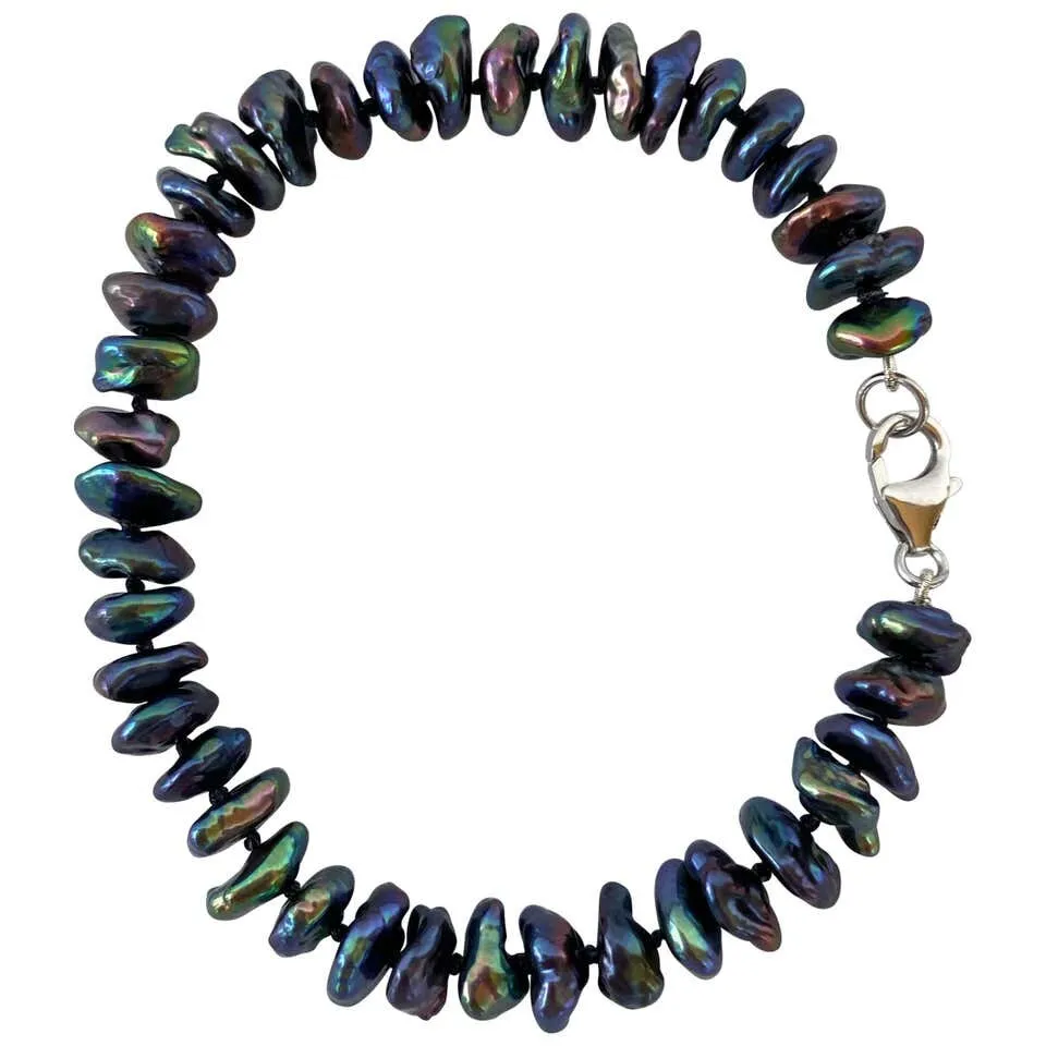 This amazing bracelet features irregularly shaped Black Pearl beads meeting at a Sterling Silver, Rhodium Plated clasp. These Pearls offer a gorgeous iridescent oil spill / peacock colored sheen. This bracelet is a perfect compliment to any professional or casual attire. Measuring at 8.75 inches, this bracelet sits comfortably and boldly on the wrist. Double knotted for security and aesthetics. **All jewelry is handmade by designer for any custom sizing, color, material, or any other requests, please contact Marina J. Price may vary accordingly.**
