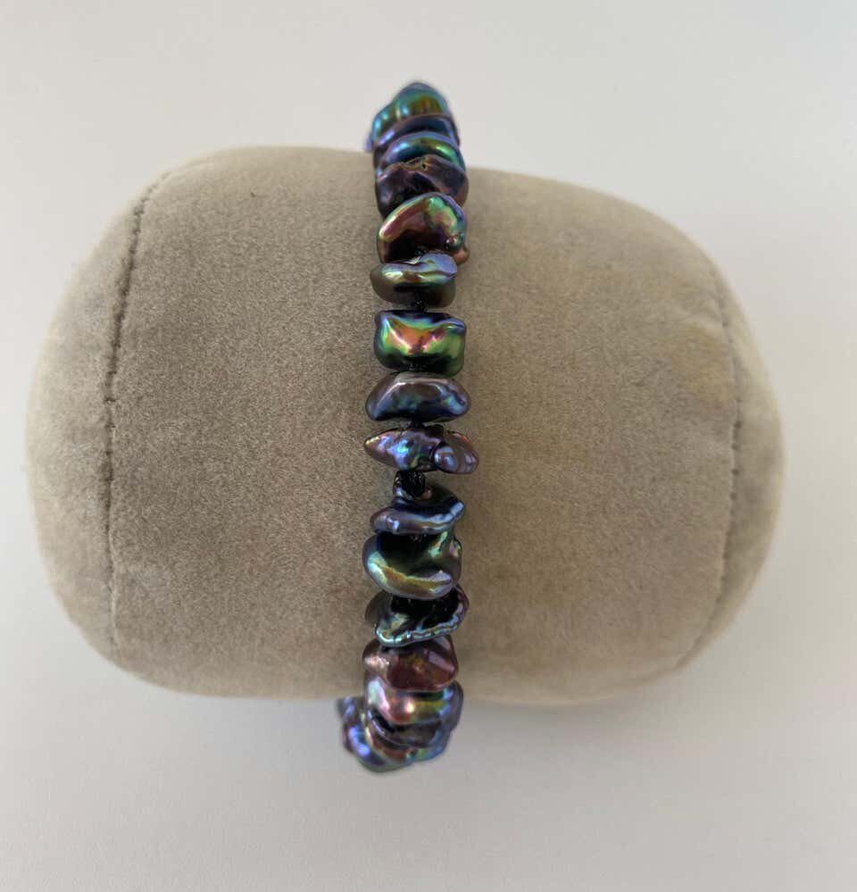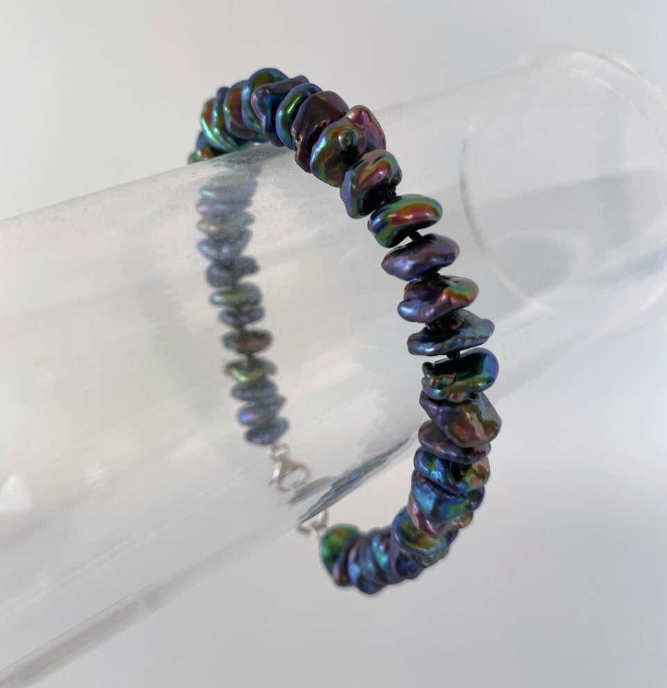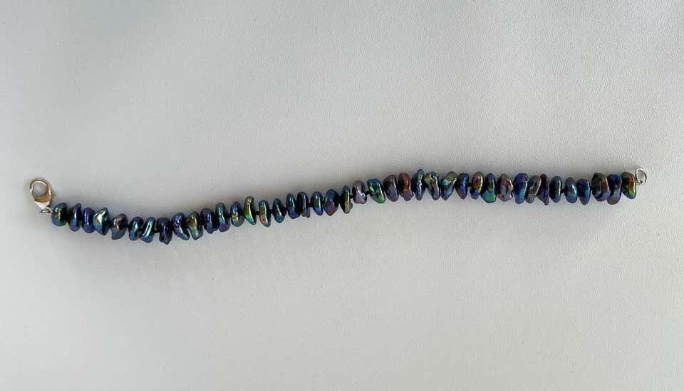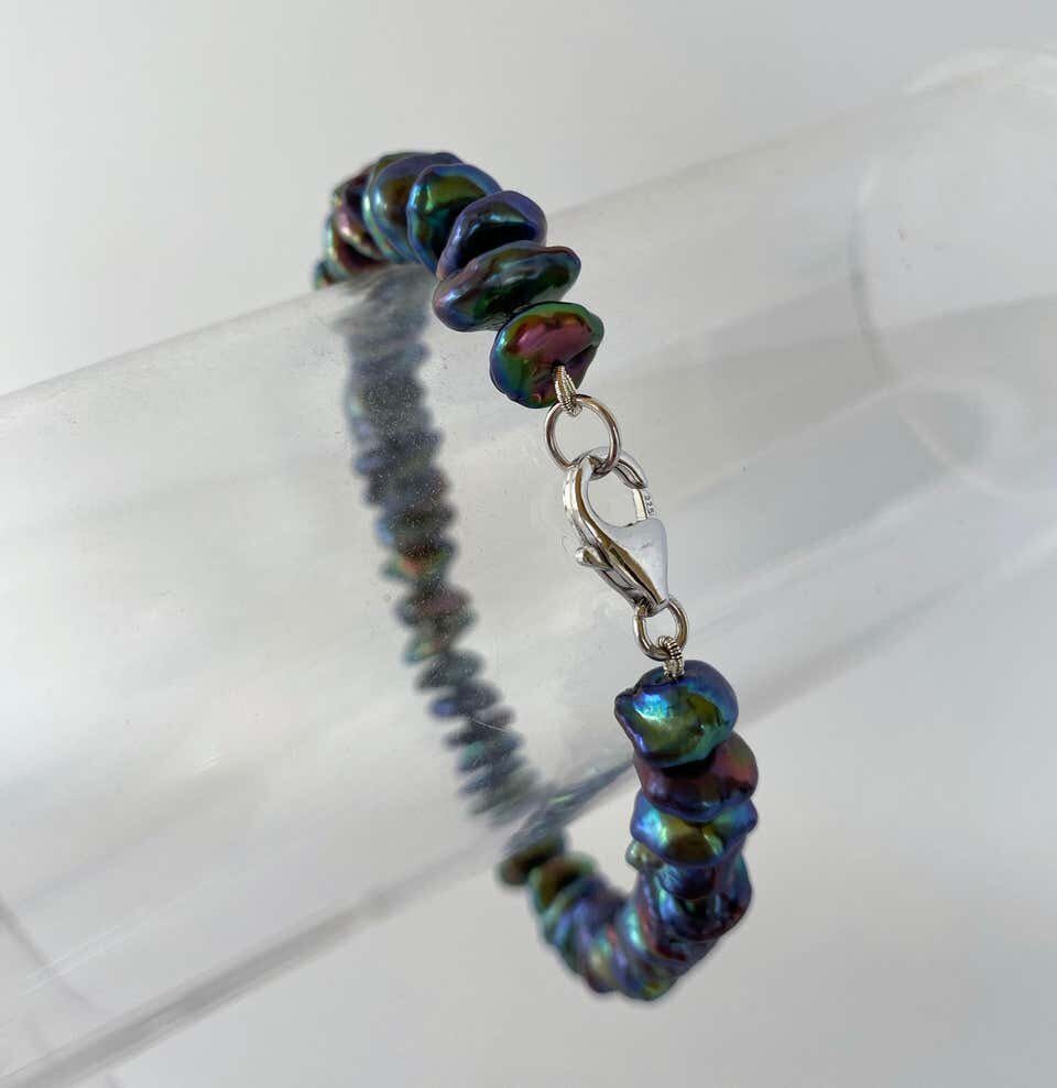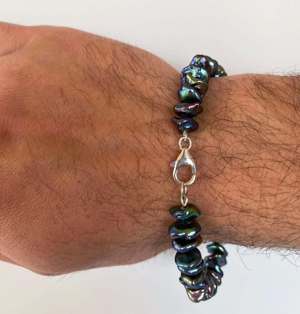 This amazing bracelet features irregularly shaped Black Pearl beads meeting at a Sterling Silver, Rhodium Plated clasp. These Pearls offer a gorgeous iridescent oil spill / peacock colored sheen. This bracelet is a perfect compliment to any professional or casual attire. Measuring at 8.75 inches, this bracelet sits comfortably and boldly on the wrist. Double knotted for security and aesthetics. **All jewelry is handmade by designer for any custom sizing, color, material, or any other requests, please contact Marina J. Price may vary accordingly.**