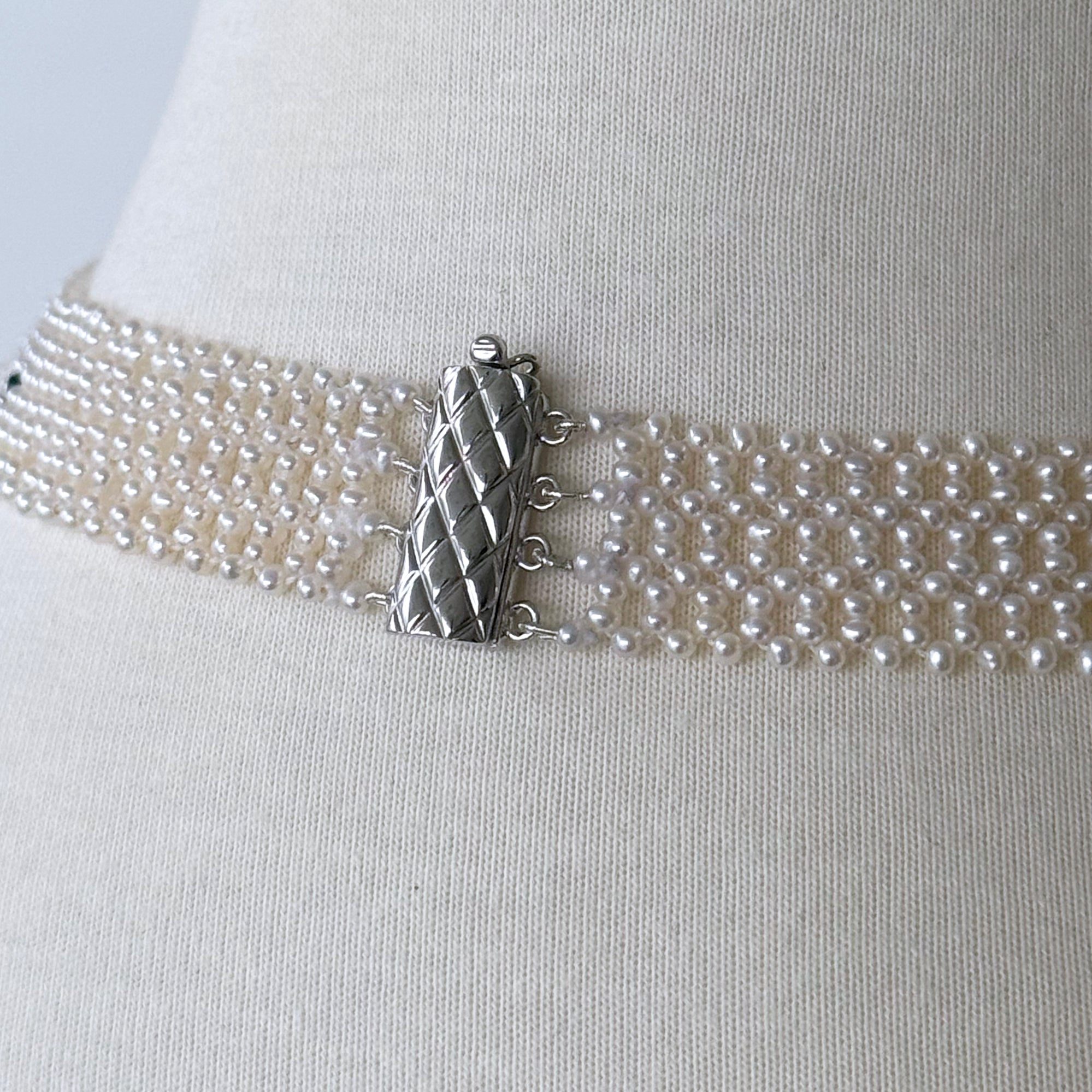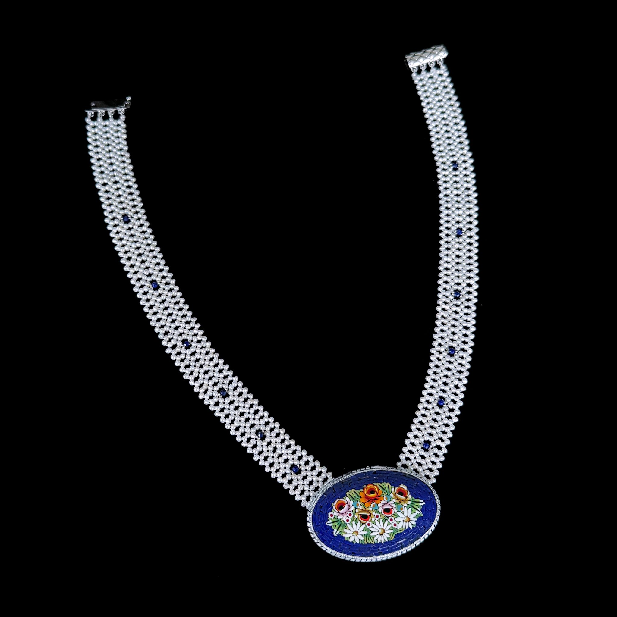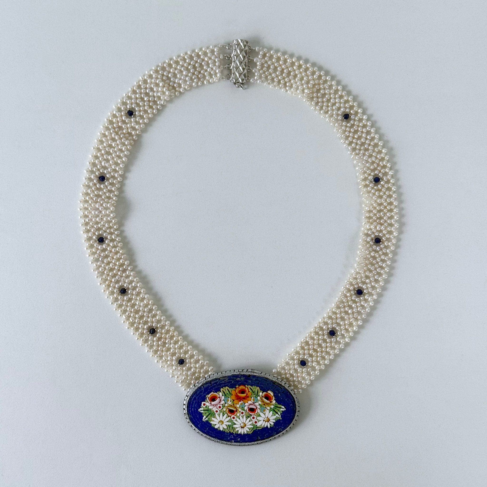 Stunning One Of A Kind Necklace by Marina J.This piece is made with all Seed Pearls and Faceted Lapis Lazuli woven together into a beautiful lace like design. Measuring 17 inches long, this Necklace meets at a Rhodium Plated Decorative Silver Sliding Clasp. A Vintage Blue Mosaic Brooch has been reworked into the Centerpiece for this Necklace, featuring a gorgeous detailed Floral motif. The Lapis Lazuli in this piece perfectly match the Floral Mosaic, making it pop. An amazing piece for any formal or Bridal occasion.