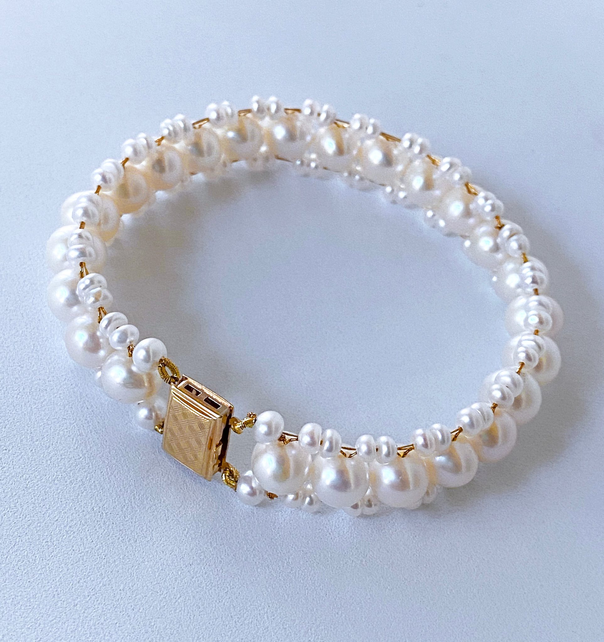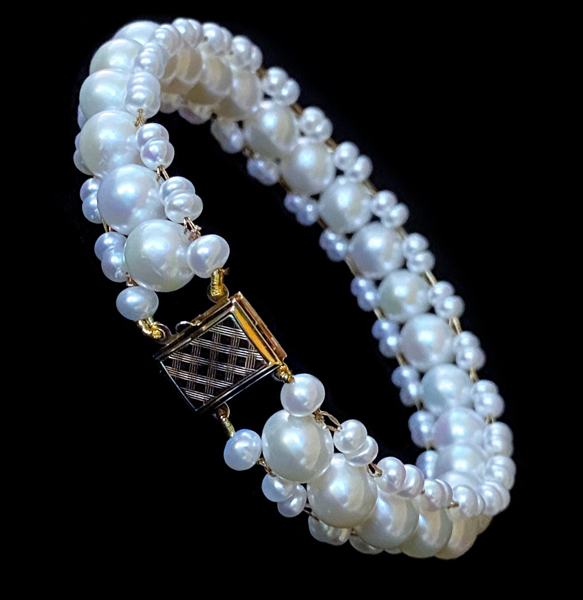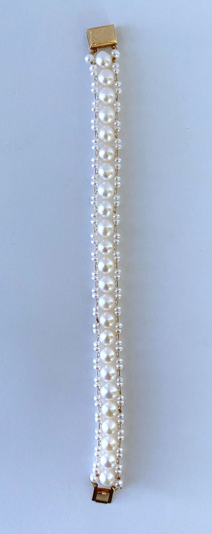 Gorgeous, simple and elegant piece by Marina J. This Bracelet is made of all cultured white Pearls with a soft iridescent luster. Gold thread is used to weave the Pearls into a column like design, which perfectly matches the Pearls’ luster and sheen. Measuring 7 inches long, this bracelet meets at a solid 14k Yellow Gold Decorative sliding Clasp. The Box Clasp perfectly matches the gold thread used within this piece, giving this Bracelet a regal feel. Perfect for any Bridal, Wedding or Formal occasion