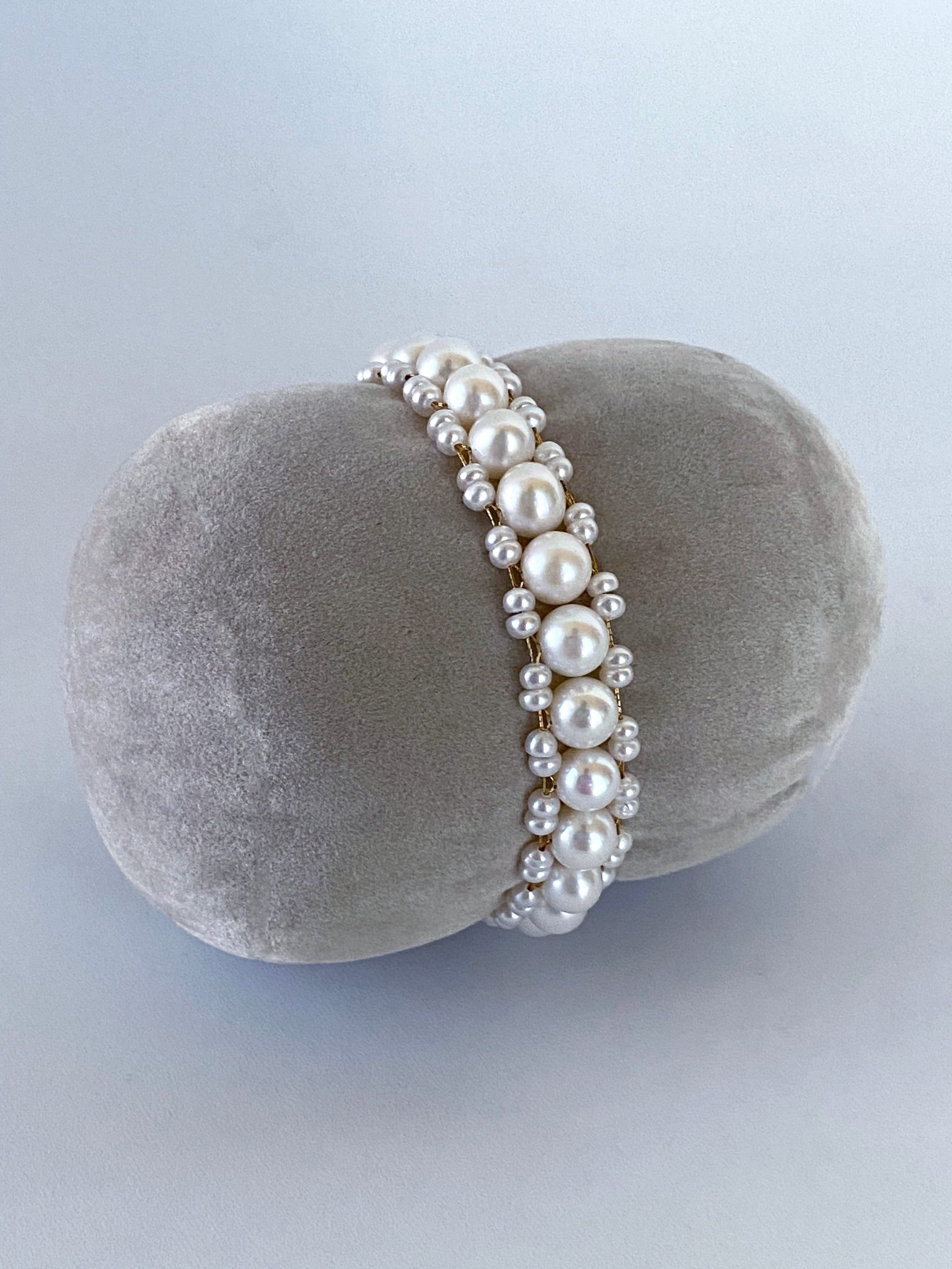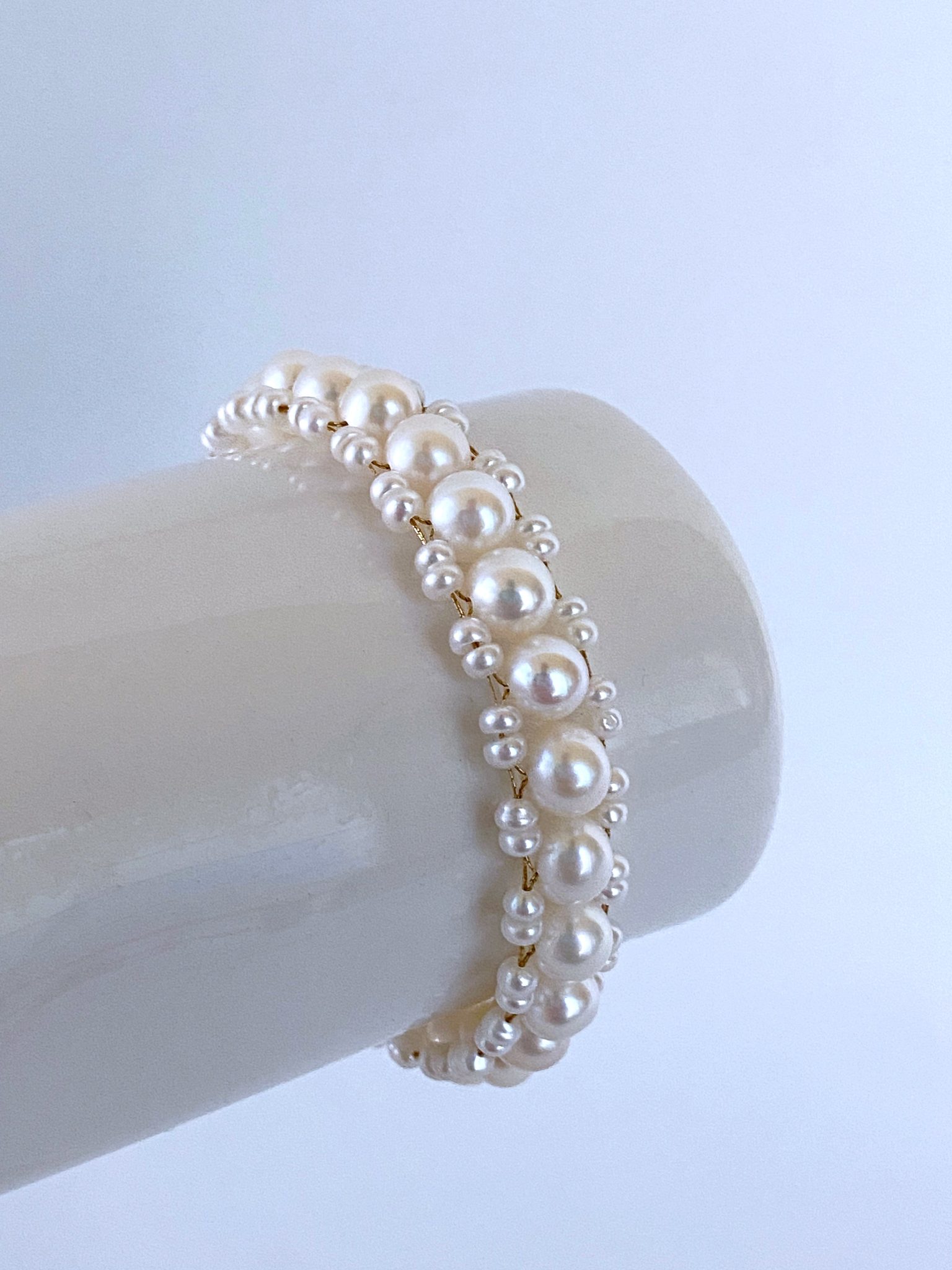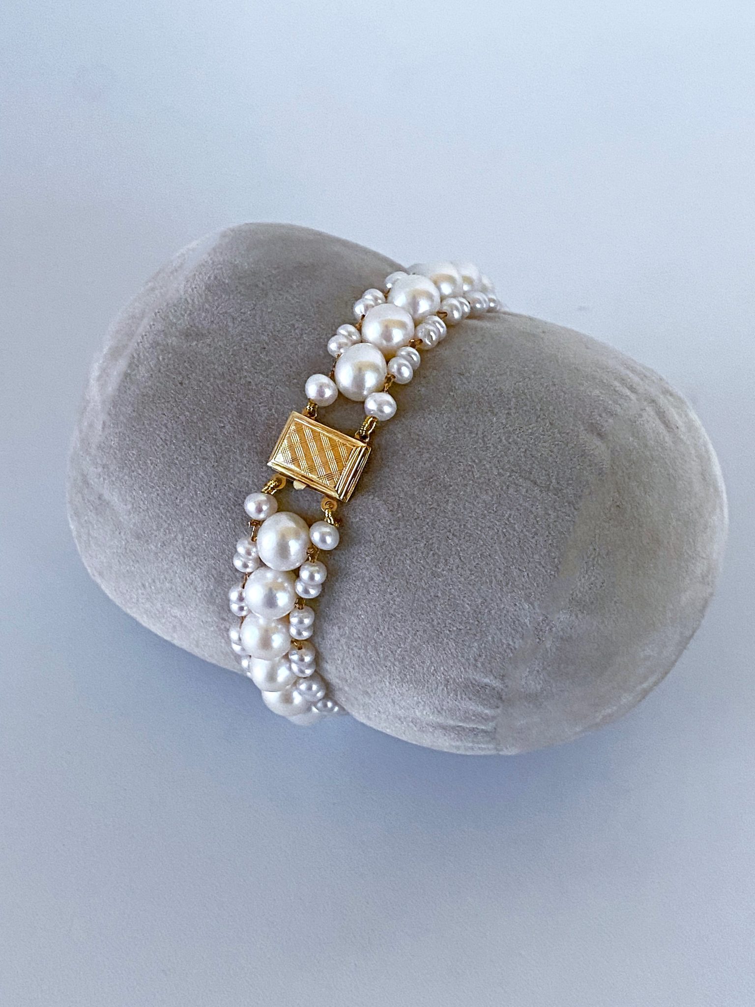 Gorgeous, simple and elegant piece by Marina J. This Bracelet is made of all cultured white Pearls with a soft iridescent luster. Gold thread is used to weave the Pearls into a column like design, which perfectly matches the Pearls’ luster and sheen. Measuring 7 inches long, this bracelet meets at a solid 14k Yellow Gold Decorative sliding Clasp. The Box Clasp perfectly matches the gold thread used within this piece, giving this Bracelet a regal feel. Perfect for any Bridal, Wedding or Formal occasion