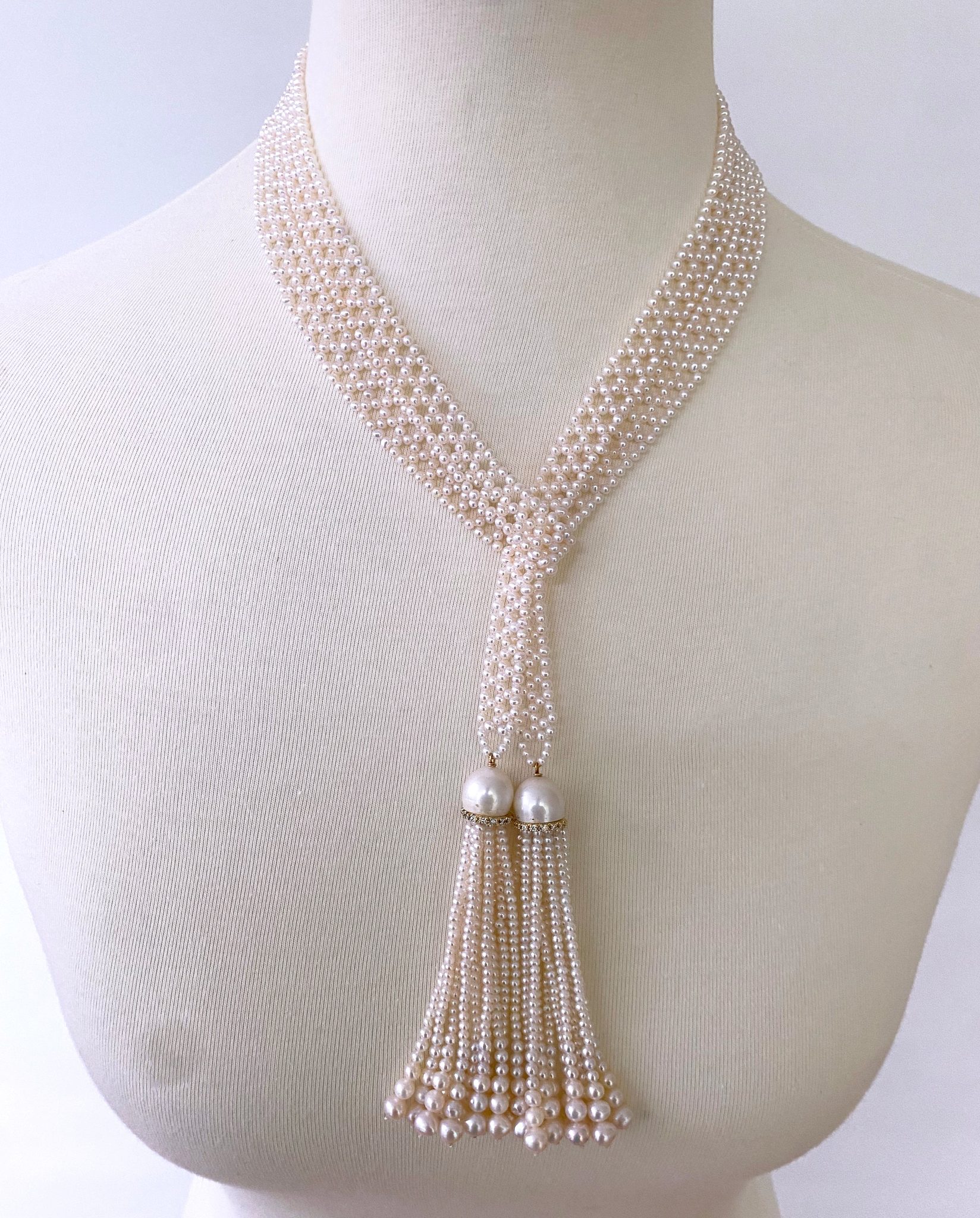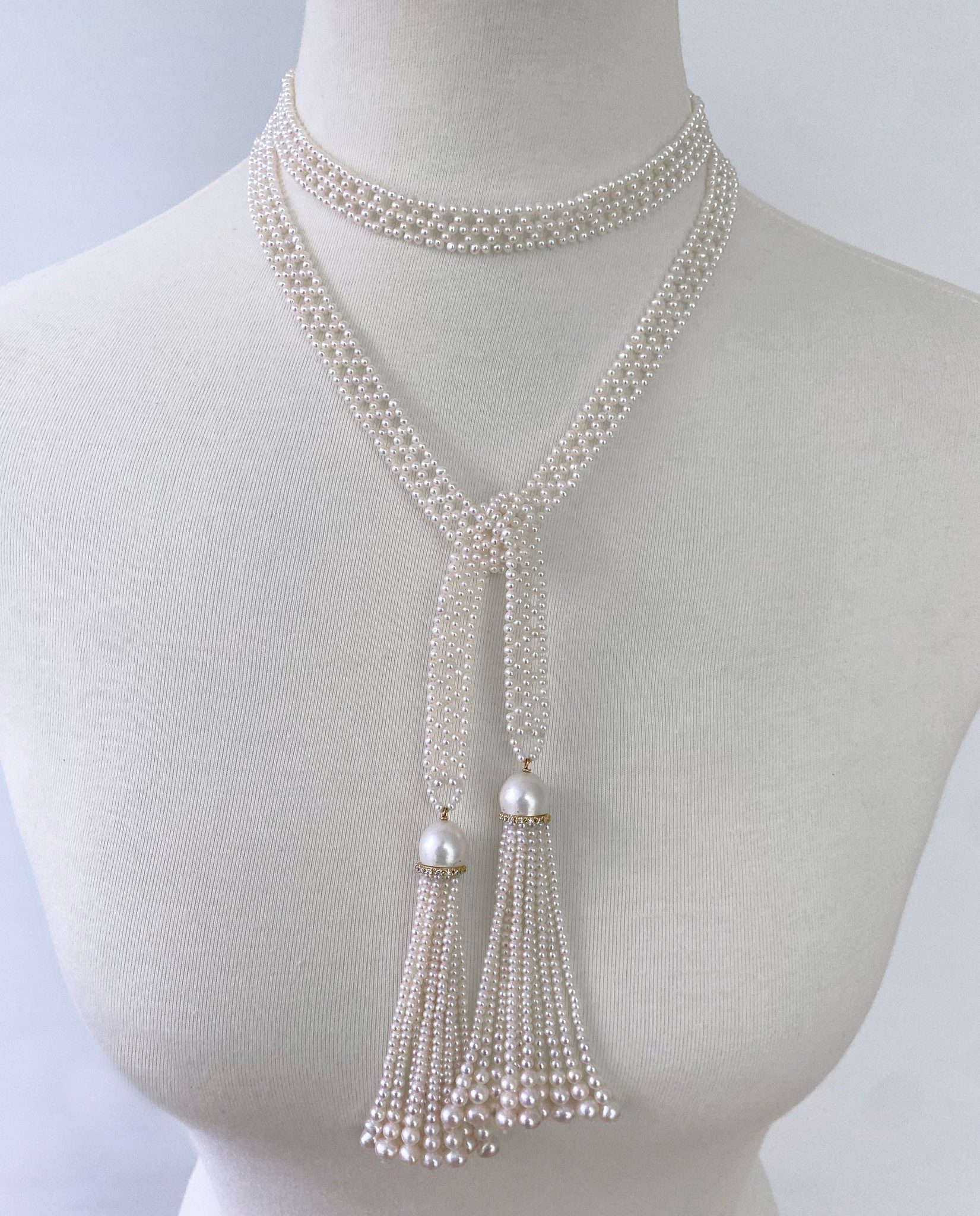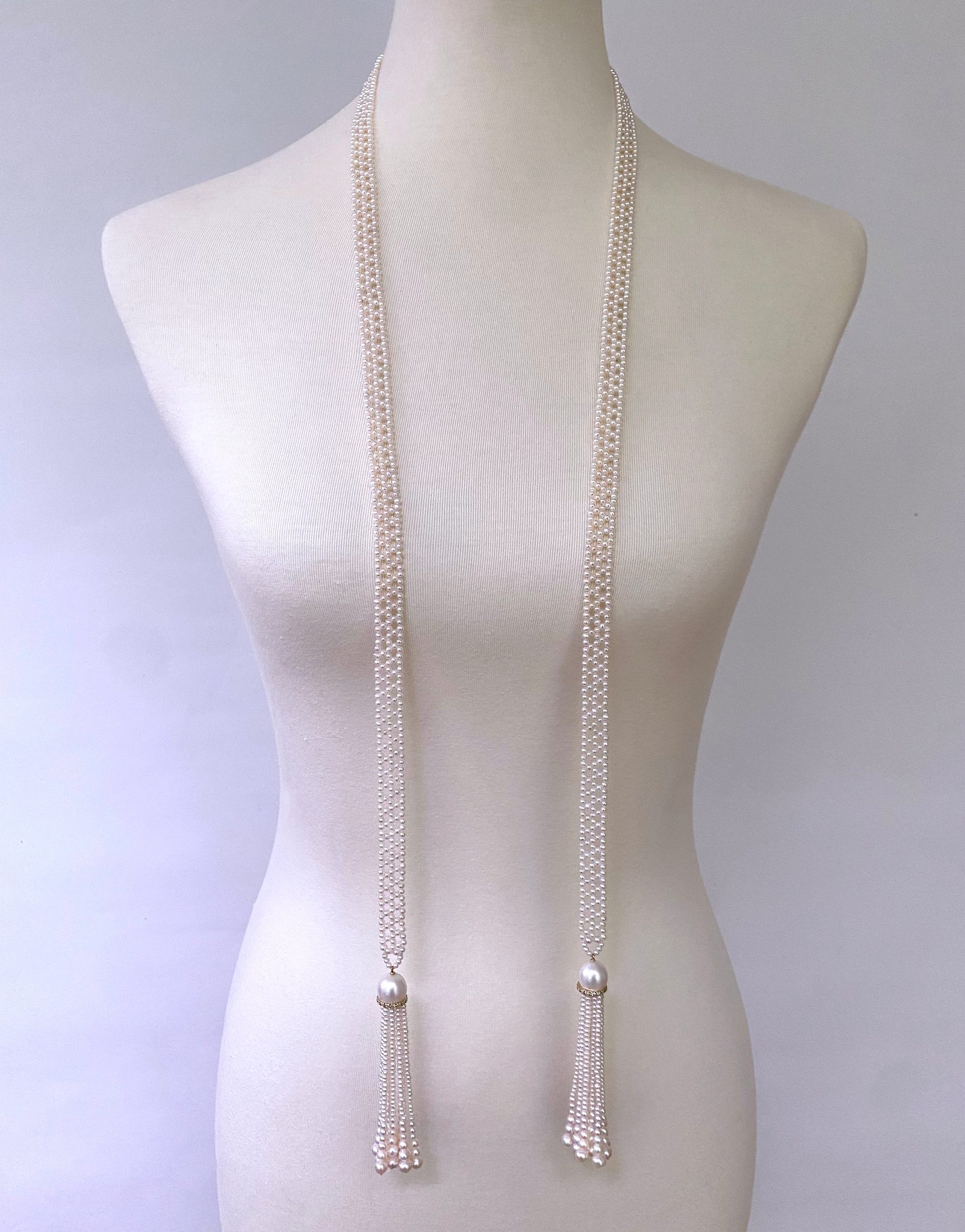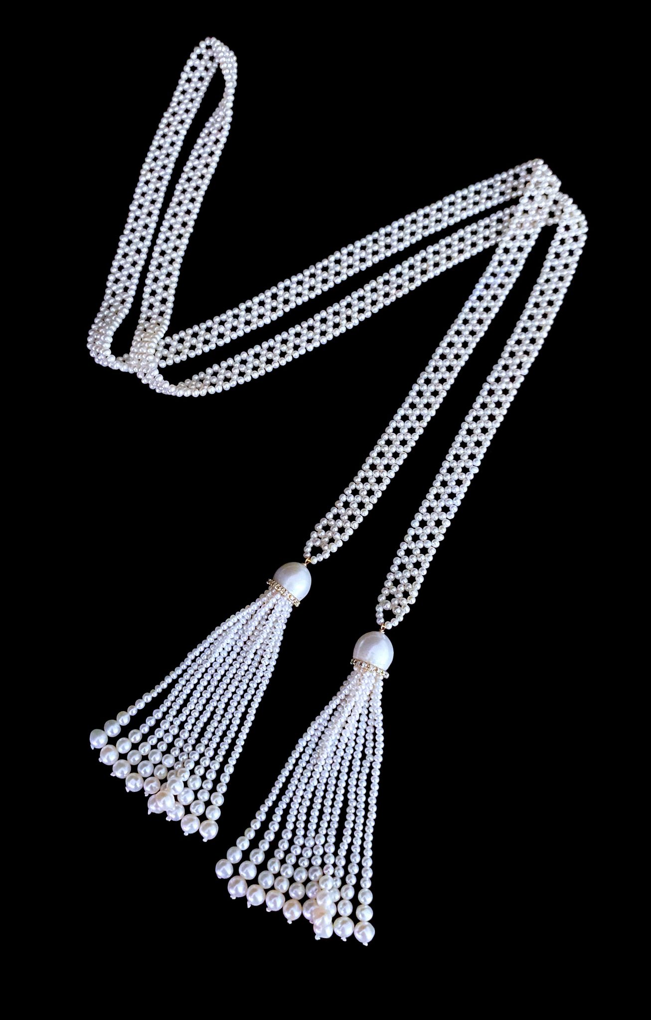Beautiful and elegant sizzles Sautoir by Marina J. This Sautoir features perfect seed Pearls all intricately woven together into a fine lace like design. Measuring 42 inches long sans Tassels, this Sautoir is easily worn in multiple fashions, as shown in images, due to its versatility. Both ends of this Sautoir meet at a 3.5 inch Tassel which features a gorgeous round Pearl displaying a soft iridescent luster, sitting atop a solid 14k Yellow Gold Diamond Encrusted roundel – from which slightly Graduated Strands of Pearls hang. This piece is made entirely of Pearls and solid 14k Yellow Gold, all hand Perfect or any Bridal or formal occasion!