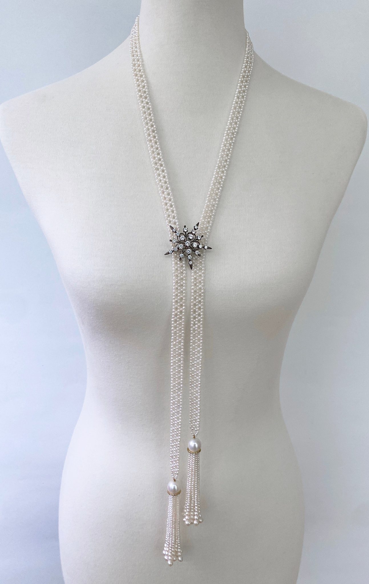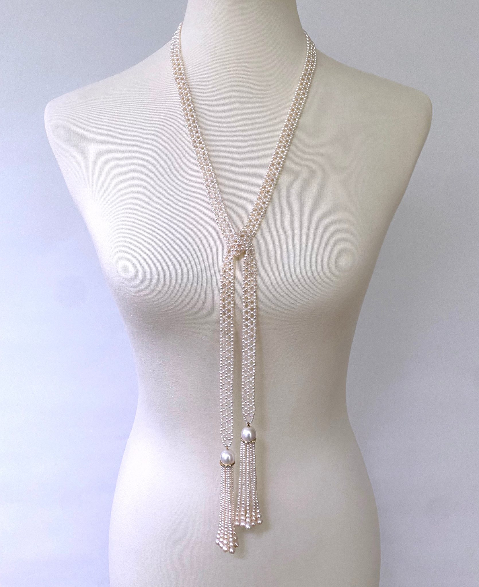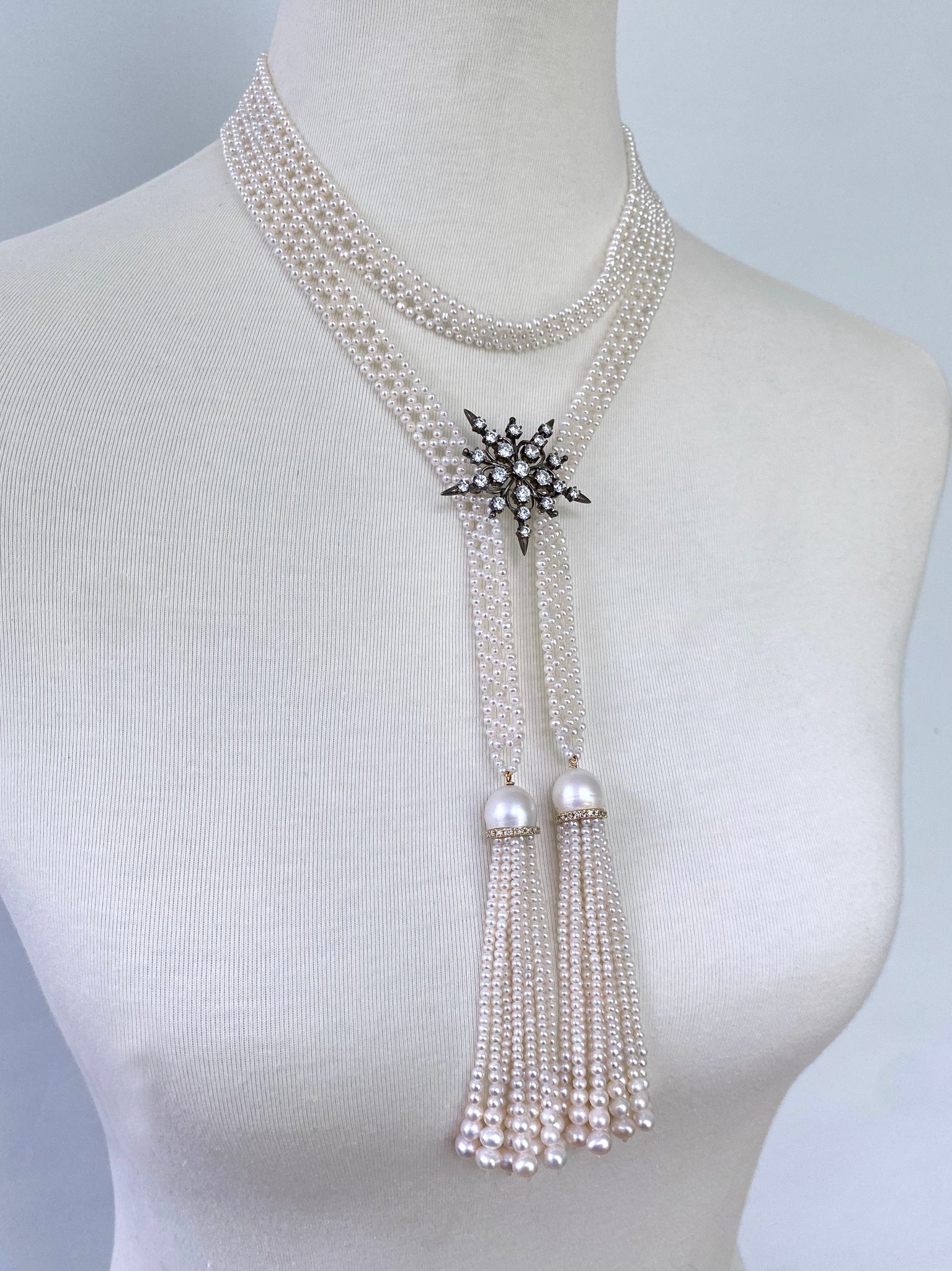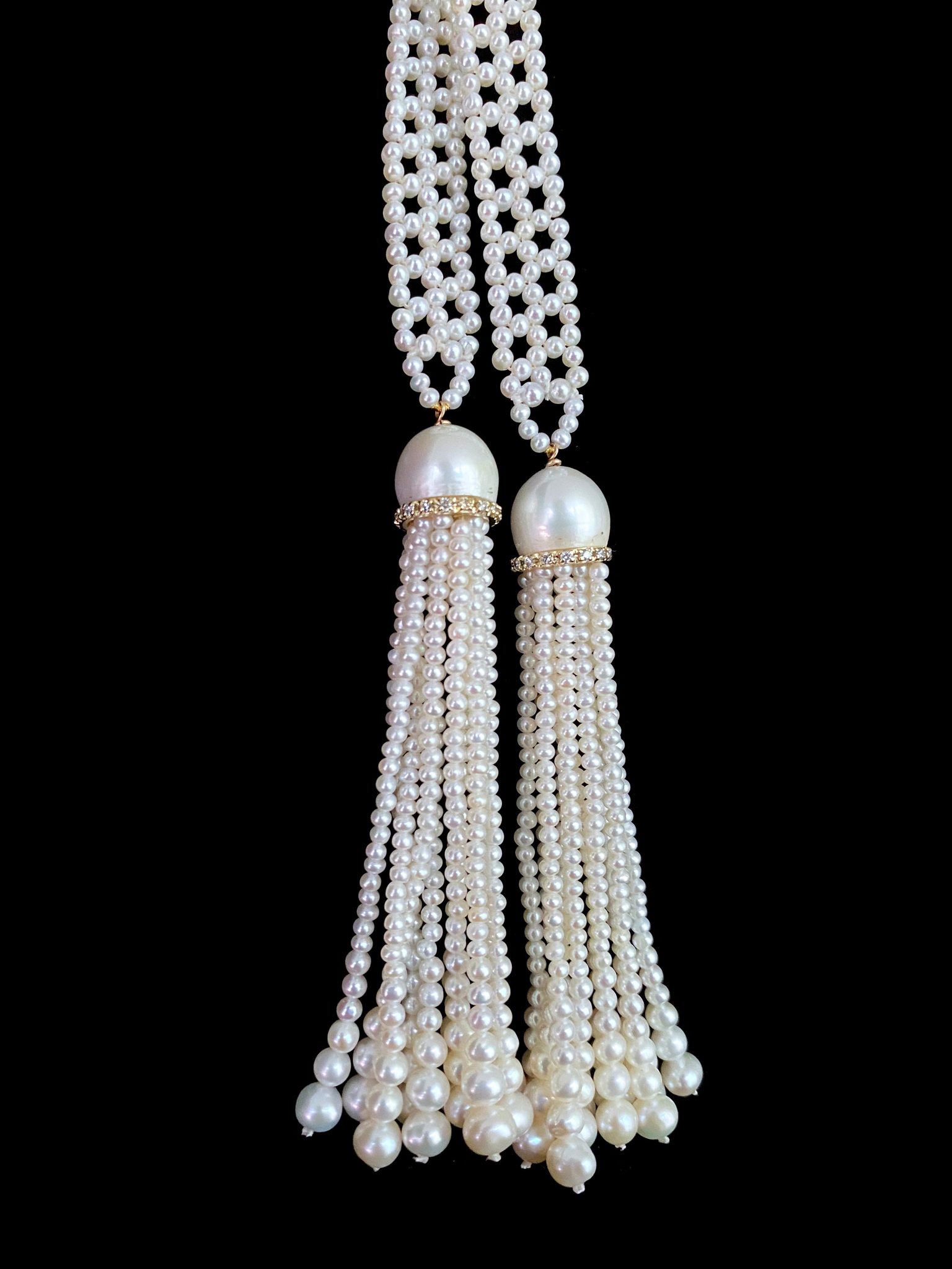 Beautiful and elegant sizzles Sautoir by Marina J. This Sautoir features perfect seed Pearls all intricately woven together into a fine lace like design. Measuring 42 inches long sans Tassels, this Sautoir is easily worn in multiple fashions, as shown in images, due to its versatility. Both ends of this Sautoir meet at a 3.5 inch Tassel which features a gorgeous round Pearl displaying a soft iridescent luster, sitting atop a solid 14k Yellow Gold Diamond Encrusted roundel – from which slightly Graduated Strands of Pearls hang. This piece is made entirely of Pearls and solid 14k Yellow Gold, all hand Perfect or any Bridal or formal occasion!