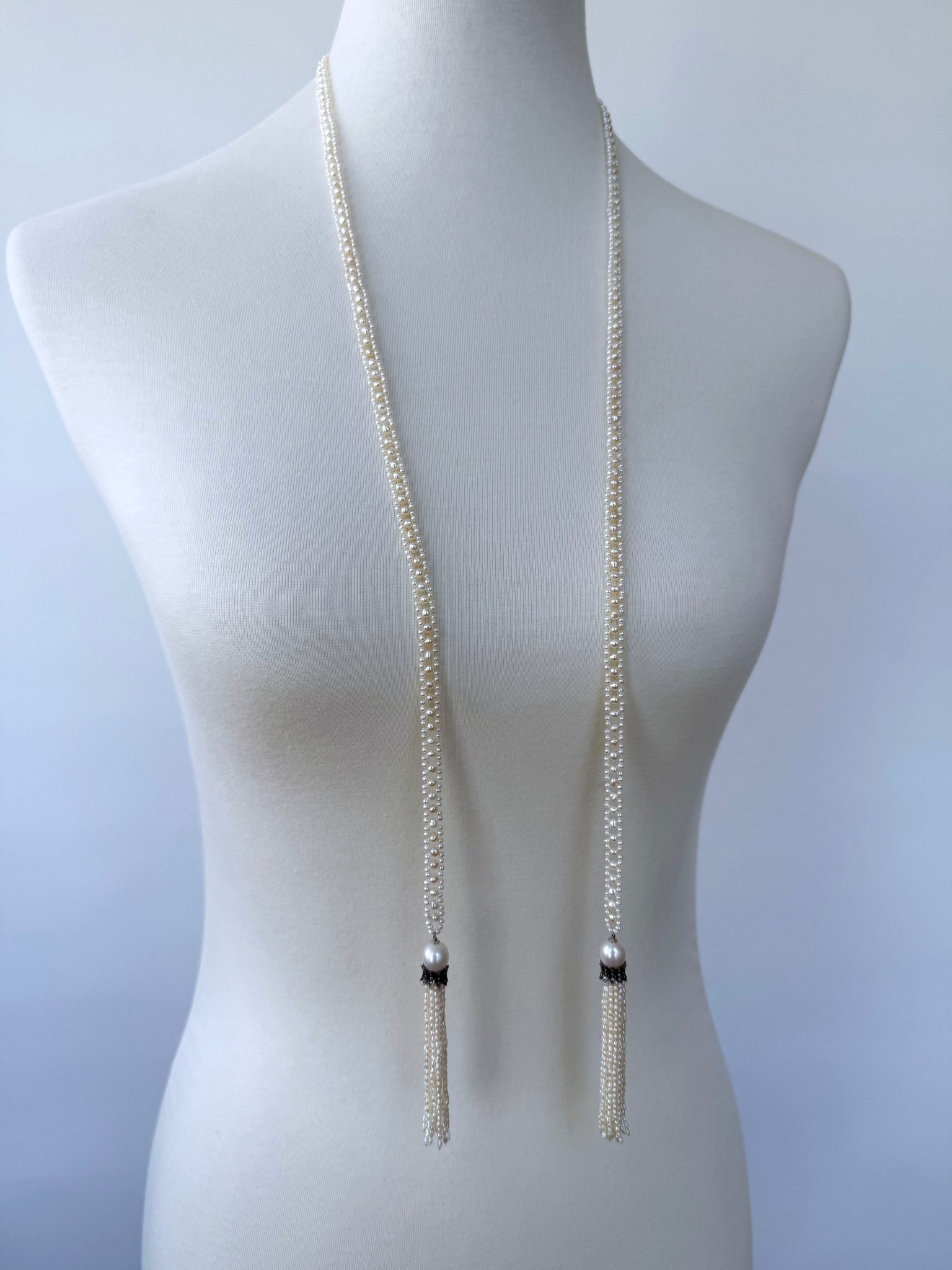 Be the first to review “Slender Pearl Woven Sautoir with Diamond Encrusted Silver Tassels”