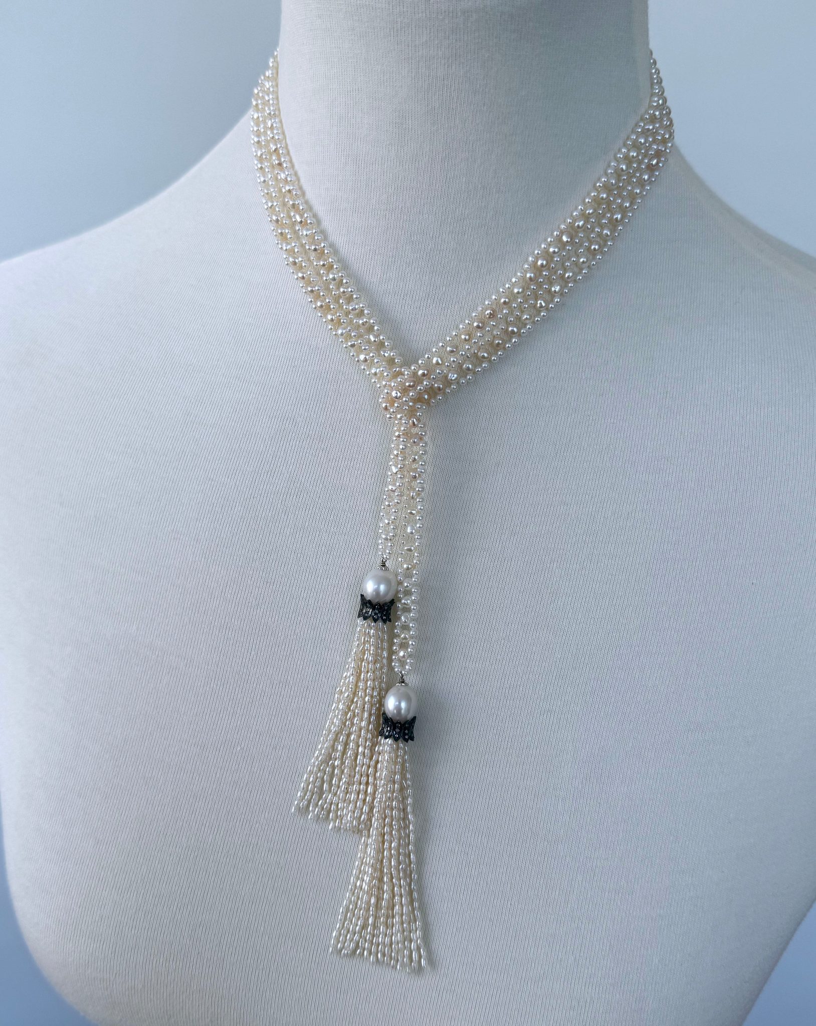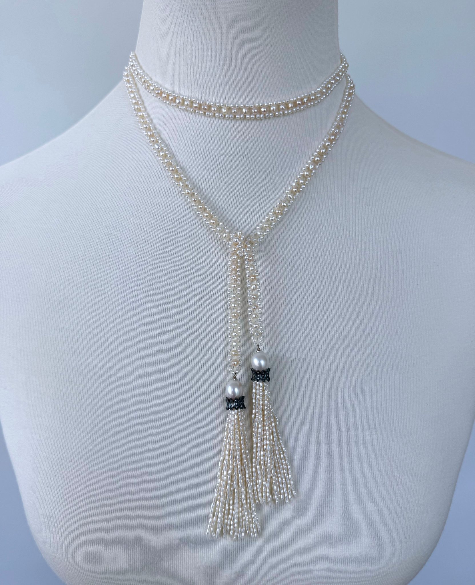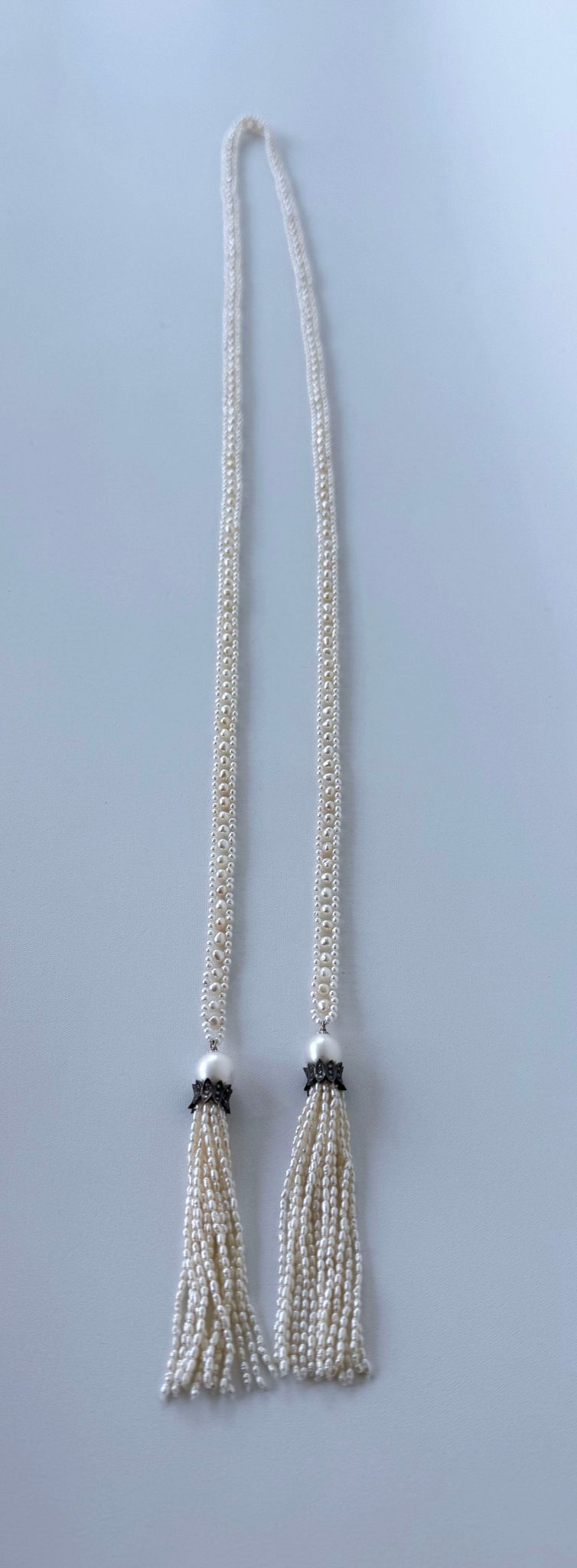 Classic Lace woven Pearl Sautoir by Marina J.This specific Sautoir is woven with all Seed Pearls allowing it to have a dainty and delicate look while maintaining its strength and durability. Measuring 0.25 inches wide and 36 inches long sans Tassels, both ends of this Sautoir meet at 3 inch long Tassels. The Tassels display round Pearls sitting atop decorative Diamond encrusted Silver roundels from which multiple strands of Seed Pearls hang.An exquisite statement piece that is subtle, elegant and beautiful. Perfect for any Bridal or formal event.