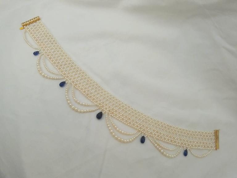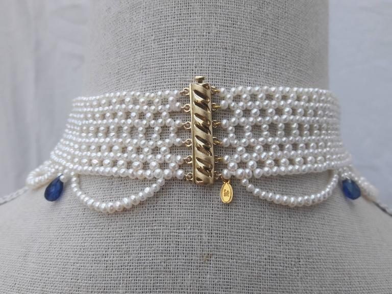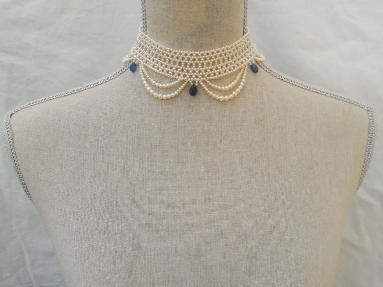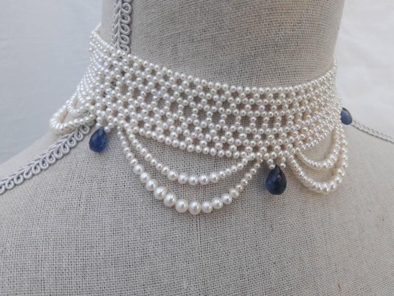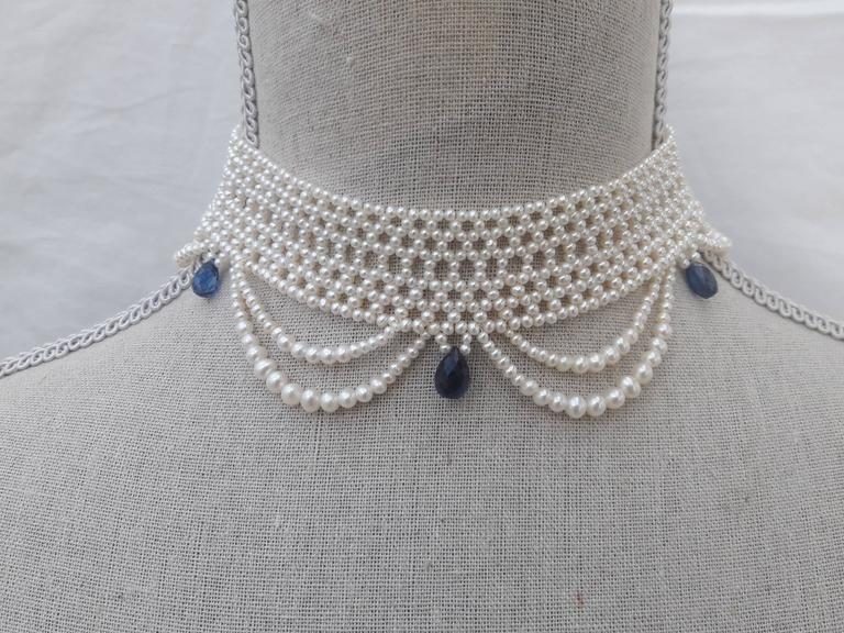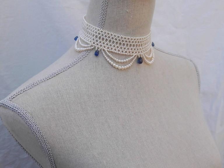 2.5 – 3 mm cultured pearls are intricately hand woven to create a delicate lace-like design. Choker is tapered in design to fit along the curve of the neckline. Clasp is made of 14 K yellow gold plate over sterling silver, and slides very smoothly sits low profile. This romantic, and delicate necklace is perfect for bridal any special occasion. The graduated drapes create an ethereal effect giving the necklace a lightness as it hangs from the neckline. Pearls are carefully selected to create a graduated and harmonious look. The piece is accented with five, faceted teardrop Kyanite briolettes that are graduated in size, largest towards the center. Choker measures 13.375 inches in length All Marina Handmade Pearl and Precious Bead Jewels can be made to order at your size and customized at your request.
