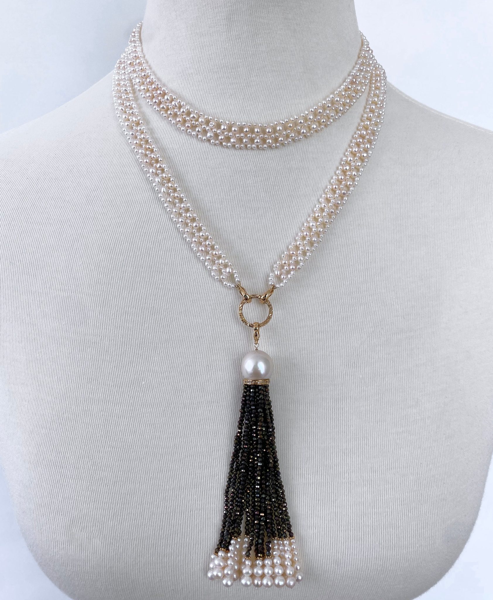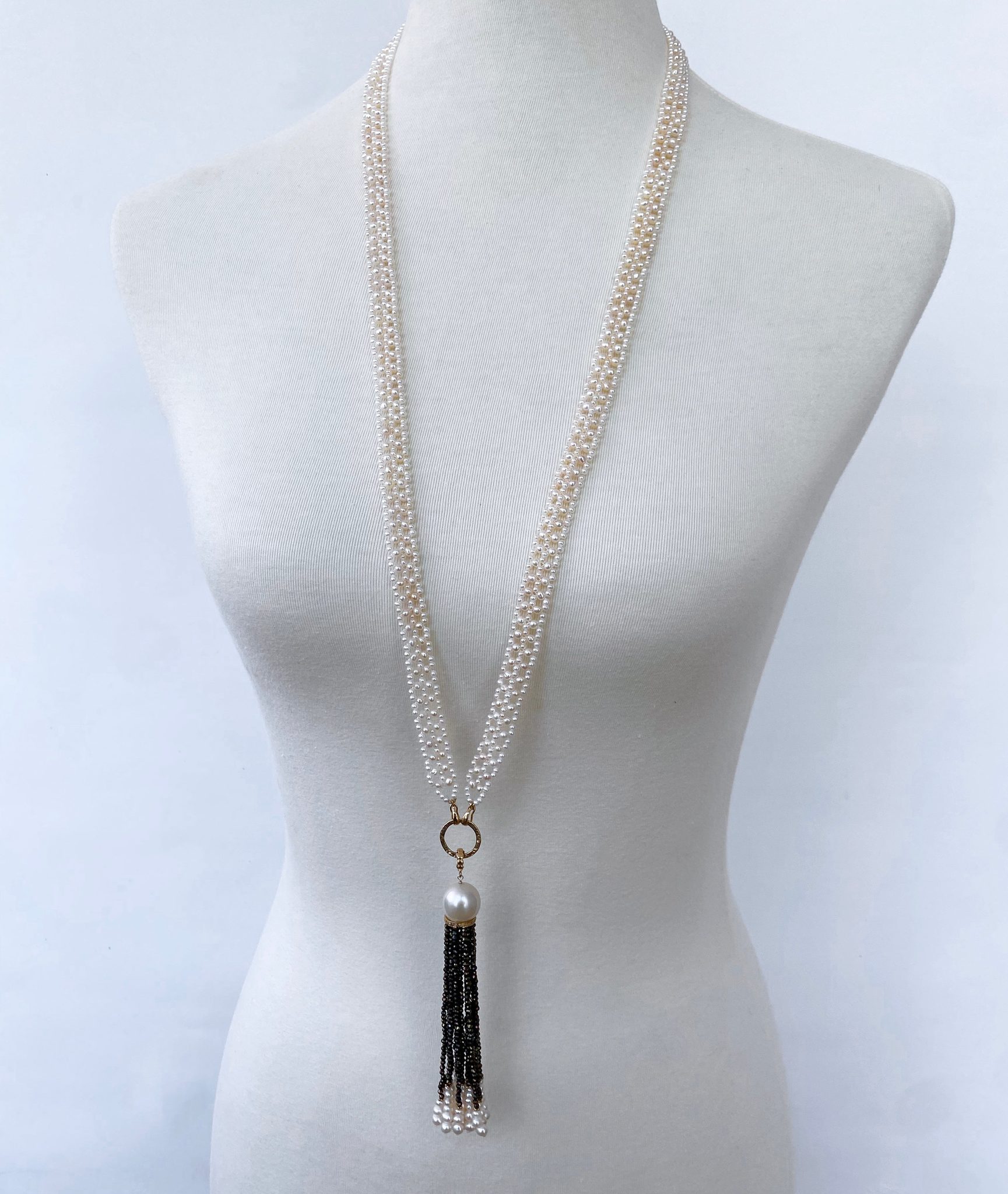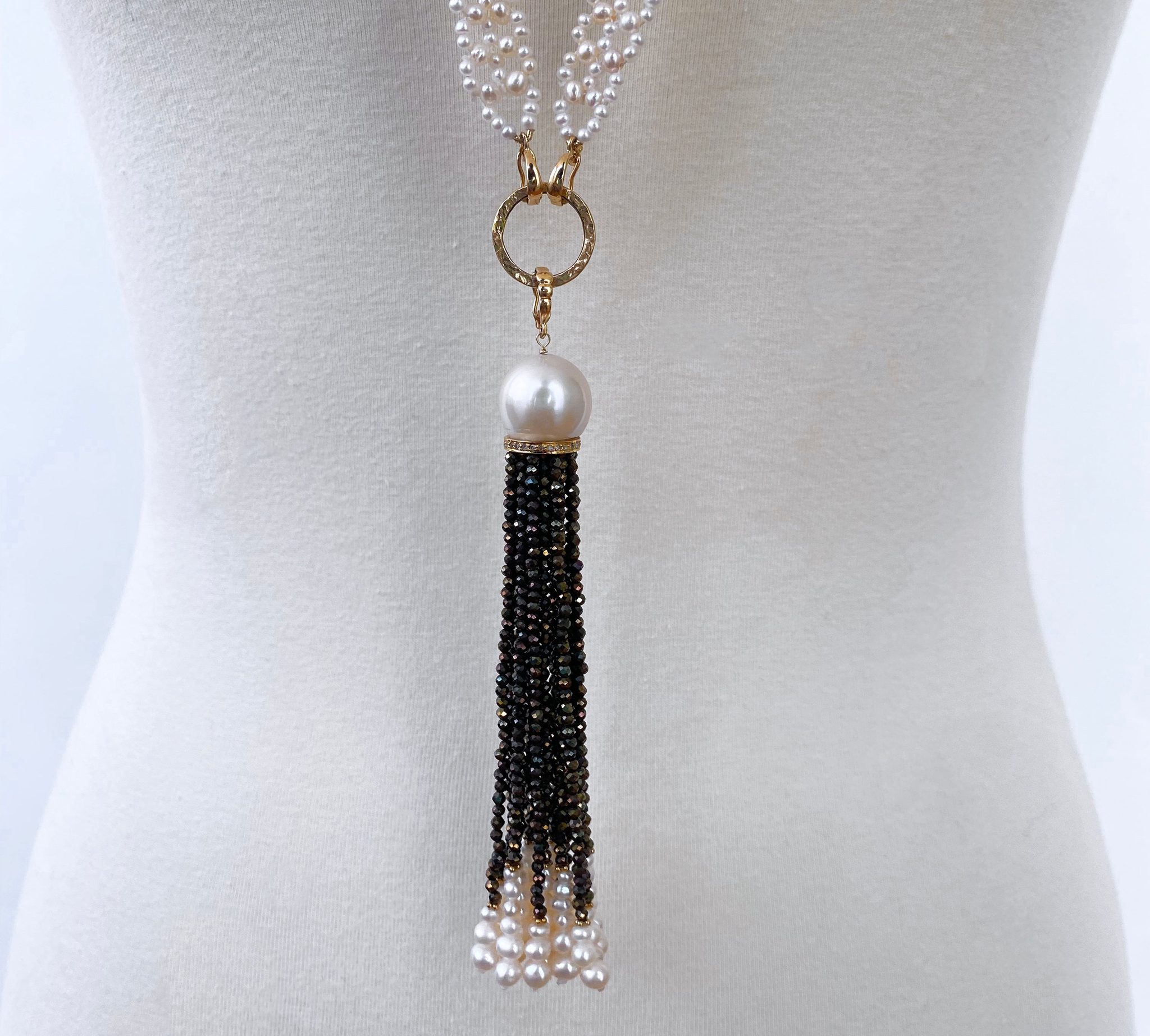 A stunning and dramatic, removable 4.5 inch Tassel hangs from the textured solid 14k Yellow Gold ring. The Tassel is made of a large White Pearl sitting atop a Diamond encrusted, Yellow Gold plated Silver roundel – from which multiple strands of graduating Black Spinel, solid 14k Yellow Gold beads and Pearls hang. The faceted Black Spinel displays beautiful flashes of warn colors that perfectly compliment the 14k Yellow Gold in this piece.