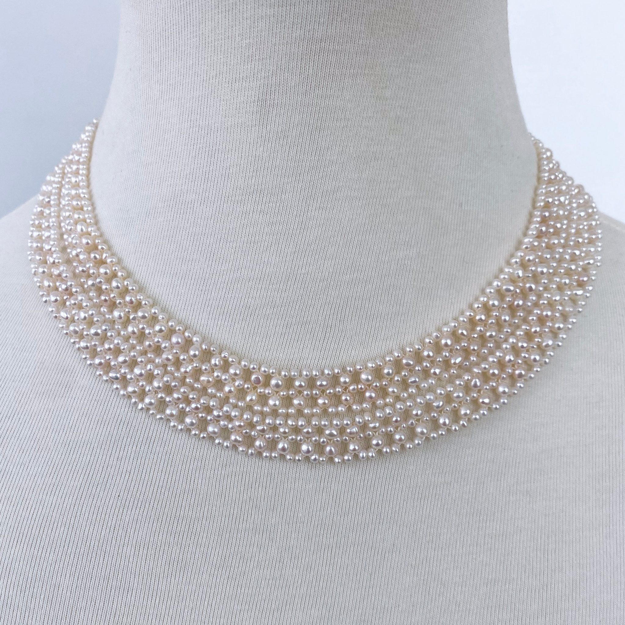 Classic Sautoir by Marina J. This piece is made using all Seed Pearls intricately woven together into a fine double column Lace like design. Measuring 35 inches long sans Tassel, both ends of this sautoir meet at solid 14k Yellow Gold Latches which hook onto a textured solid 14k Yellow Gold Ring. Due to its length, this Sautoir can be worn in multiple fashions, as shown in photos.