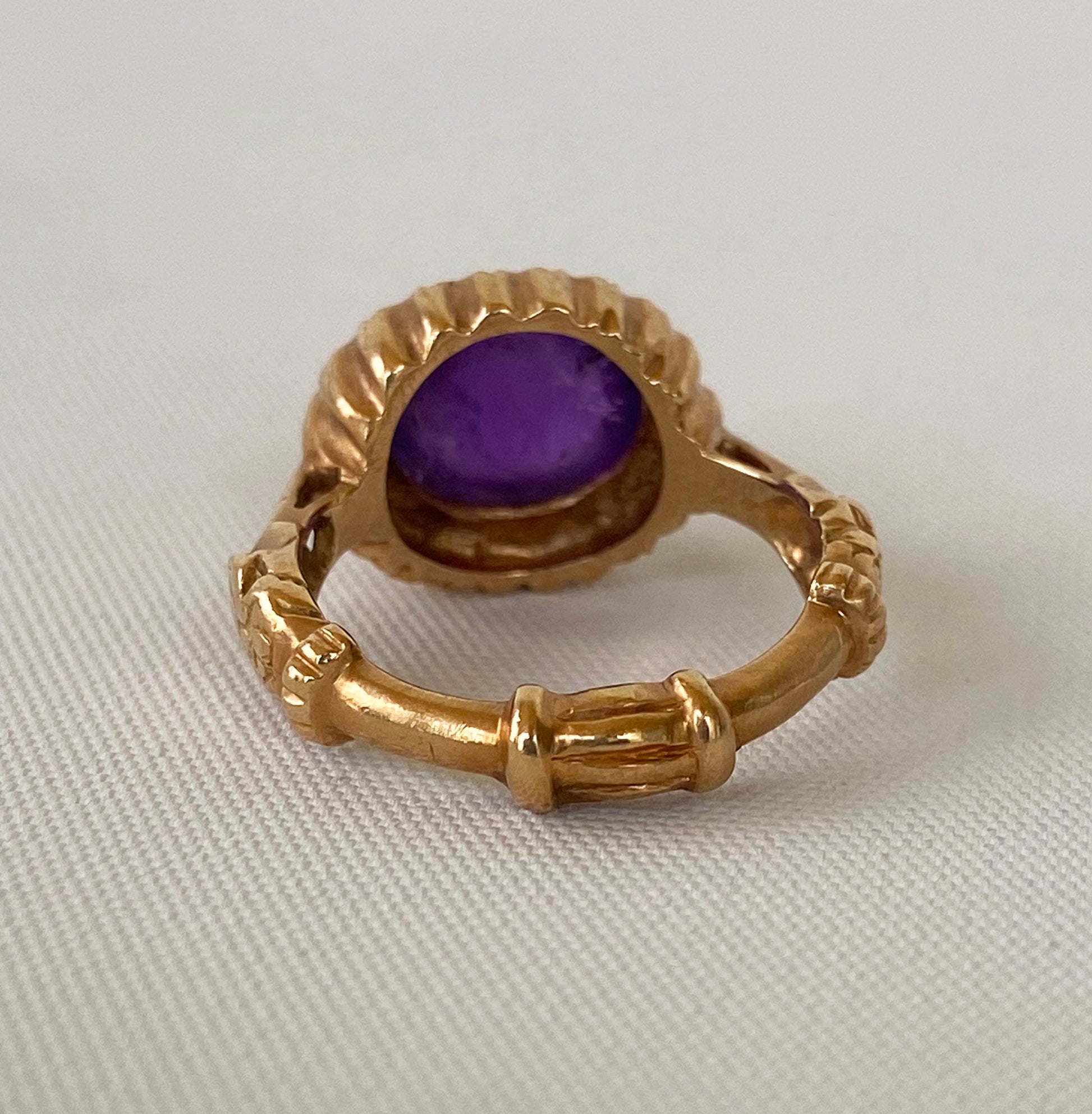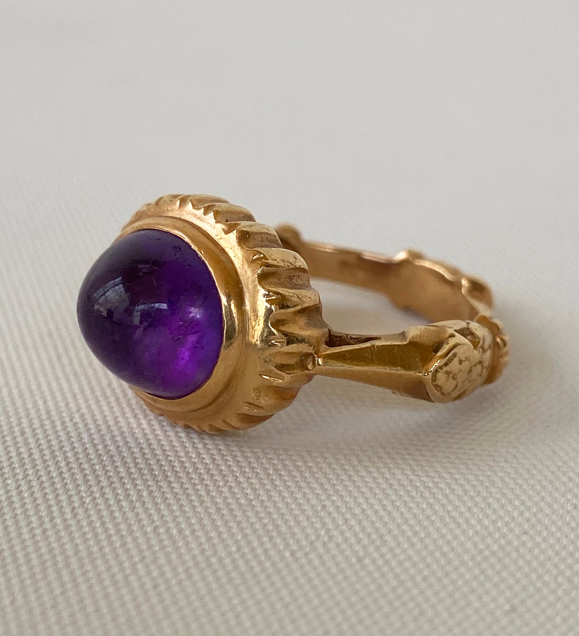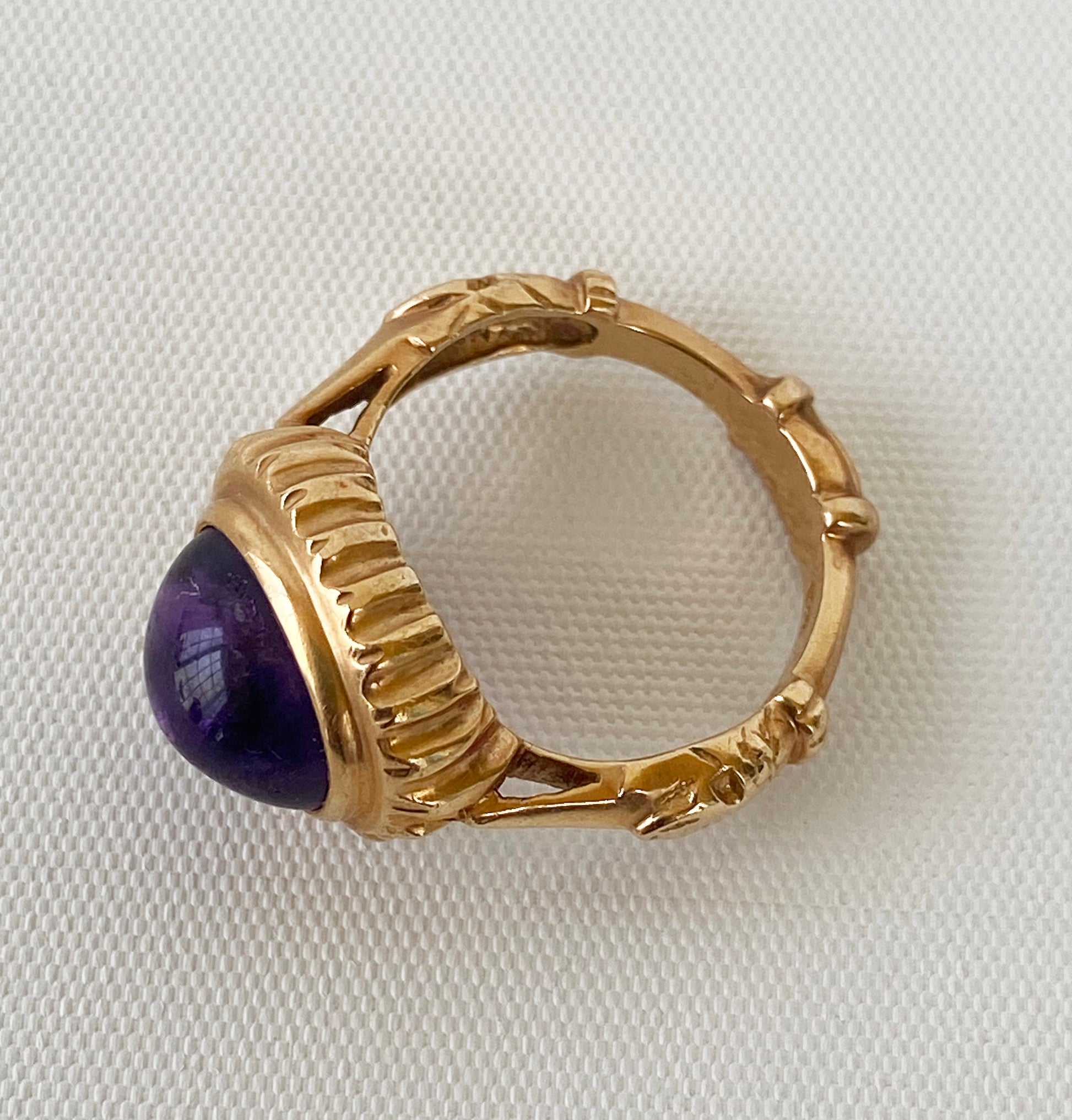 Unique and elegant custom ring by Marina J. This amazing decorative ring is cast with all solid 14k Yellow Gold and stamped as so on inside the band. This ring features a stunning dome shaped Amethyst that is bezel set into the sun like centerpiece. The semi translucency of the Amethyst allows it to radiant brilliant purple tones when hit with light, perfectly complimenting the Gold. Sized at a women's 7.5, this ring is the perfect piece for any lover of fine and decorative jewelry.