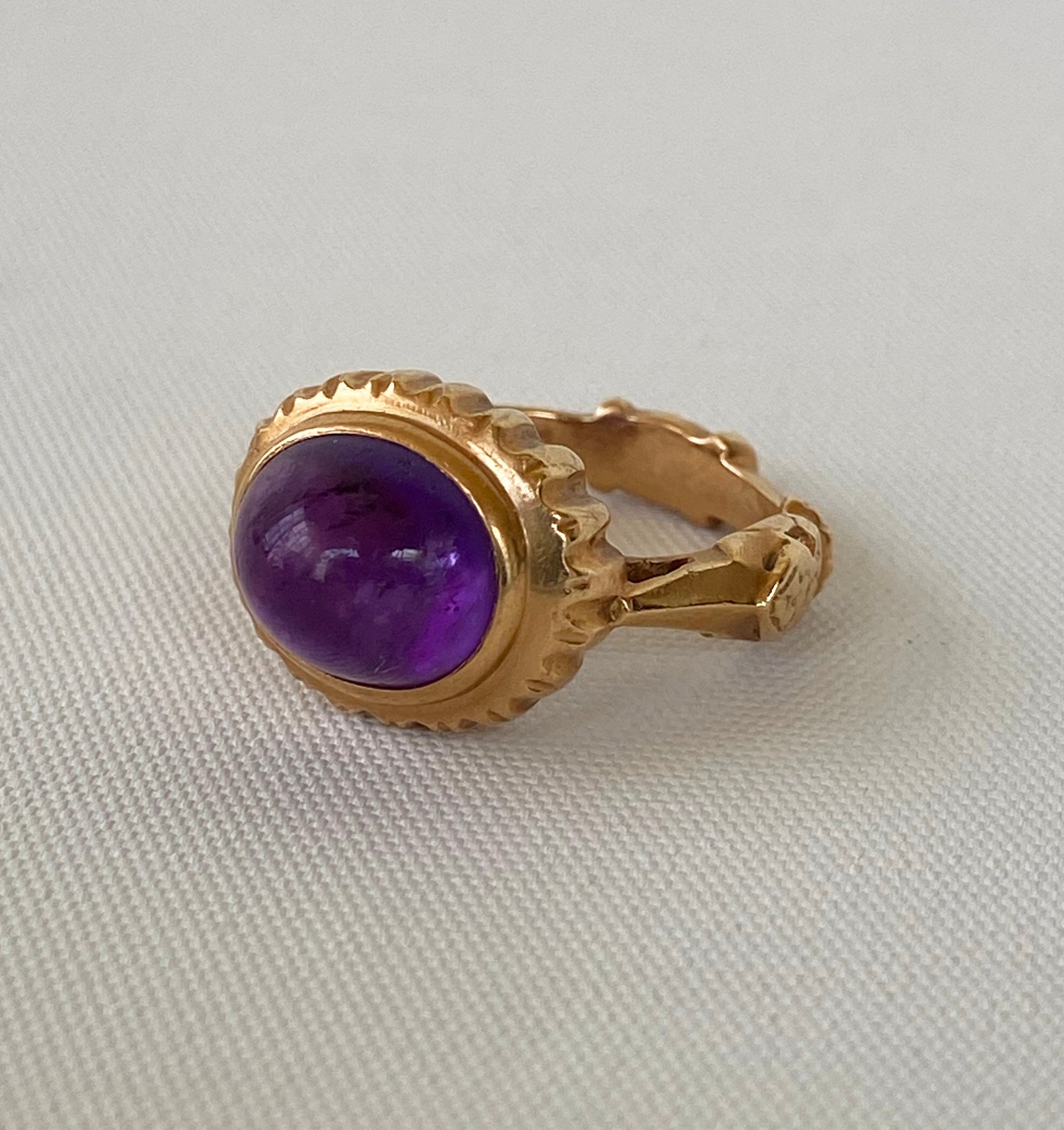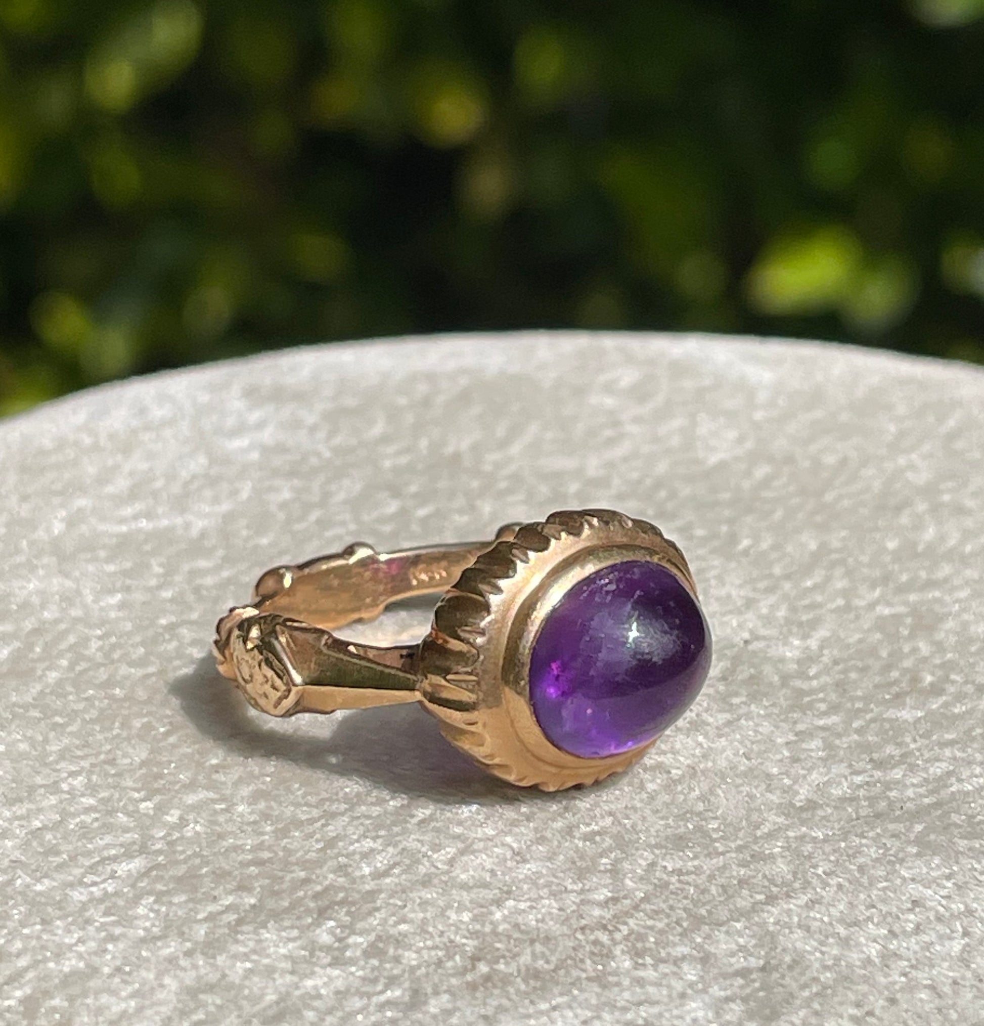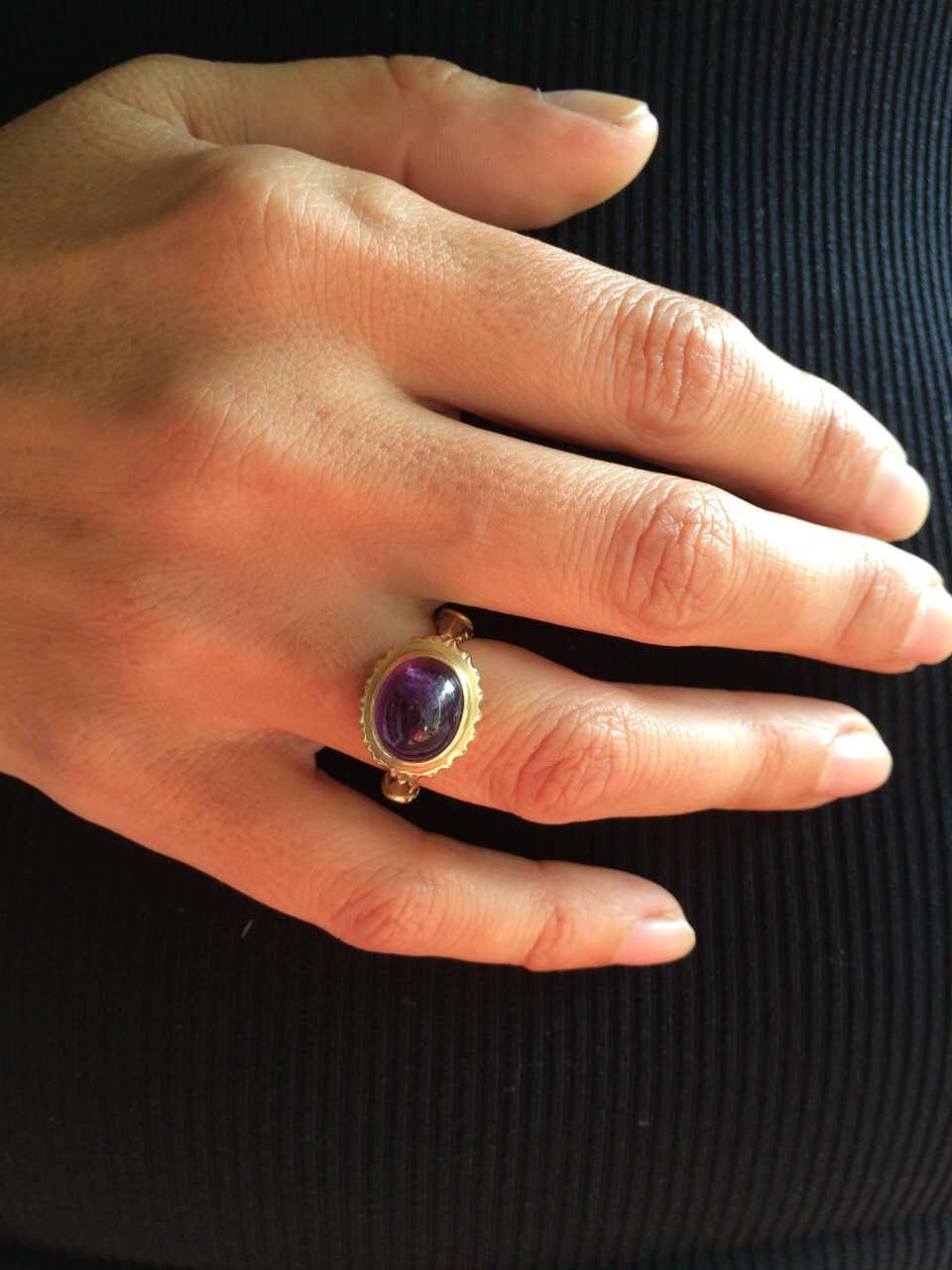 Unique and elegant custom ring by Marina J. This amazing decorative ring is cast with all solid 14k Yellow Gold and stamped as so on inside the band. This ring features a stunning dome shaped Amethyst that is bezel set into the sun like centerpiece. The semi translucency of the Amethyst allows it to radiant brilliant purple tones when hit with light, perfectly complimenting the Gold. Sized at a women's 7.5, this ring is the perfect piece for any lover of fine and decorative jewelry.
