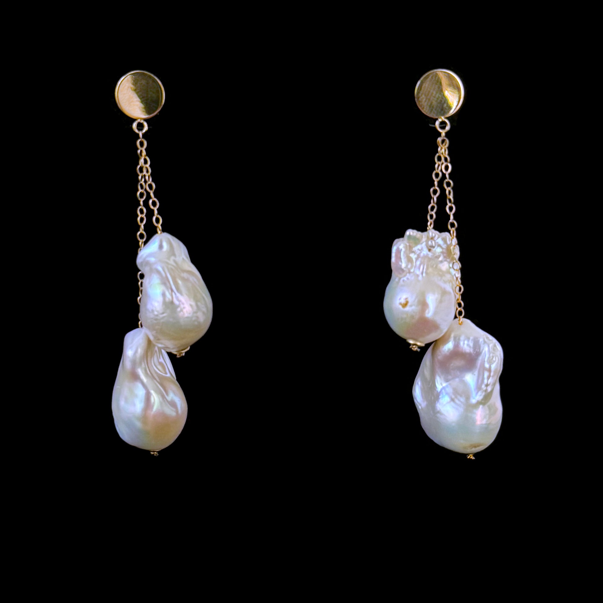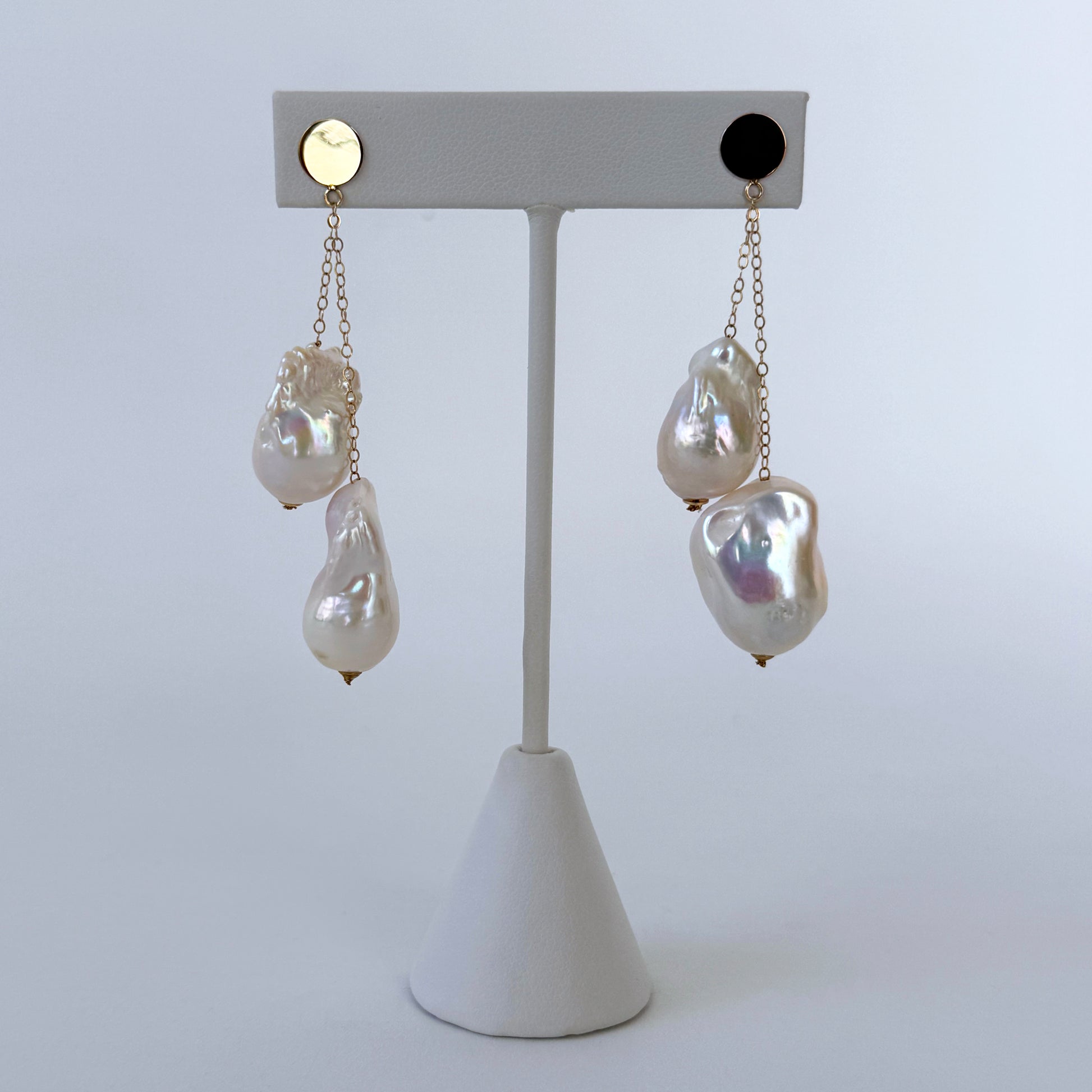 Gorgeous fun pair of Earrings by Marina J. This pair features a total of four cultured white Baroque Pearls displaying a gorgeous multi color iridescent luster. Two Pearls hang from solid 14k Yellow Gold chain on each Earring. Measuring 2.5 inches long each, these Earrings meet at solid 14k Yellow Studs which features a Solid 14k Yellow Gold Disk. This pair brings a fun dramatic yet classy look and is easily worn with any outfit.