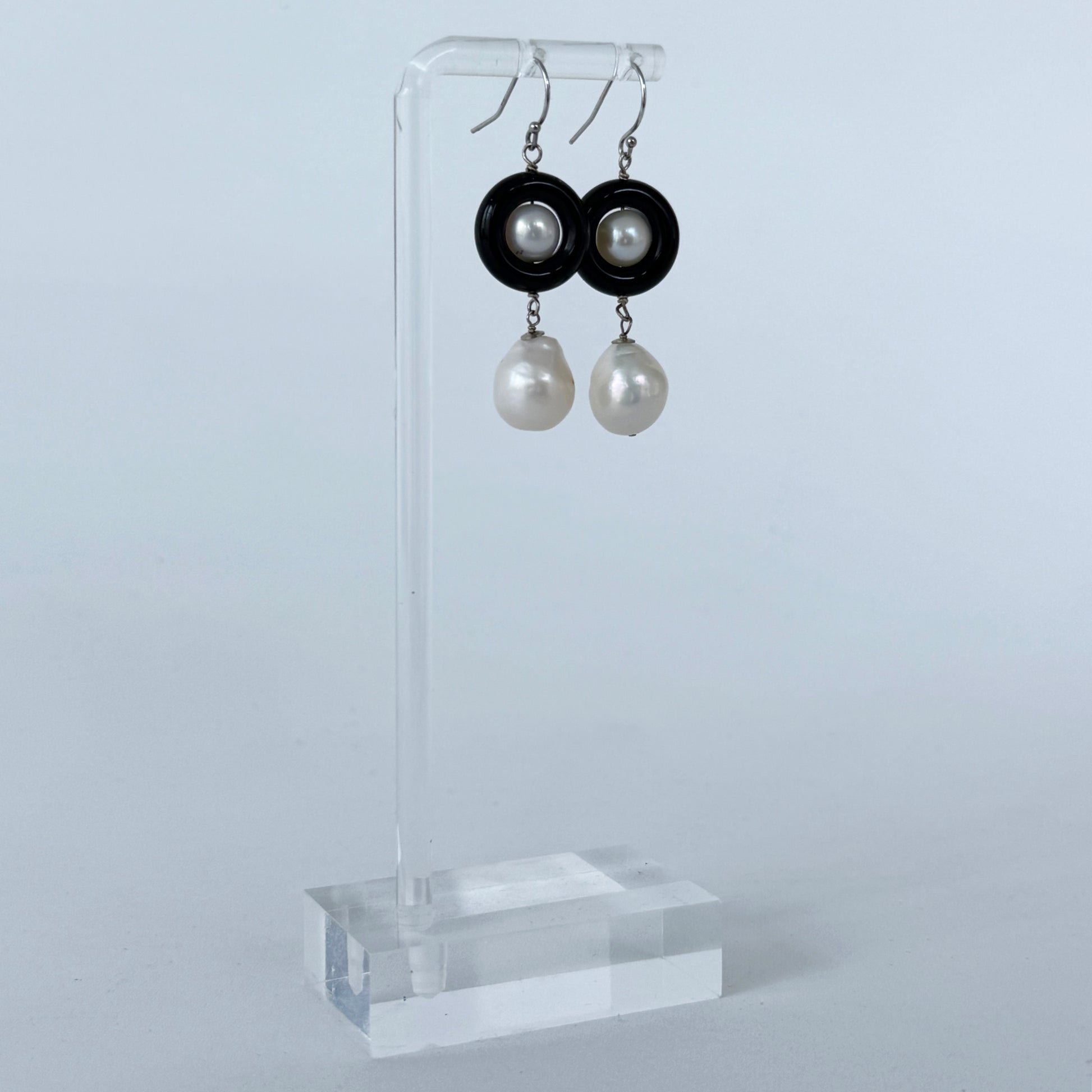 This pair features a round Pearl sitting within a smooth Black Onyx Donut, from which a baroque Pearl hangs. Made entirely with Solid 14k White Gold wiring and Findings, each piece in this pair measures 2.25 inches long and hang off solid 14k high shine studs. A beautiful Art Deco inspired pair great for any formal evening events.