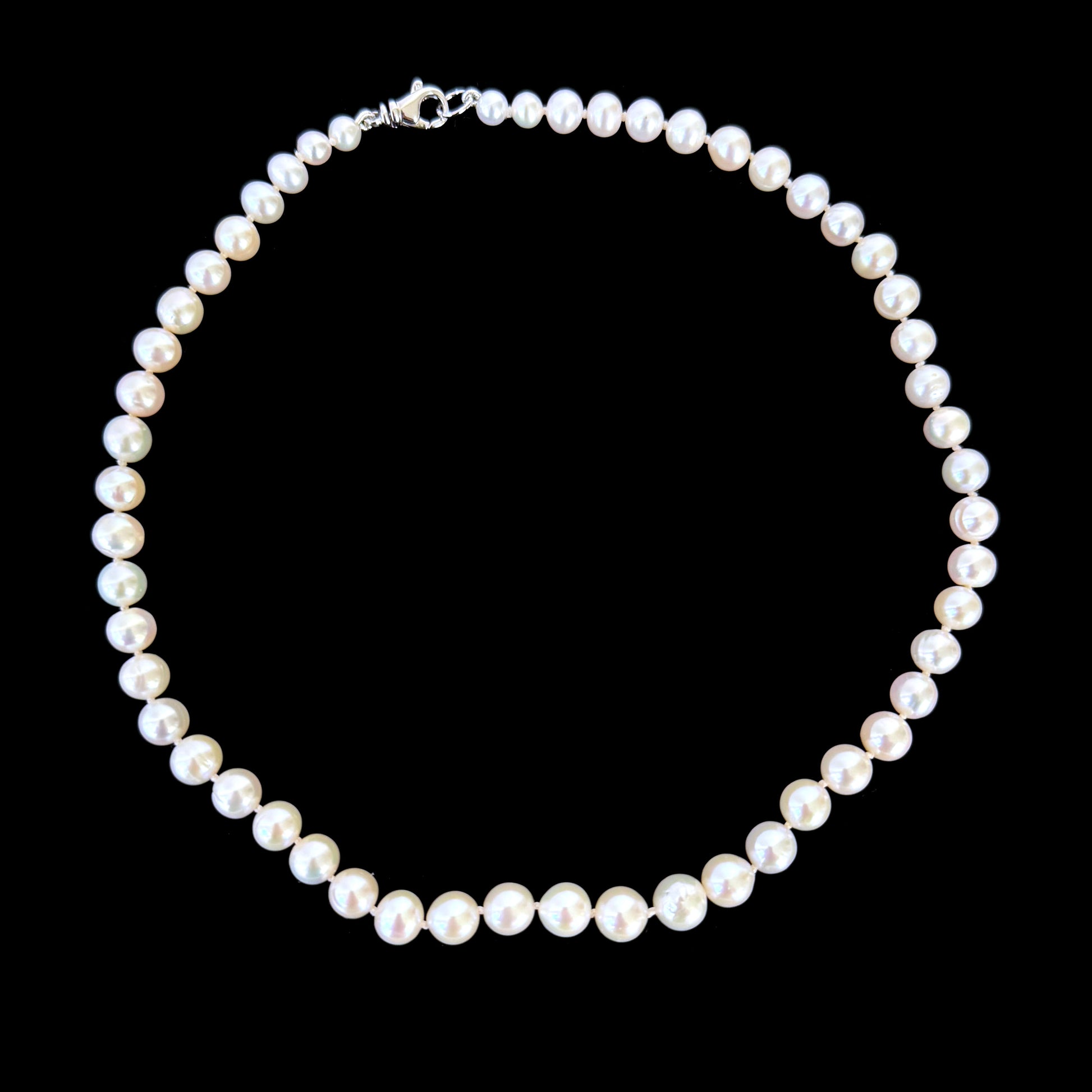 This piece is made with all Cultured and Graduated Pearls strung together with industrial strength thread that will hold up for generations. Measuring 16 inches long, this necklace meets at a high shine Rhodium Plated Silver Clasp, marked 925. Rhodium plating is an anti tarnish plating that ensures the silver remains high shine. A simple yet gorgeous piece for everyday or formal wear.
