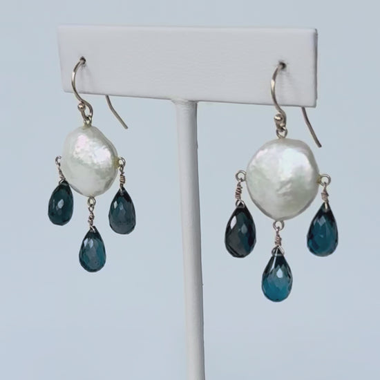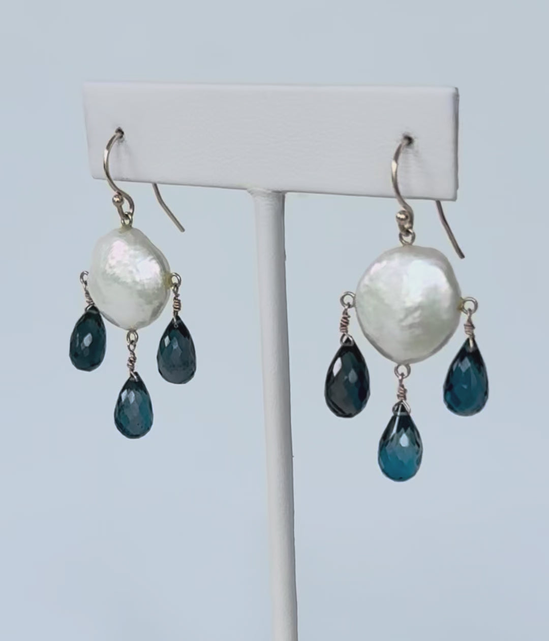 This pair is made with two Baroque Coin Pearls displaying vivid luster. Three Faceted London Blue Topaz hang from each Pearl, perfectly complimented by the Solid 14k Yellow Gold throughout. Measuring 1.5 inch long, this pair is made with all Solid 14k Yellow Gold wiring and Hooks.
