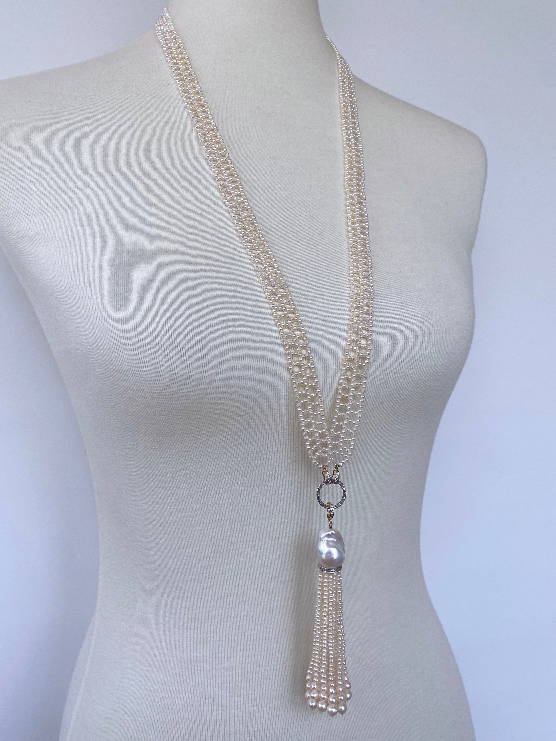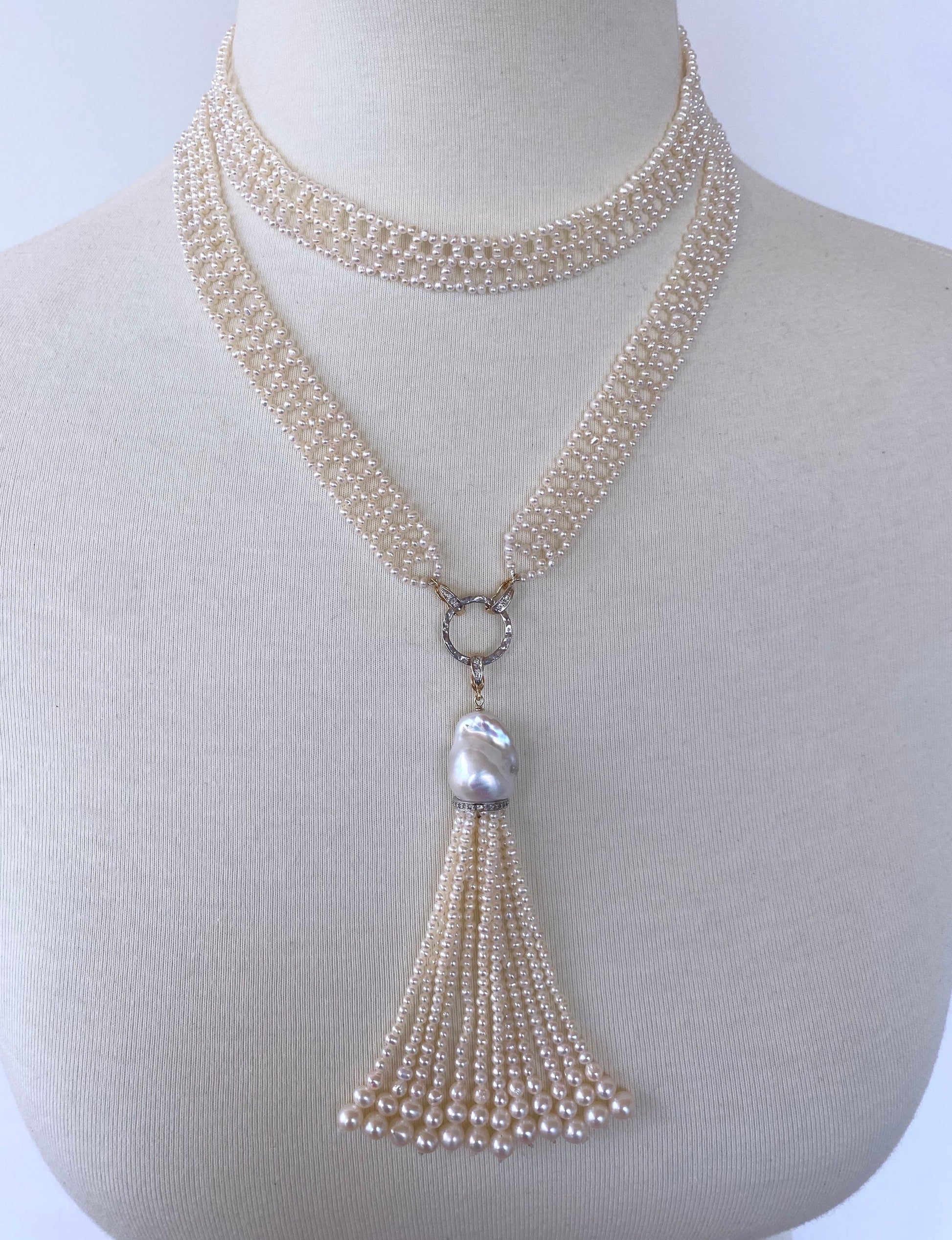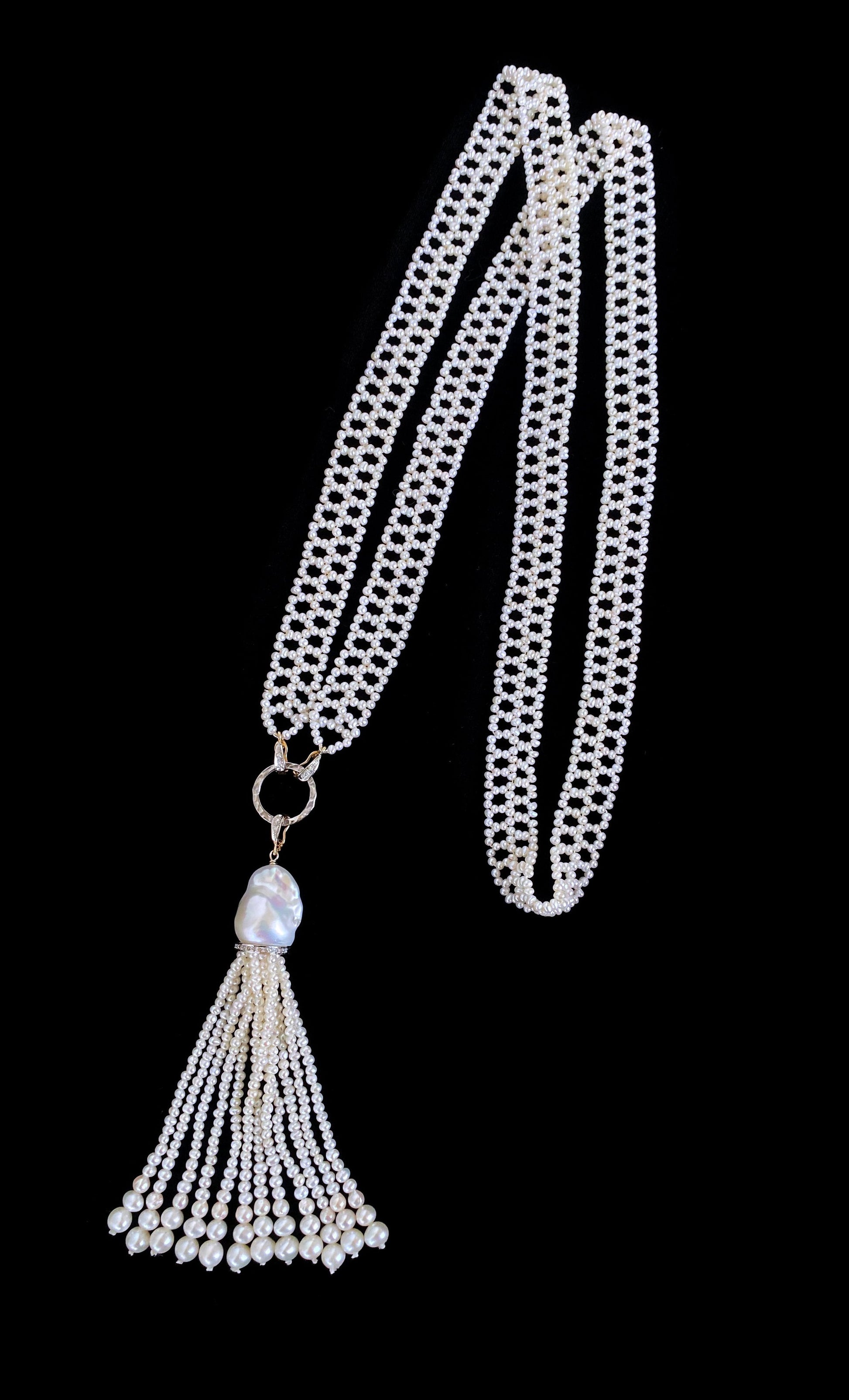 Made by Marina J. This magnificent Victorian inpsired Sautoir features gorgeous Seed Pearls all intricately woven together into a fine lace like design. The seed Pearls in this piece display a white / soft creme like color while holding a beautiful iridescence luster. Measuring 33 inches long sans Tassel, both ends of this Sautoir meet at solid 14k Yellow Gold Diamond Encrusted hooks which latch onto a solid 14k White Gold textured Ring - from which a dramatic 4 inch Tassel hangs. The Tassel latches onto the Ring with the same Diamond Encrusted hook, and features a large Baroque Pearl with magnificent multi color iridescence, sitting atop a solid 14k White Gold Diamond Encrusted roundel that Graduated Strands of Pearls hang from.