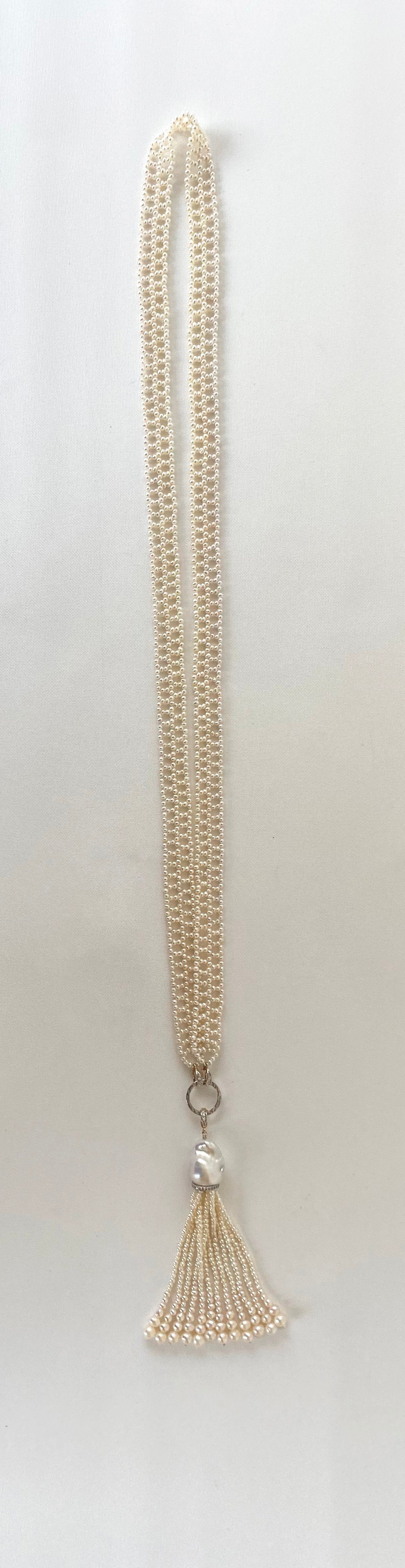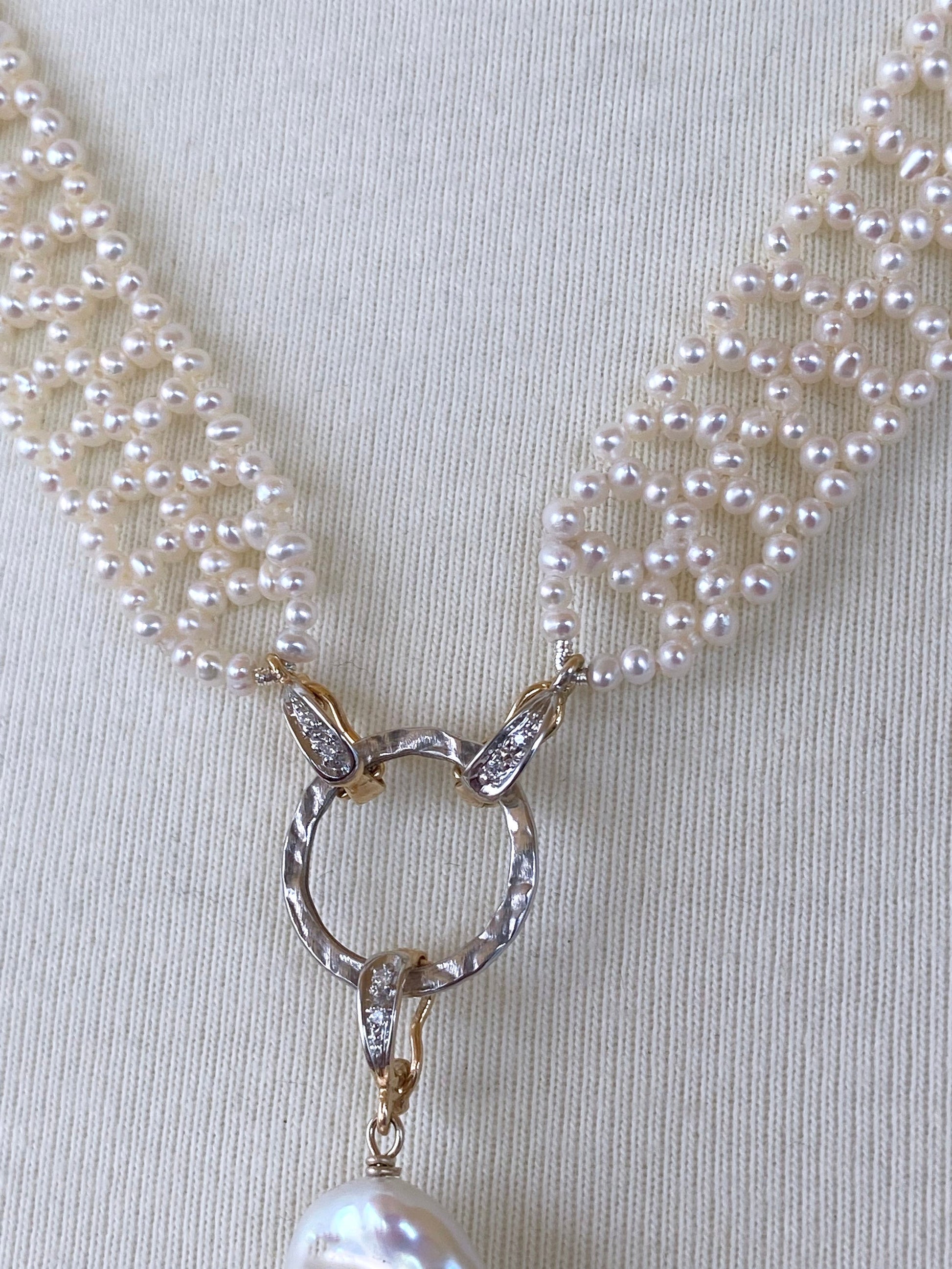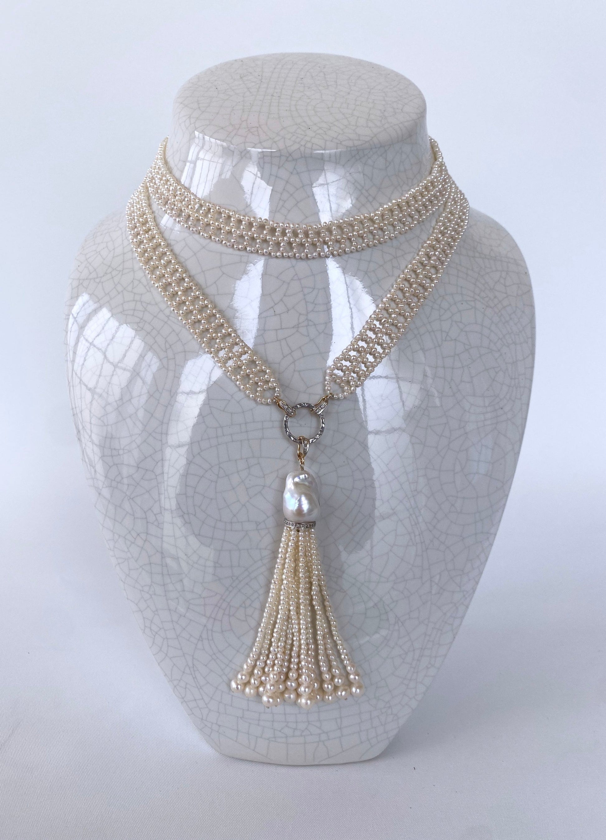 Made by Marina J. This magnificent Victorian inpsired Sautoir features gorgeous Seed Pearls all intricately woven together into a fine lace like design. The seed Pearls in this piece display a white / soft creme like color while holding a beautiful iridescence luster. Measuring 33 inches long sans Tassel, both ends of this Sautoir meet at solid 14k Yellow Gold Diamond Encrusted hooks which latch onto a solid 14k White Gold textured Ring - from which a dramatic 4 inch Tassel hangs. The Tassel latches onto the Ring with the same Diamond Encrusted hook, and features a large Baroque Pearl with magnificent multi color iridescence, sitting atop a solid 14k White Gold Diamond Encrusted roundel that Graduated Strands of Pearls hang from.