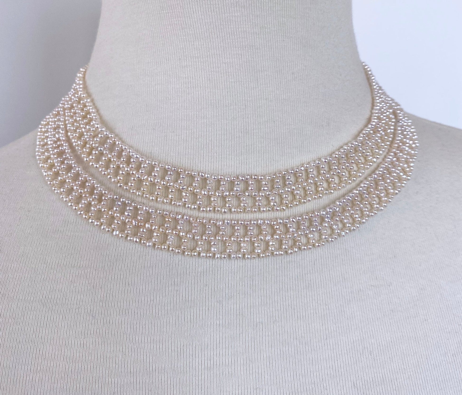 Lace Woven Pearl Sautoir with Diamond Encrusted solid 14k Yellow Gold