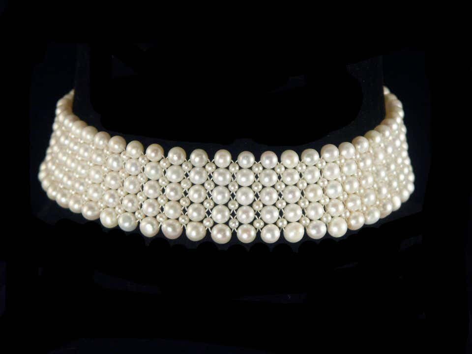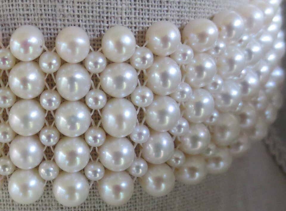 An intricately handwoven choker necklace is made of 6mm and 3mm cultured pearls. Choker measures 13.5 inches in length and 1 1/2" inches height. The choker is tapered in design to fit along the curve of the neckline. The clasp is made of sterling silver rhodium plaited secure sliding clasp .
