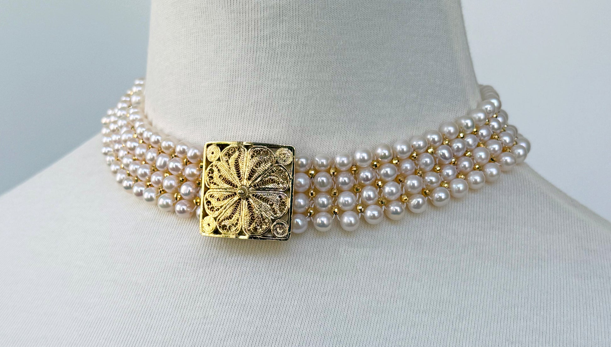 One Of A Kind Pearl & Faceted Gold Bead Choker with Vintage Filigree Centerpiece