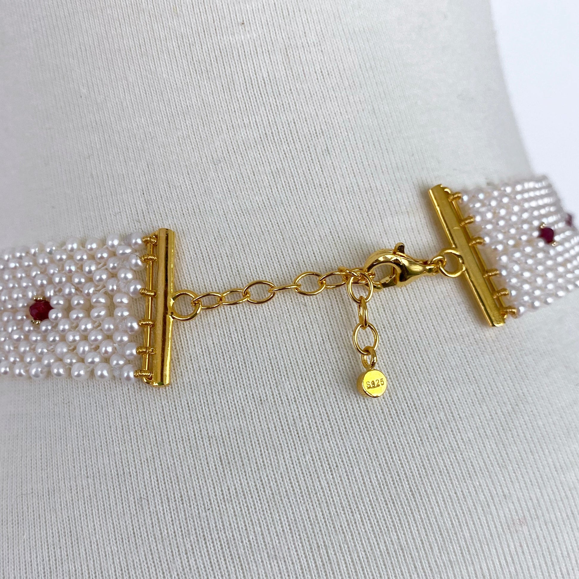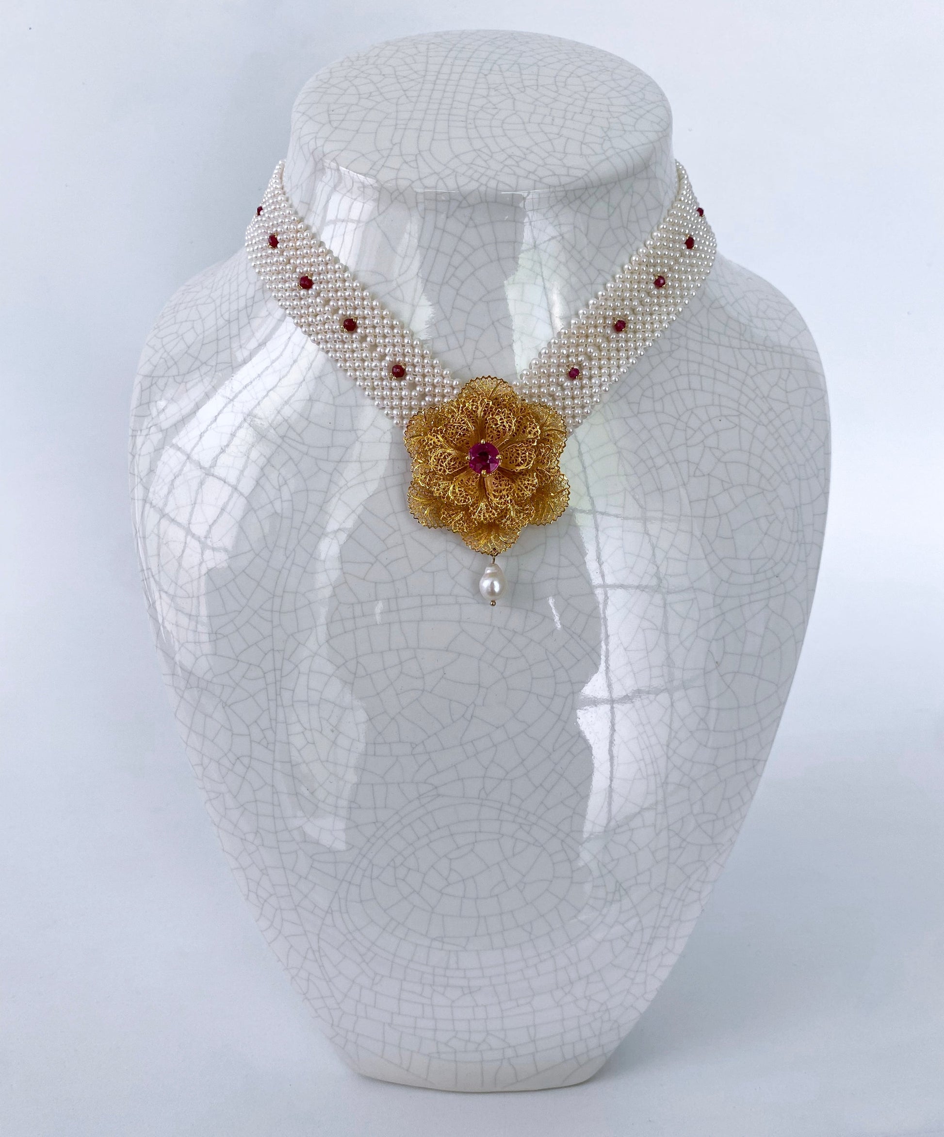 One of A Kind Pearl Woven Necklace with Rubies & Pink Topaz