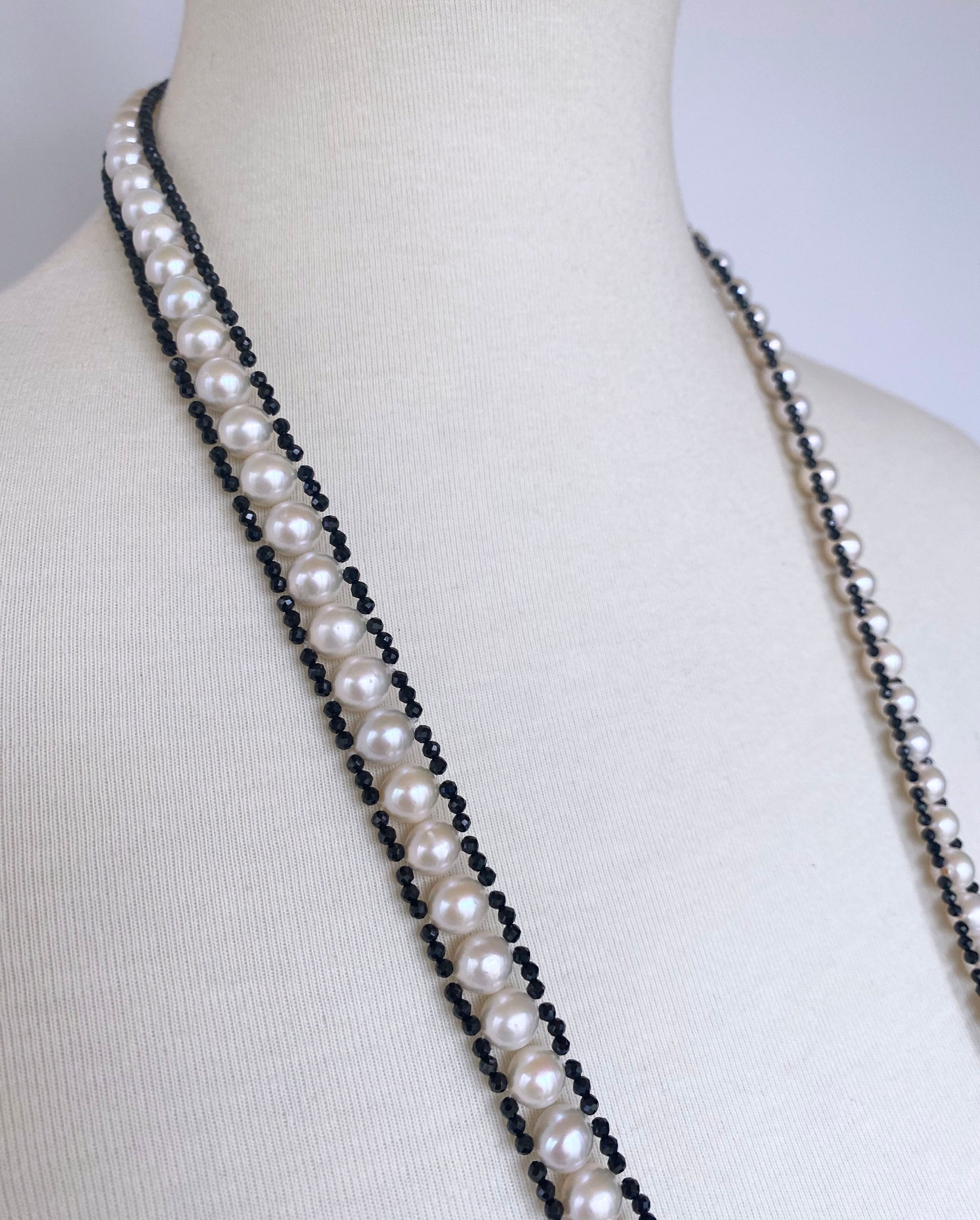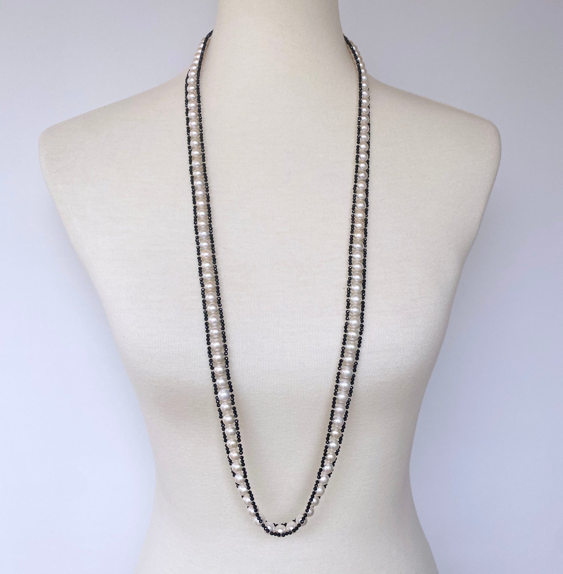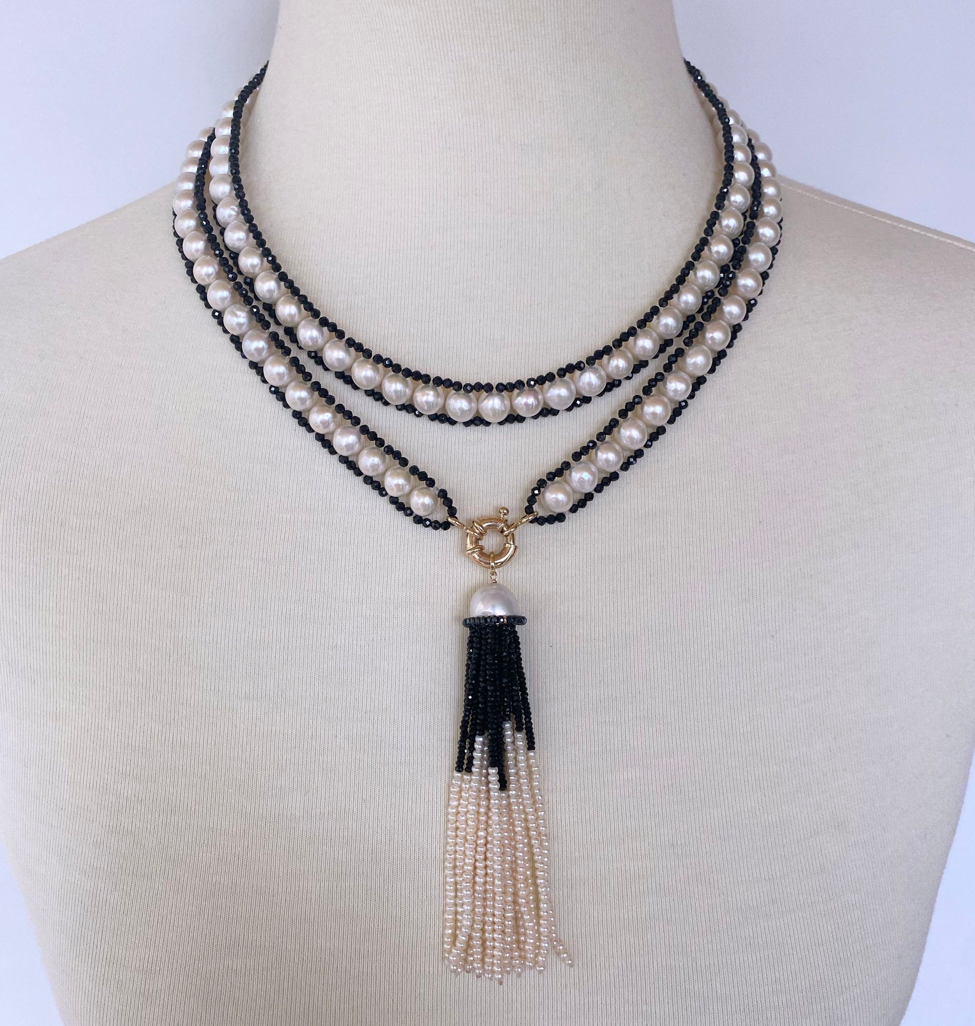 Beautiful Satuoir handmade by Marina J. in Los Angeles. This amazing piece features real White Pearls (8mm) which display a great iridescent sheen, woven together and adorned with faceted Black Spinel. Measuring 39 inches sans Tassel, this versatile Satuoir meets at a 14k Yellow Gold decorative Ring Clasp, from which a removable Tassel hangs. Measuring 4 inches long, the Tassel features a beautiful Baroque Pearl sitting atop a Black Spinel ring, from which multiple strands of Seed Pearl and Spinel hang. The closer Ring Clasp allows versatility and this Sautoir to be worn in multiple ways, as seen in photos. Art Deco inspired, this piece can easily be worn up or down for the perfect classy and dramatic evening look!