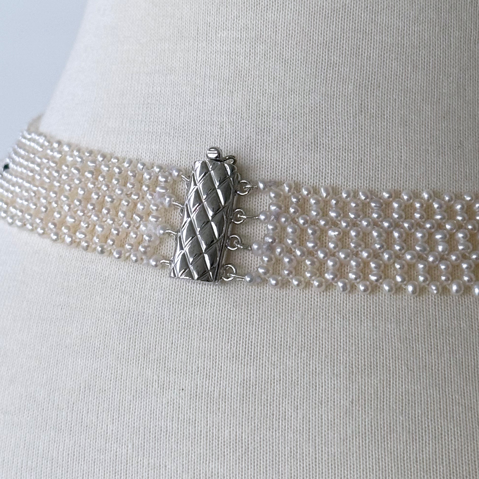 This piece is made with all Seed Pearls and Faceted Lapis Lazuli woven together into a beautiful lace like design. Measuring 17 inches long, this Necklace meets at a Rhodium Plated Decorative Silver Sliding Clasp. A Vintage Blue Mosaic Brooch has been reworked into the Centerpiece for this Necklace, featuring a gorgeous detailed Floral motif. The Lapis Lazuli in this piece perfectly match the Floral Mosaic, making it pop. An amazing piece for any formal or Bridal occasion.