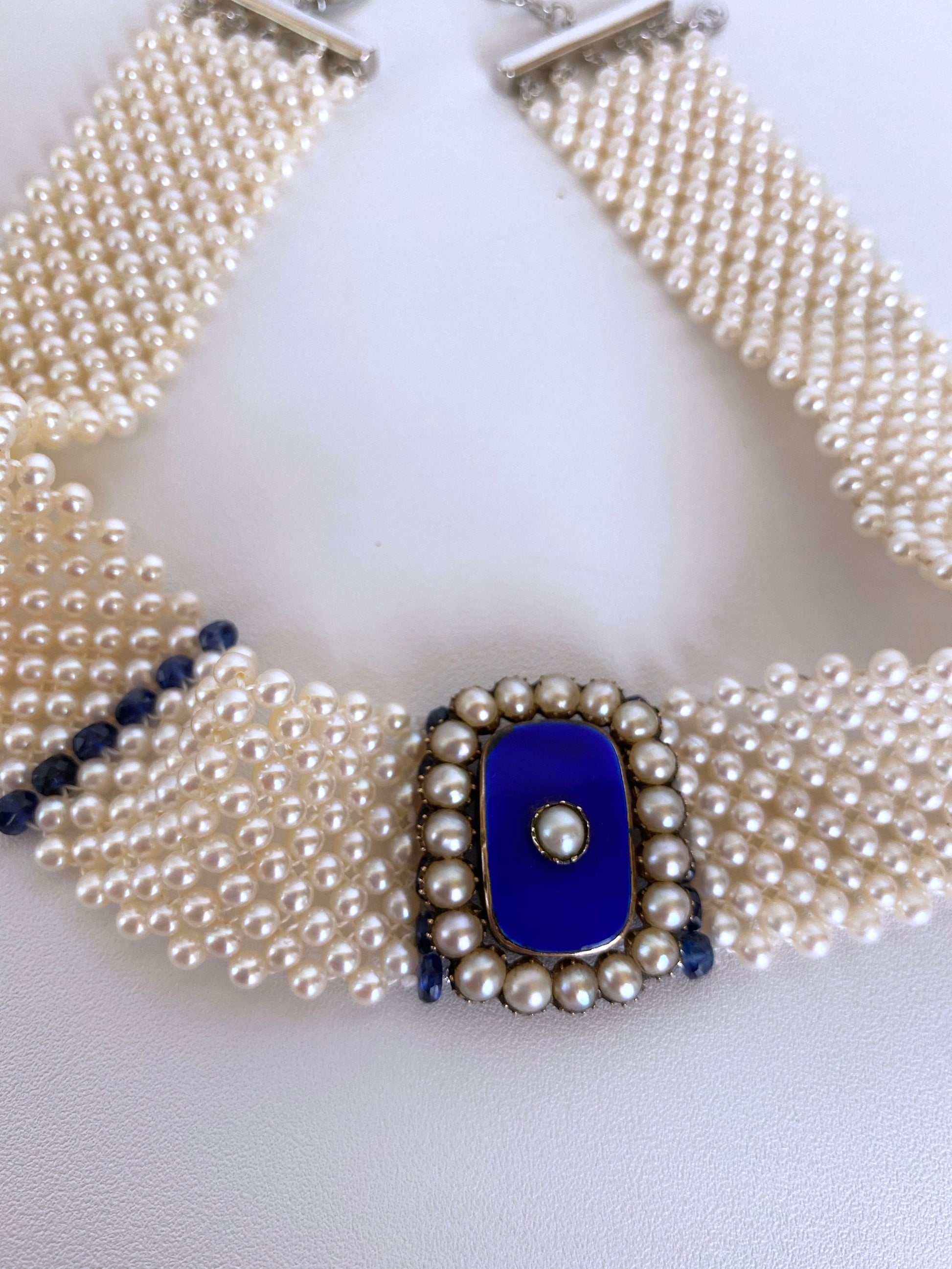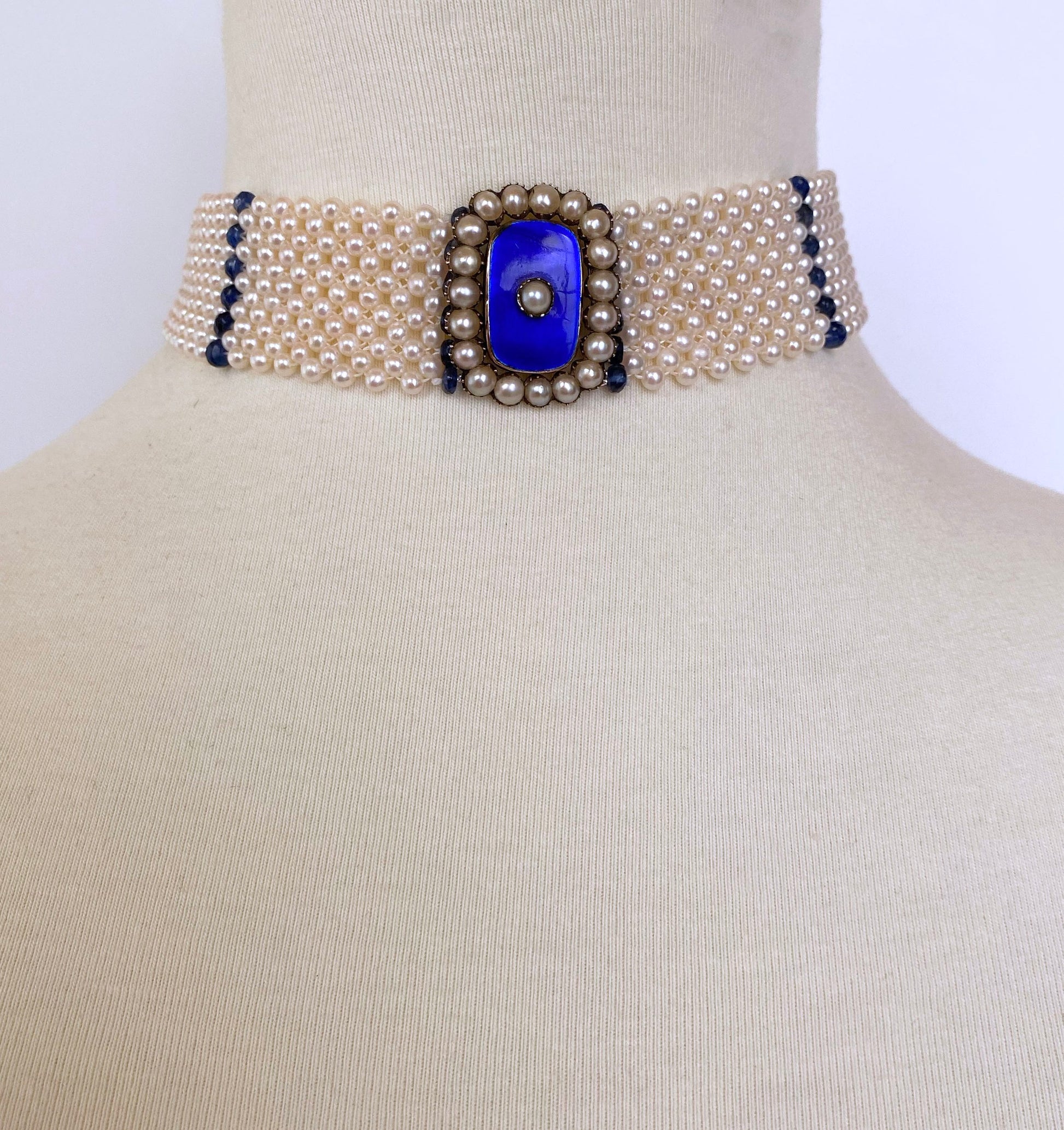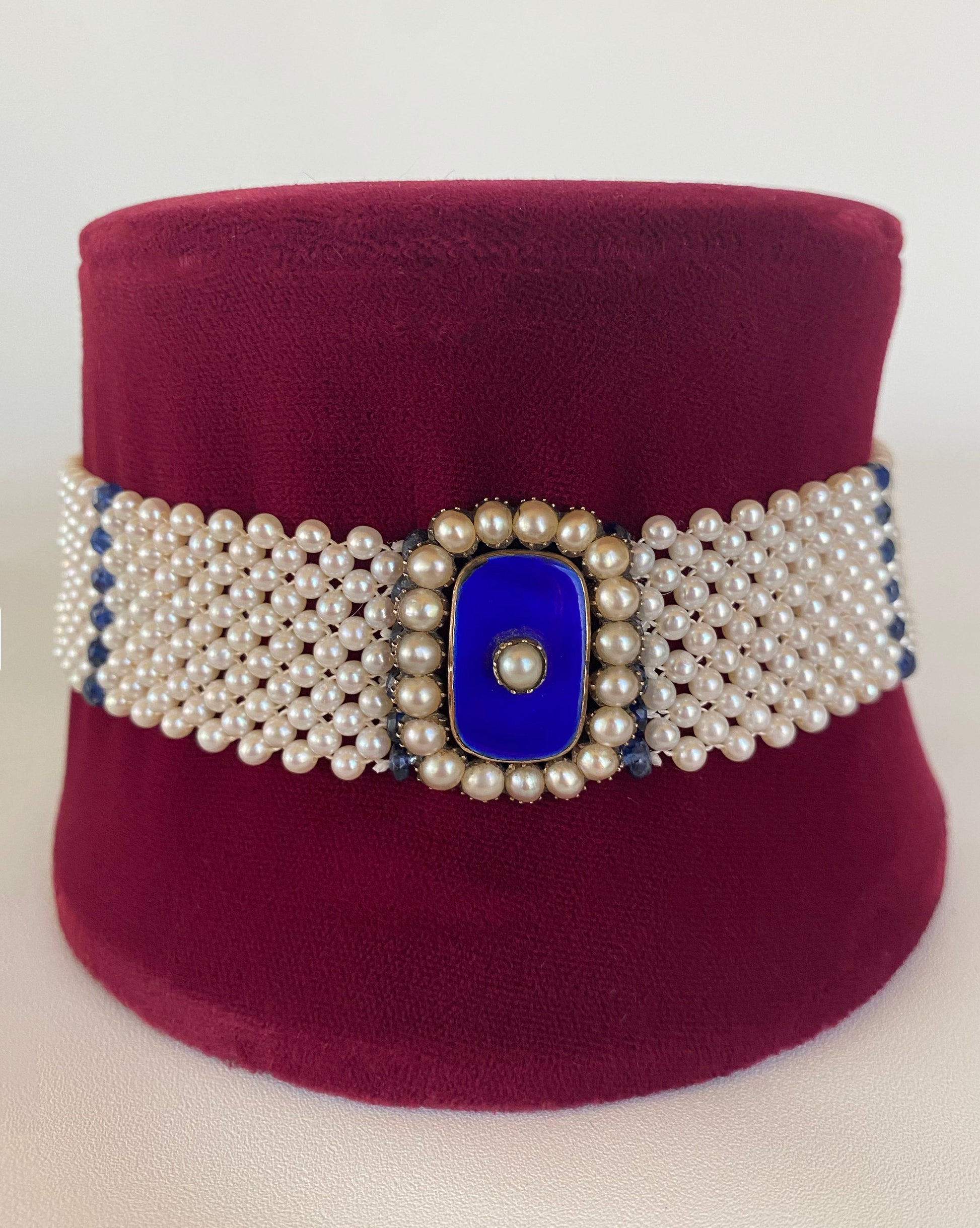 Gorgeous Vintage 1920s Enamel Centerpiece with original Natural Pearls reimagined into a stunning Choker. The centerpiece radiates a vibrant Royal Blue color that cannot be missed, complimented by high luster white Pearls which display a beautiful iridescence. The centerpiece is further accented by gorgeous faceted Blue Sapphire beads which catch light wonderfully. Due to its adjustable 14K White Gold Clasp, this choker can measure from 13 to 14.5 inches long and is perfect for a dramatic yet subtle look.
