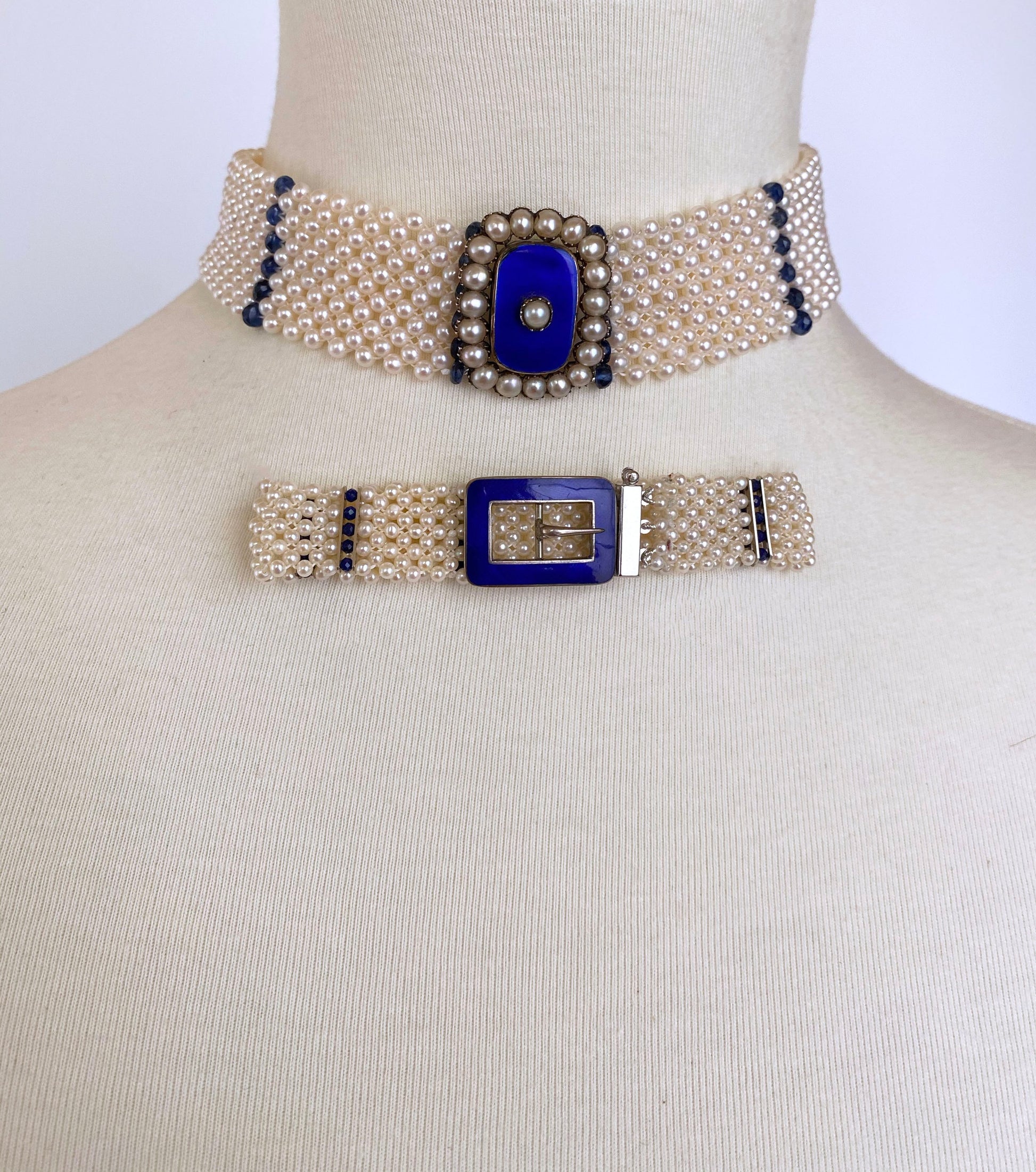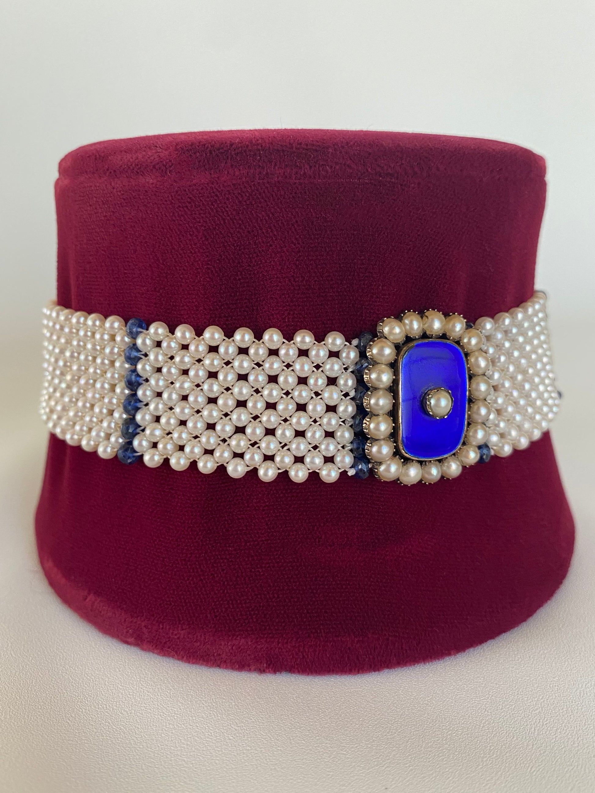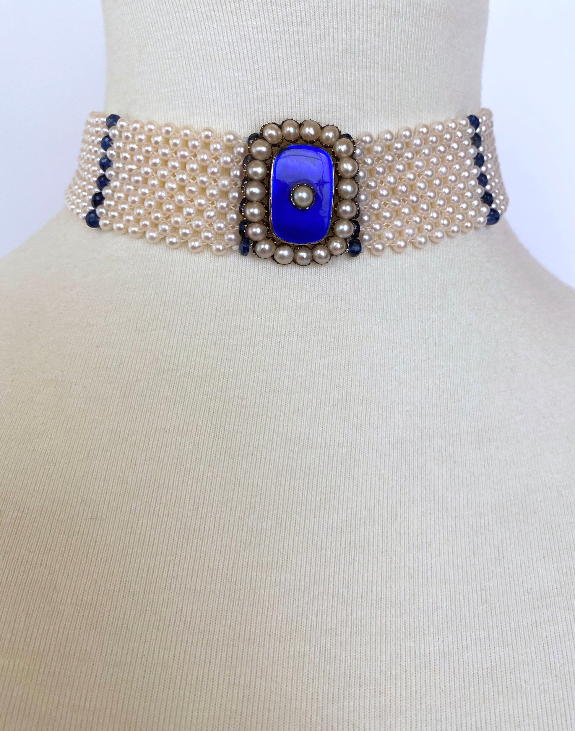 Gorgeous Vintage 1920s Enamel Centerpiece with original Natural Pearls reimagined into a stunning Choker. The centerpiece radiates a vibrant Royal Blue color that cannot be missed, complimented by high luster white Pearls which display a beautiful iridescence. The centerpiece is further accented by gorgeous faceted Blue Sapphire beads which catch light wonderfully. Due to its adjustable 14K White Gold Clasp, this choker can measure from 13 to 14.5 inches long and is perfect for a dramatic yet subtle look.