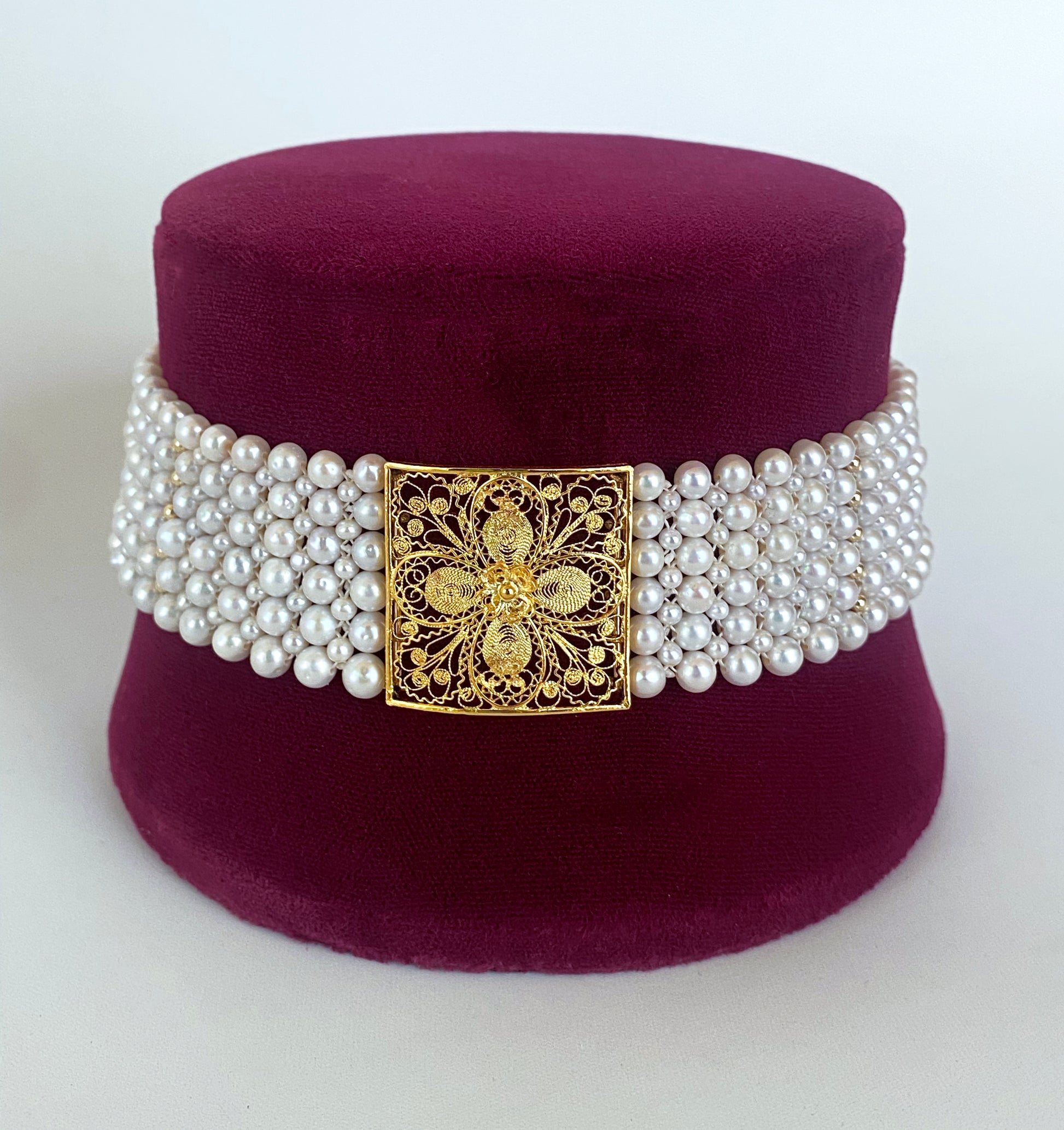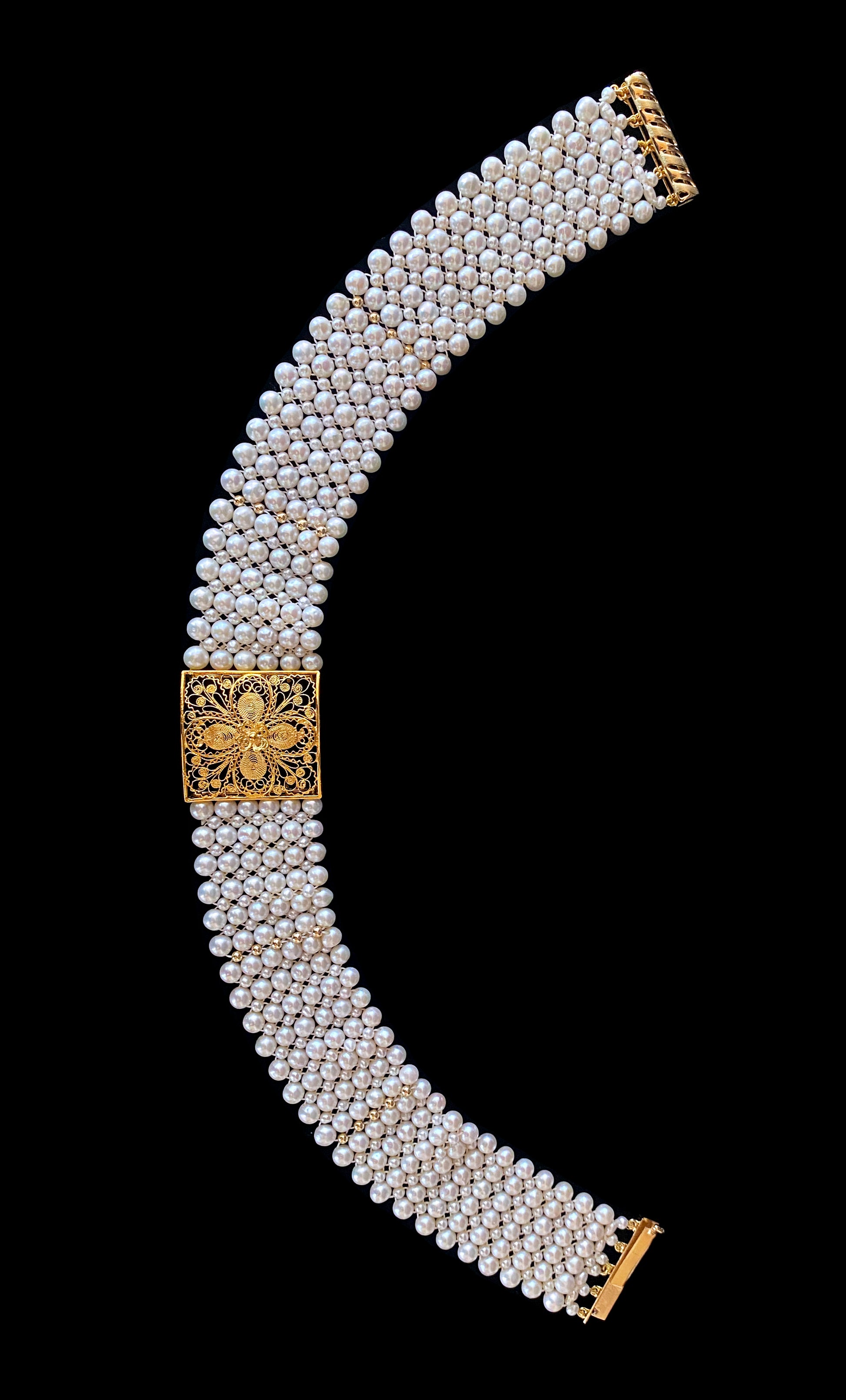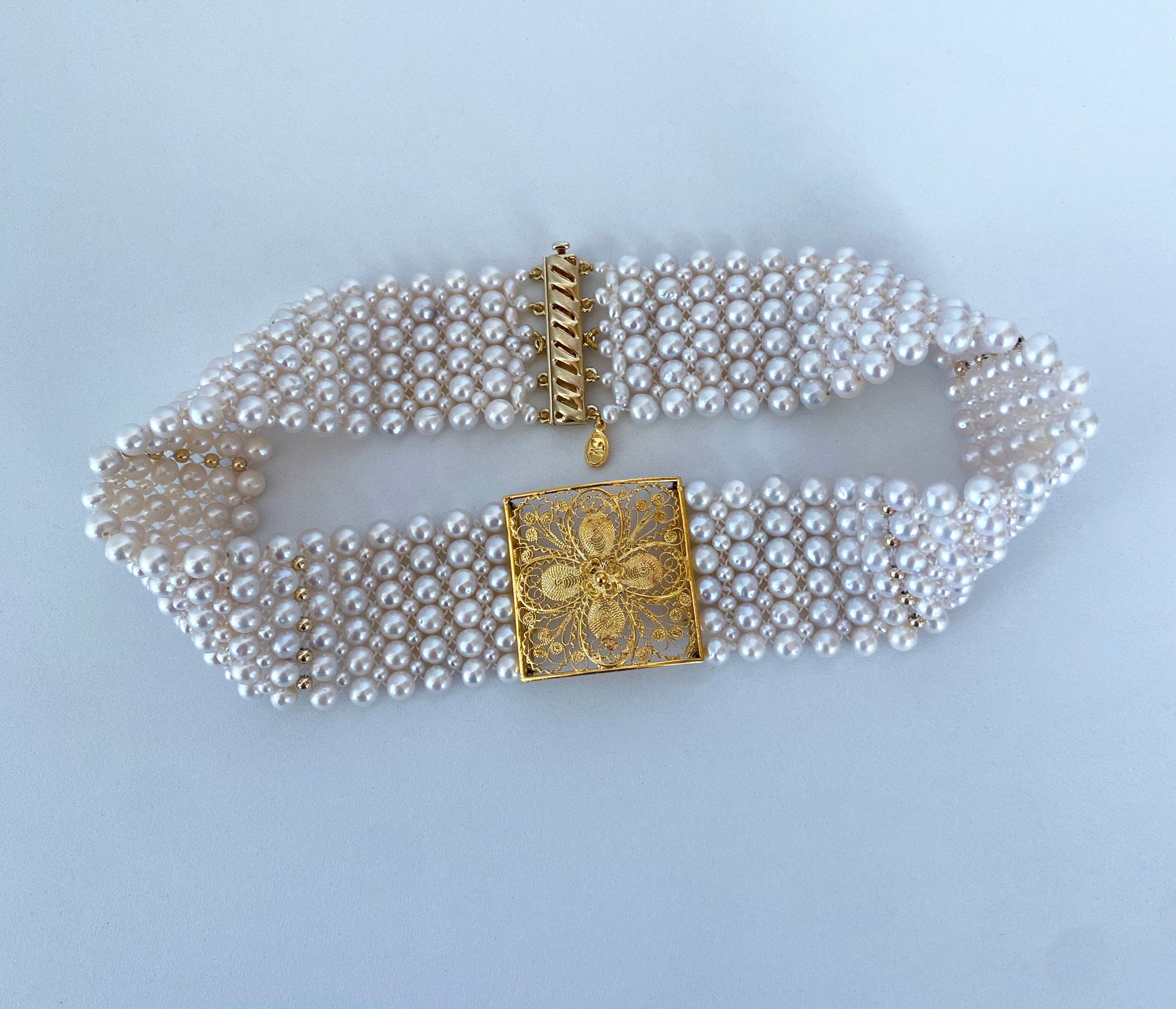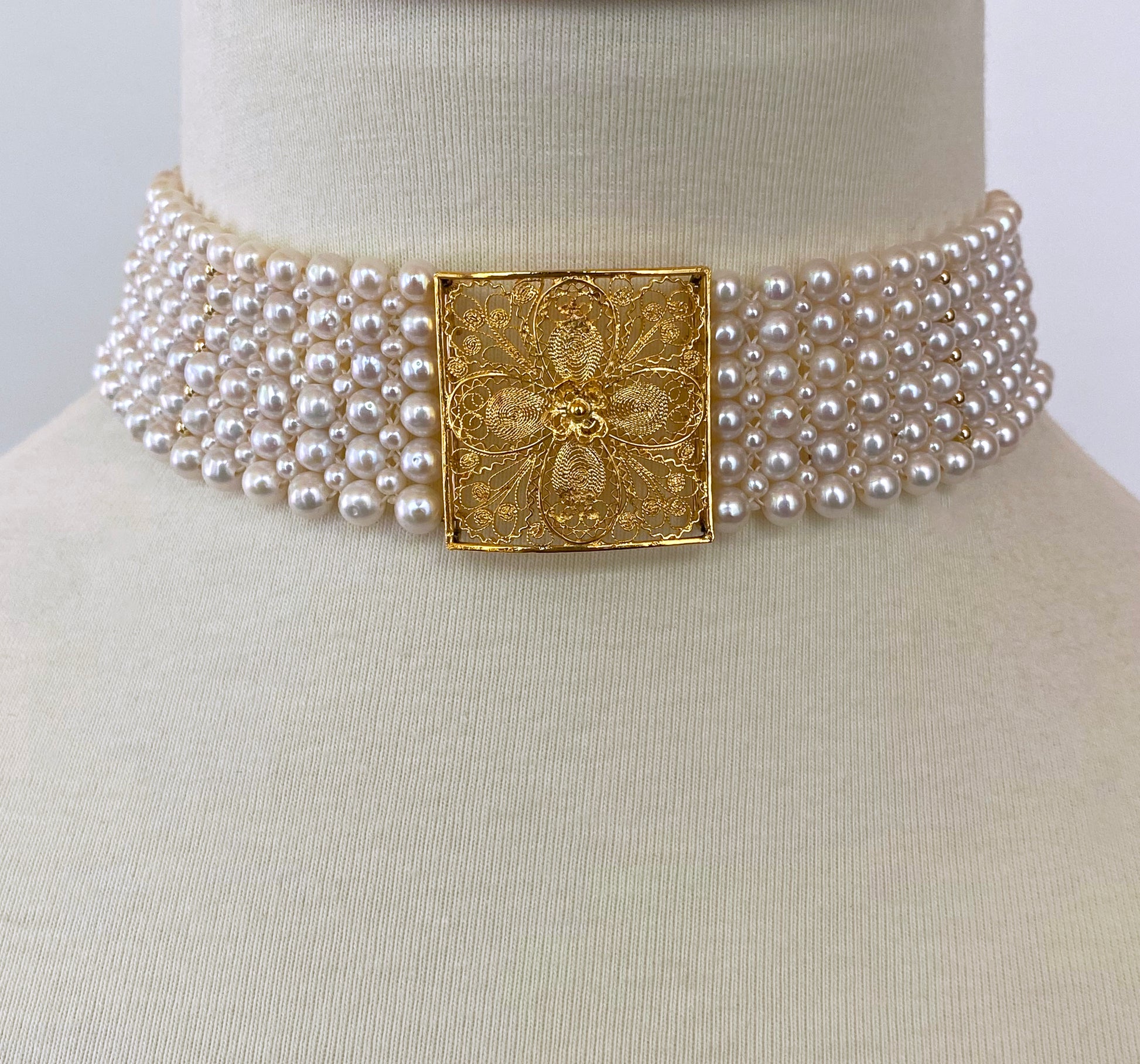 Gorgeous One of A Kind piece by Marina J. This choker features multi sized cultured White Pearls all intricately woven into a tight Lace design. The Centerpiece features a gorgeous Filigree Floral Silver Square repurposed from a Vintage Bracelet, plated in vivid 18k Yellow Gold. The Centerpiece has a slight curvature to it, allowing comfortability with wear. Additionally, the Pearl band, adorned in 18k Yellow Gold Plated Faceted Beads, is woven with a slight tapering Graduation, allowing Choker to curve with the neck and sit perfectly when worn. Measuring 1 inch thick and 13 inches long, this piece meets at a Decorative 18k Yellow Gold Plated sliding Clasp (stamped 925) perfectly matching the Filigree Floral Centerpiece.