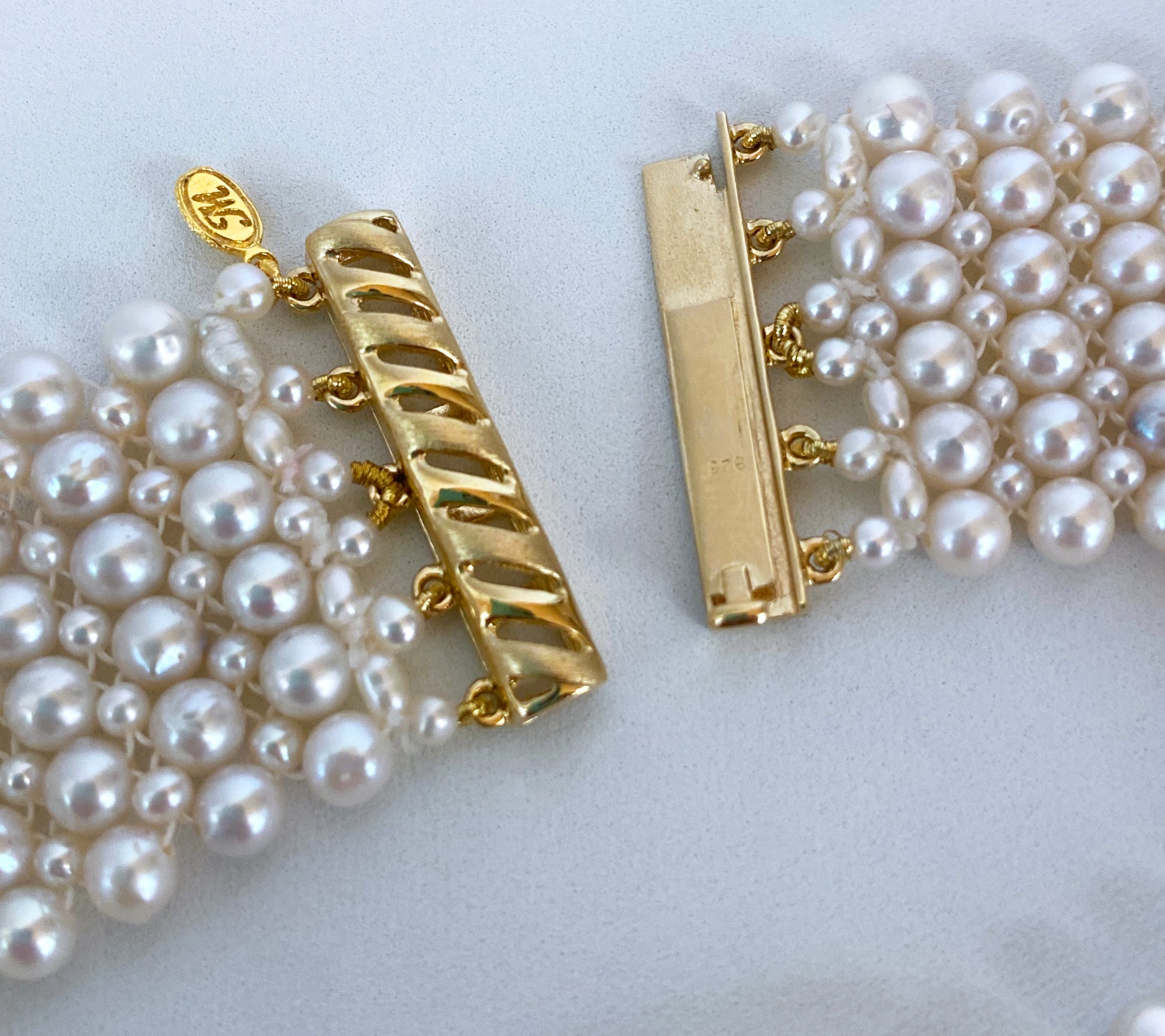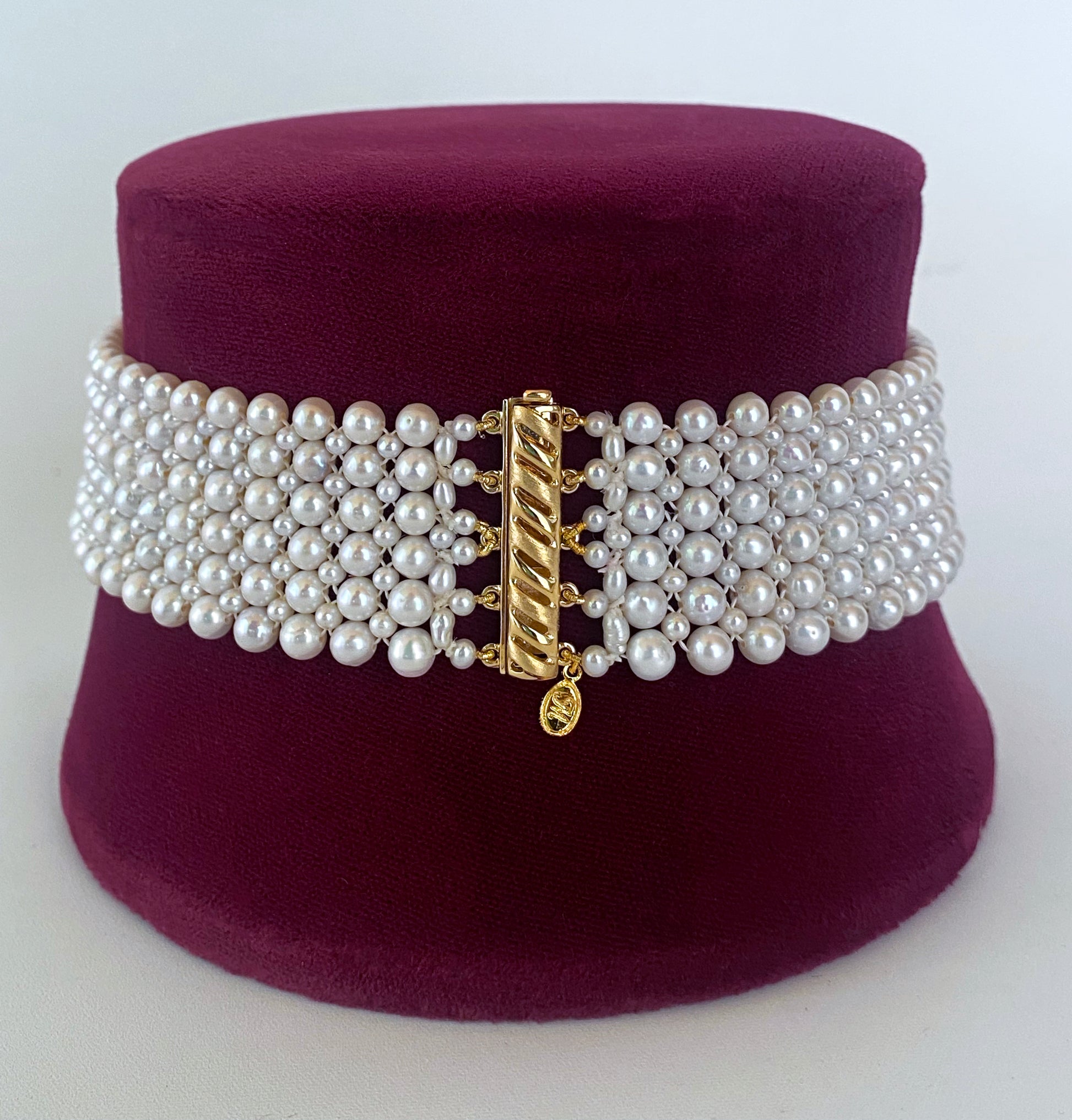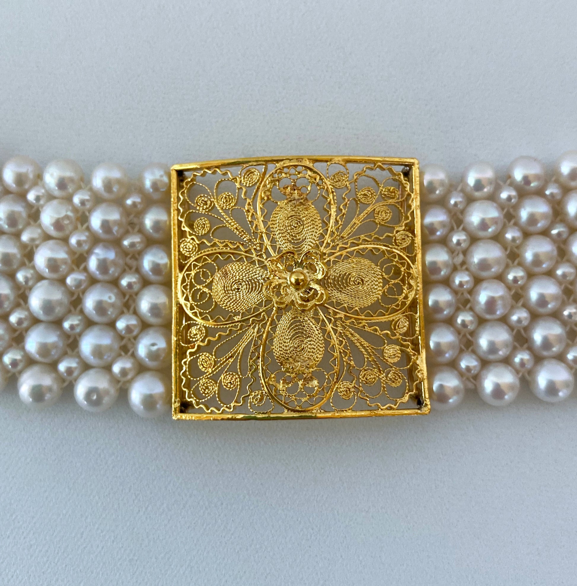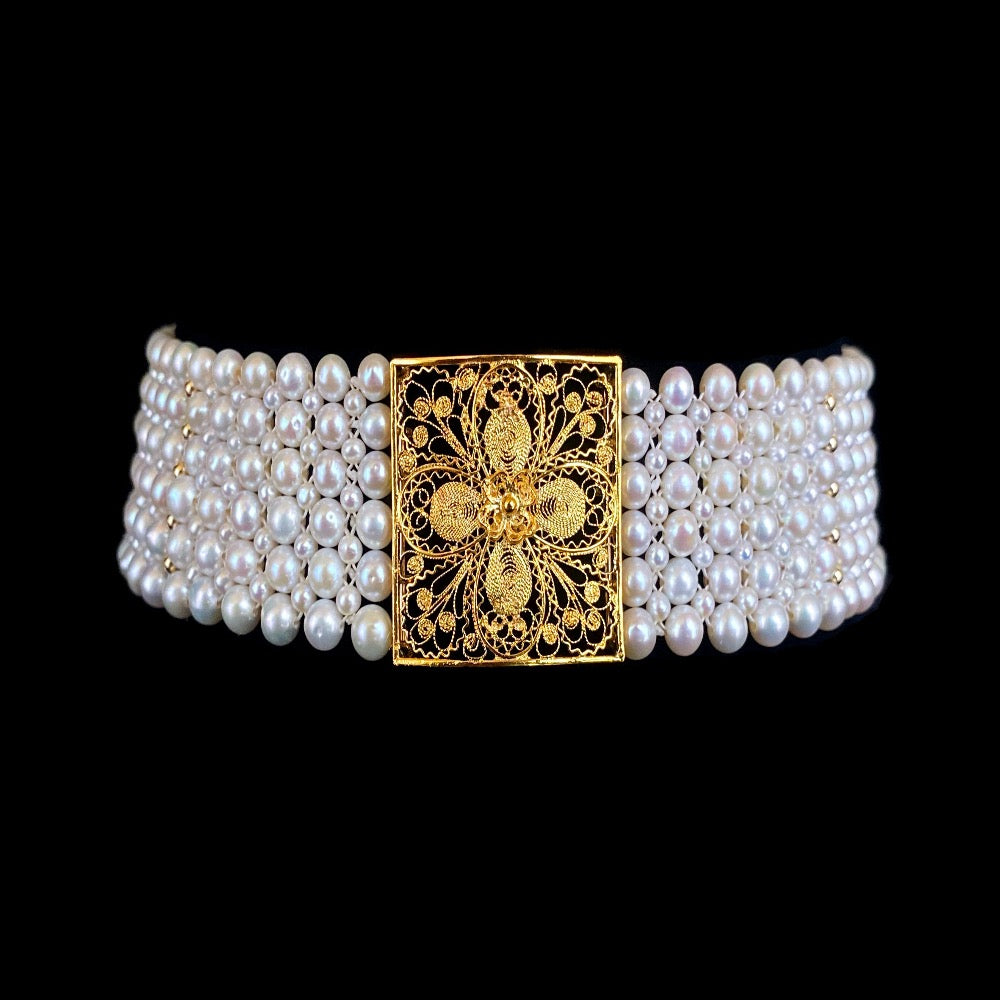 Gorgeous One of A Kind piece by Marina J. This choker features multi sized cultured White Pearls all intricately woven into a tight Lace design. The Centerpiece features a gorgeous Filigree Floral Silver Square repurposed from a Vintage Bracelet, plated in vivid 18k Yellow Gold. The Centerpiece has a slight curvature to it, allowing comfortability with wear. Additionally, the Pearl band, adorned in 18k Yellow Gold Plated Faceted Beads, is woven with a slight tapering Graduation, allowing Choker to curve with the neck and sit perfectly when worn. Measuring 1 inch thick and 13 inches long, this piece meets at a Decorative 18k Yellow Gold Plated sliding Clasp (stamped 925) perfectly matching the Filigree Floral Centerpiece.