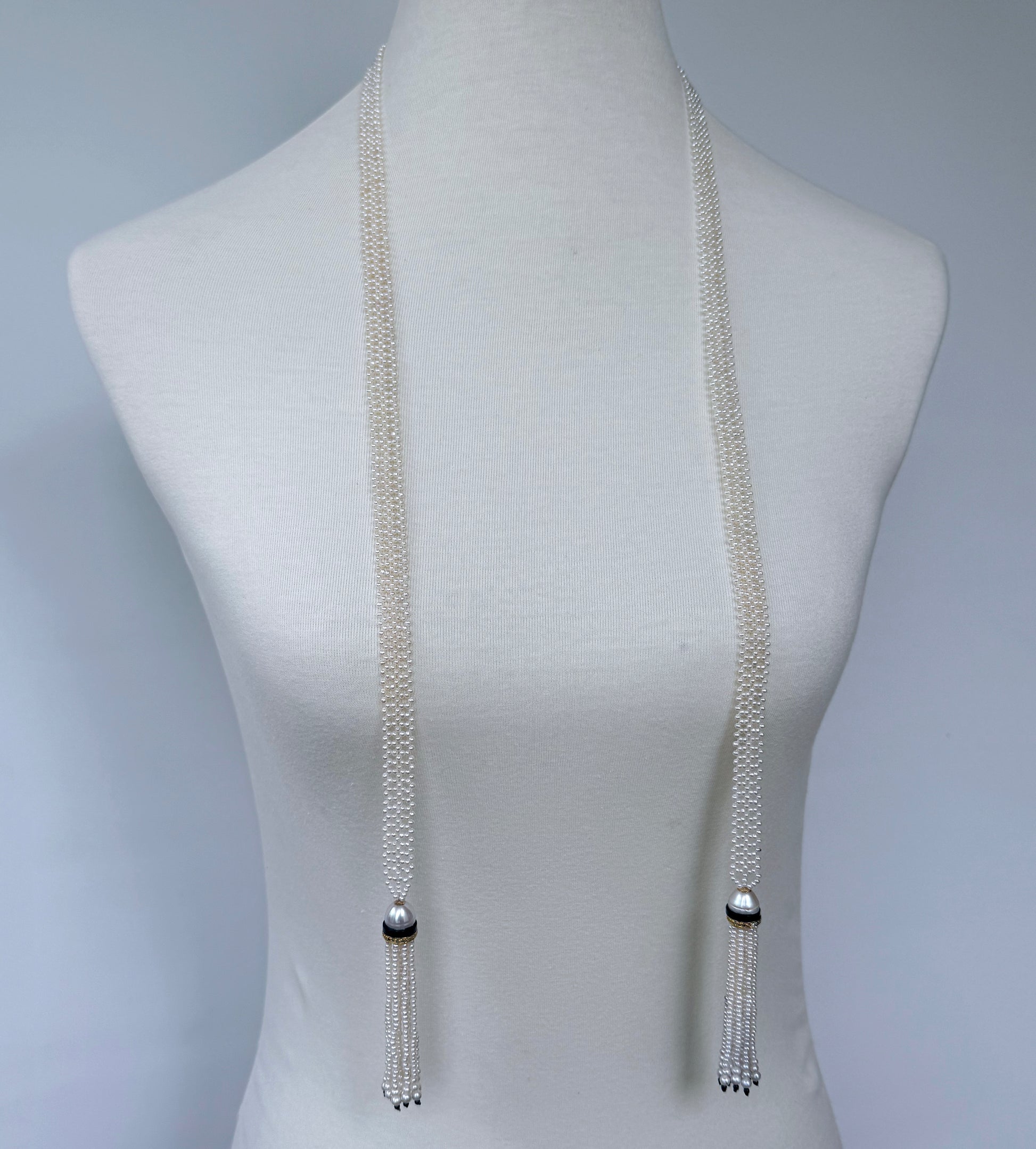 This piece is made with all Seed Pearls intricately woven together into a tight, lace like design. The Seed Pearls in this piece hold a soft luster that makes the White Pearls glow. Measuring 41 inches long, both ends of this Lariat / Sautoir meet at 3 inch long Tassels. Each Tassel features Baroque Pearls sitting atop Black Onyx and 18k Gold Plated - Diamond Encrusted cups, from which multiple strands of granulated Pearls hang. A fabulous Necklace for any formal or bridal occasion!