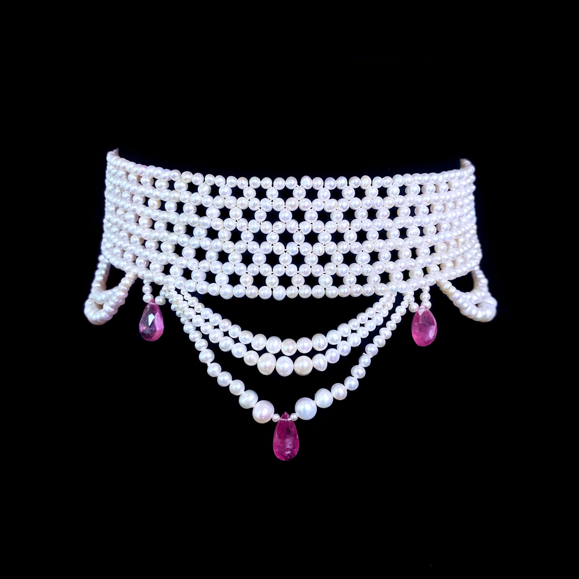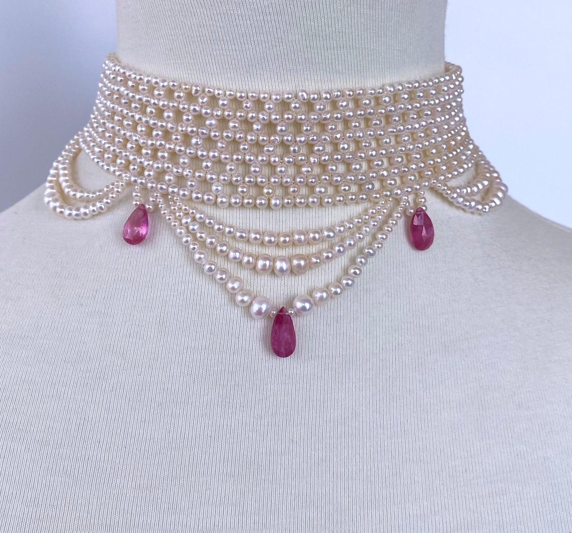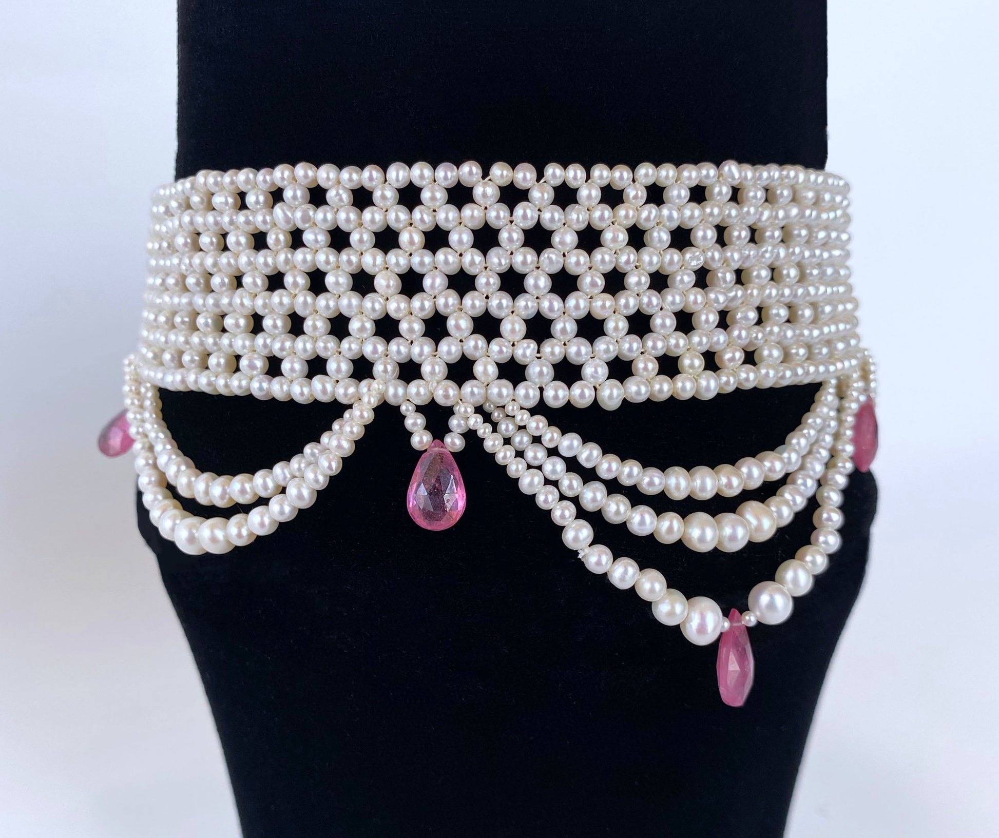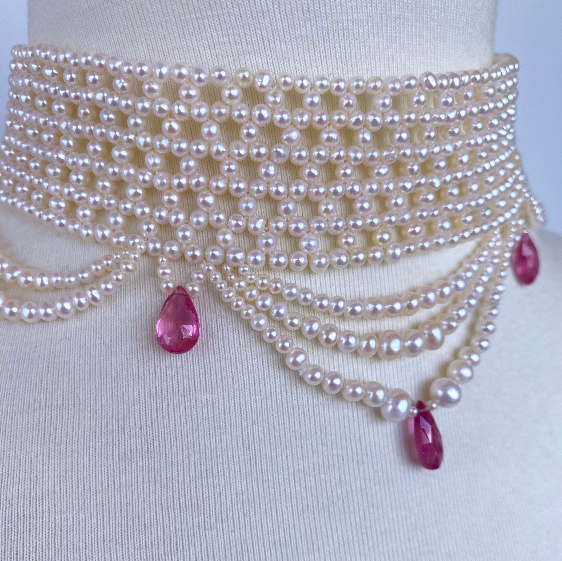 Beautiful piece by Marina J. This gorgeous Choker features high luster cream Pearls with great iridescence, all intricately hand woven together into a tight fine lace design. Amazing faceted Pink Sapphire briolettes hang from the necklace, which shine bright due to their translucency. Beautiful Graduated Pearl drapes hang, further accentuating the Pink Sapphires and woven design. Measuring 14 inches, this choker meets at a decorative Rhodium Plated Silver sliding Clasp. Rhodium is used as an anti-tarnish metal, ensuring longevity and shine.