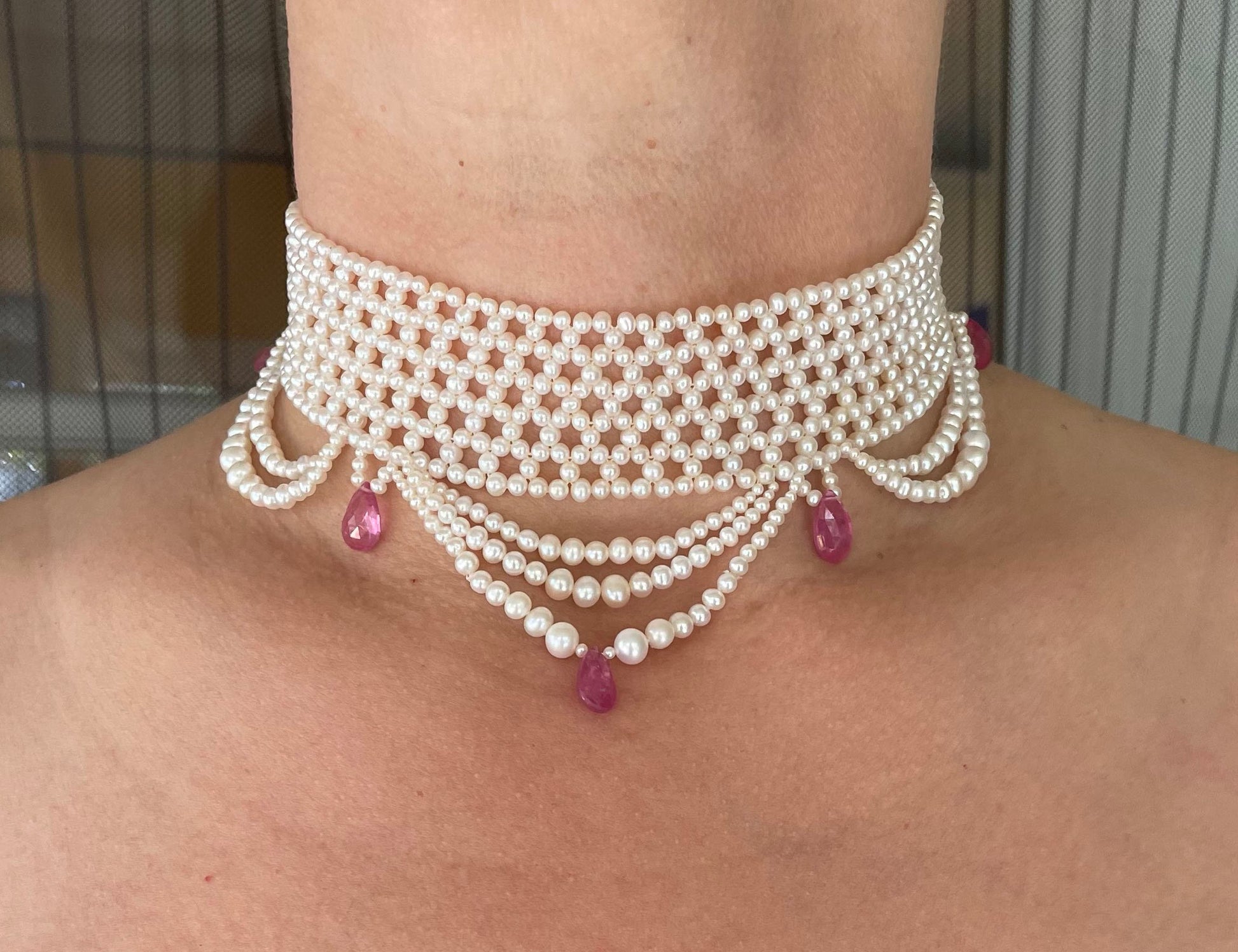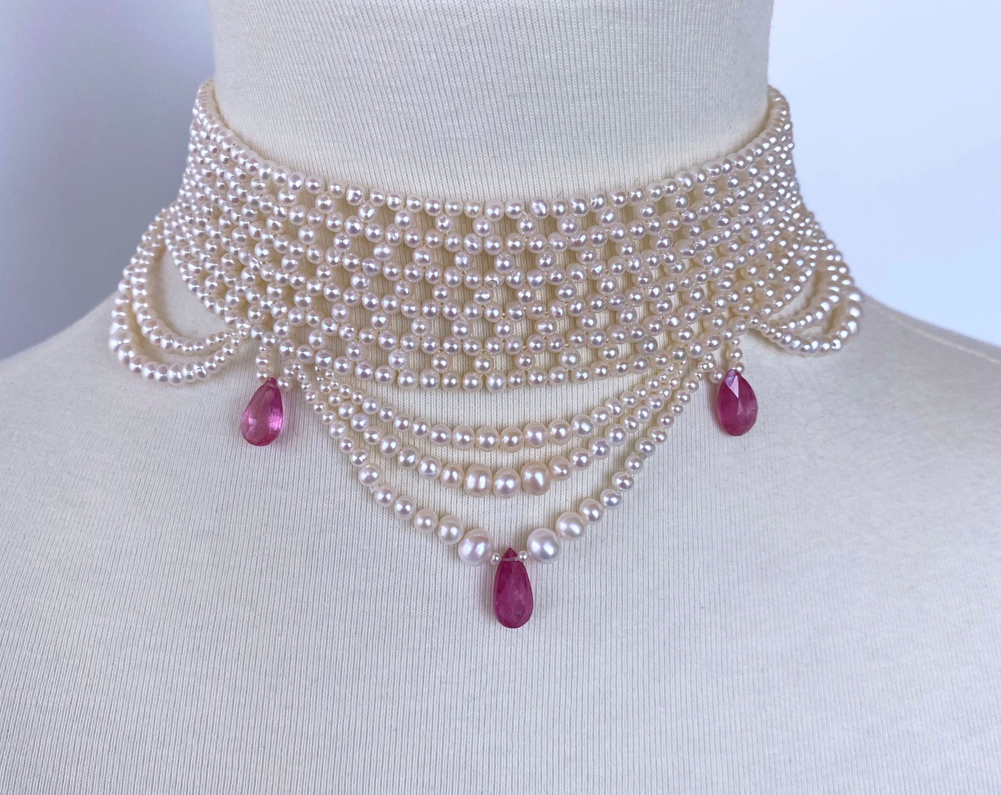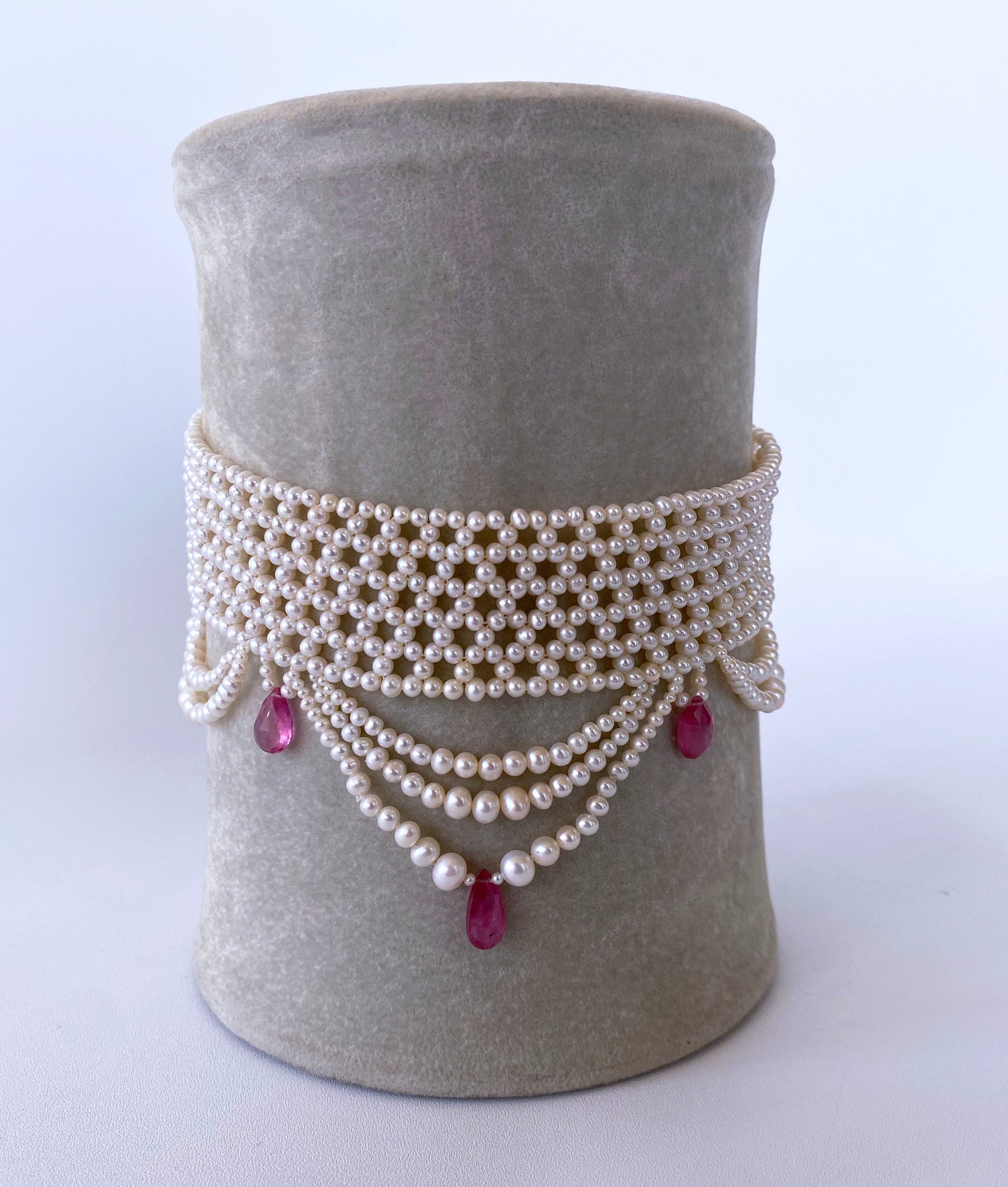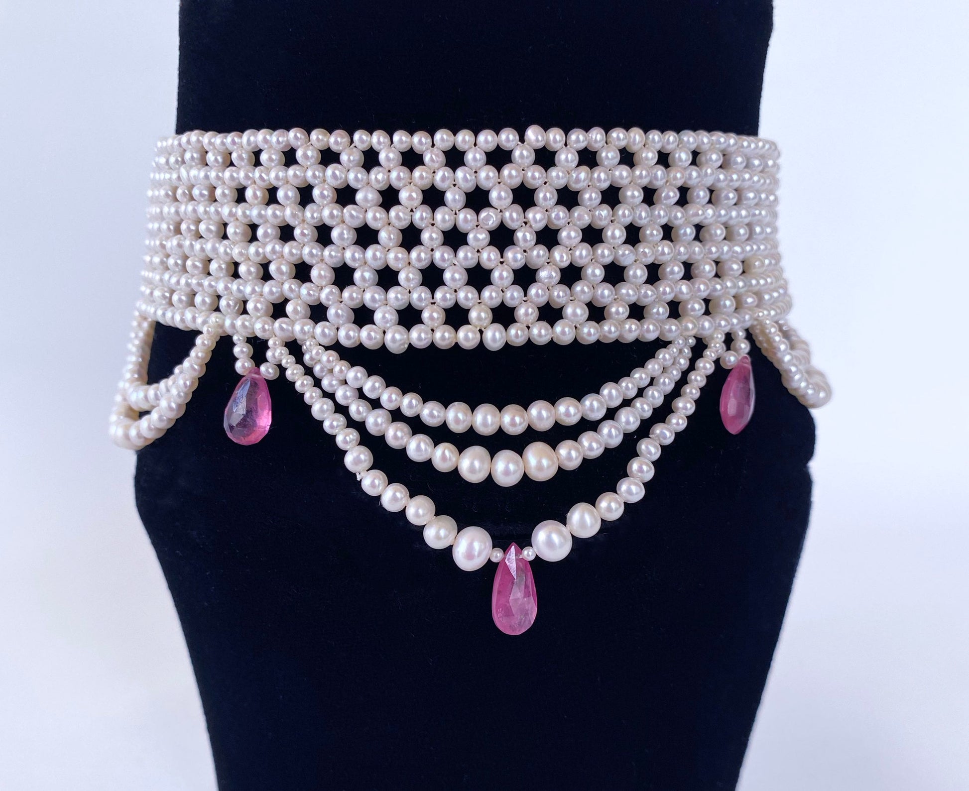 Beautiful piece by Marina J. This gorgeous Choker features high luster cream Pearls with great iridescence, all intricately hand woven together into a tight fine lace design. Amazing faceted Pink Sapphire briolettes hang from the necklace, which shine bright due to their translucency. Beautiful Graduated Pearl drapes hang, further accentuating the Pink Sapphires and woven design. Measuring 14 inches, this choker meets at a decorative Rhodium Plated Silver sliding Clasp. Rhodium is used as an anti-tarnish metal, ensuring longevity and shine.