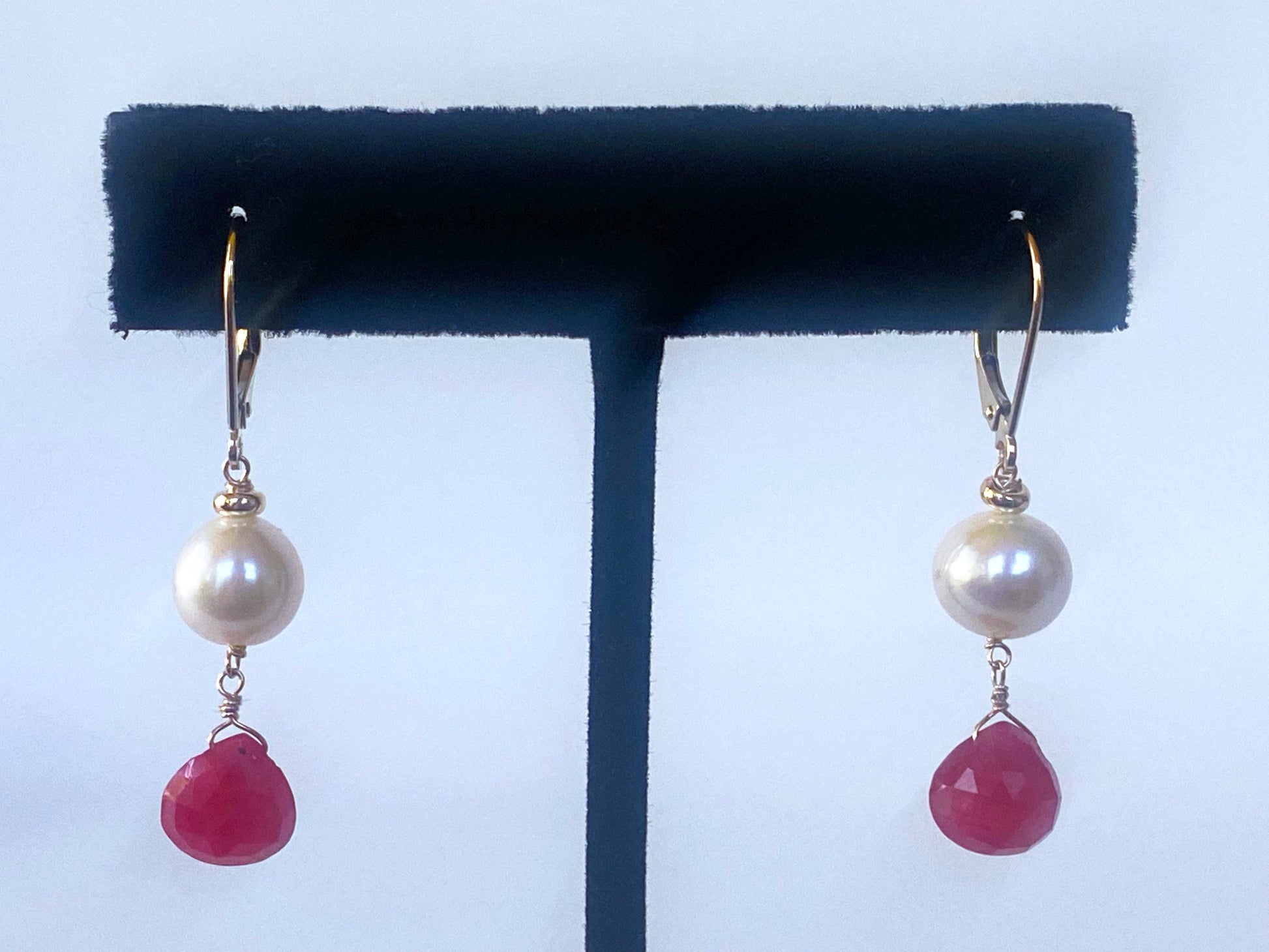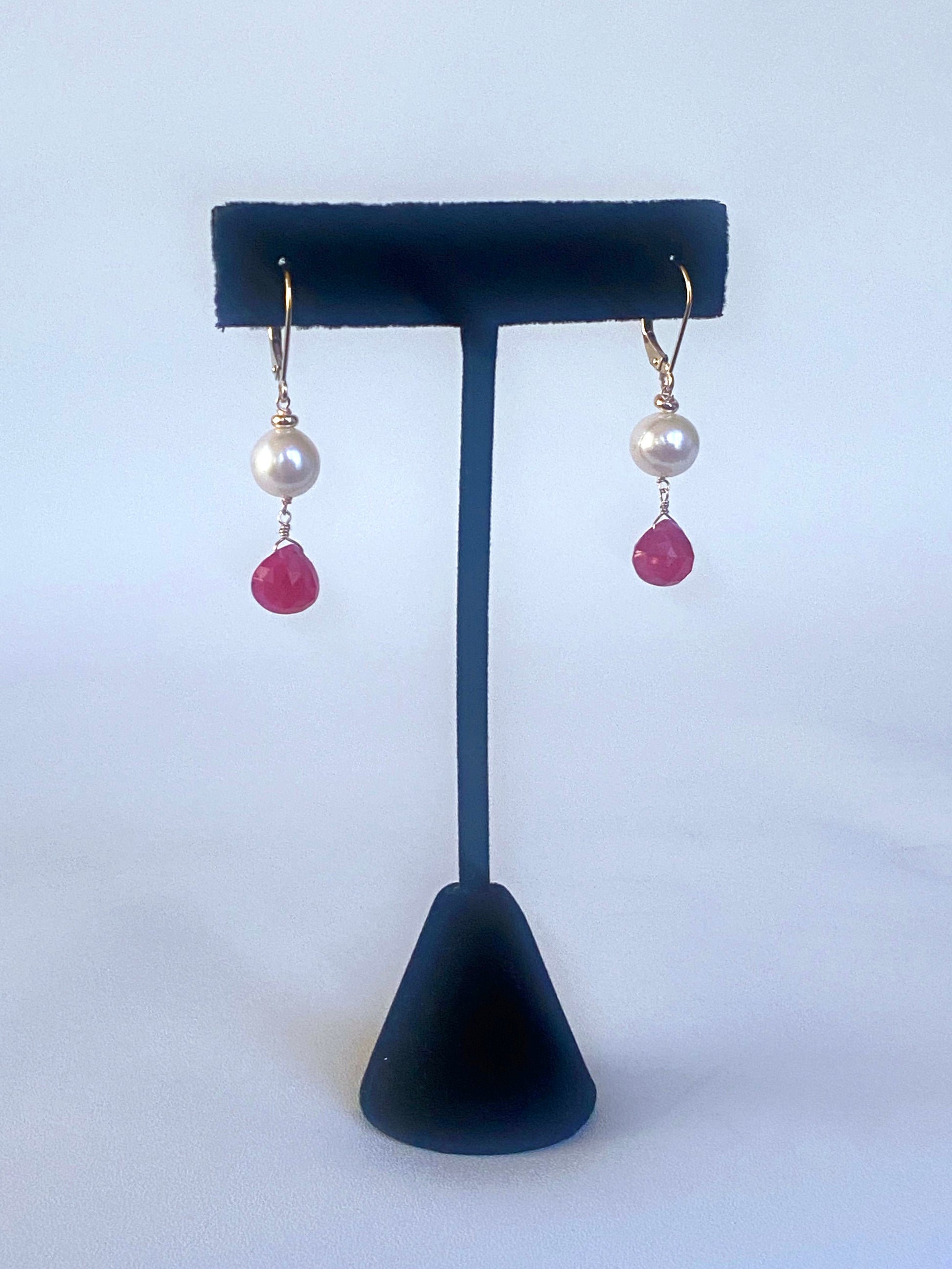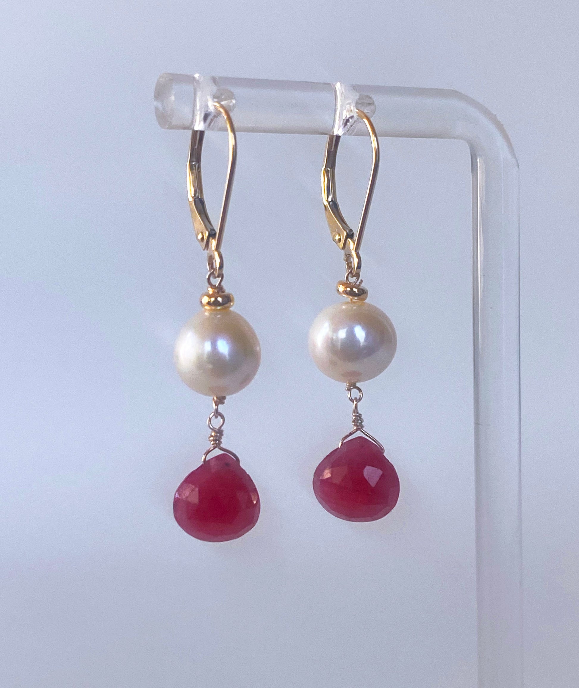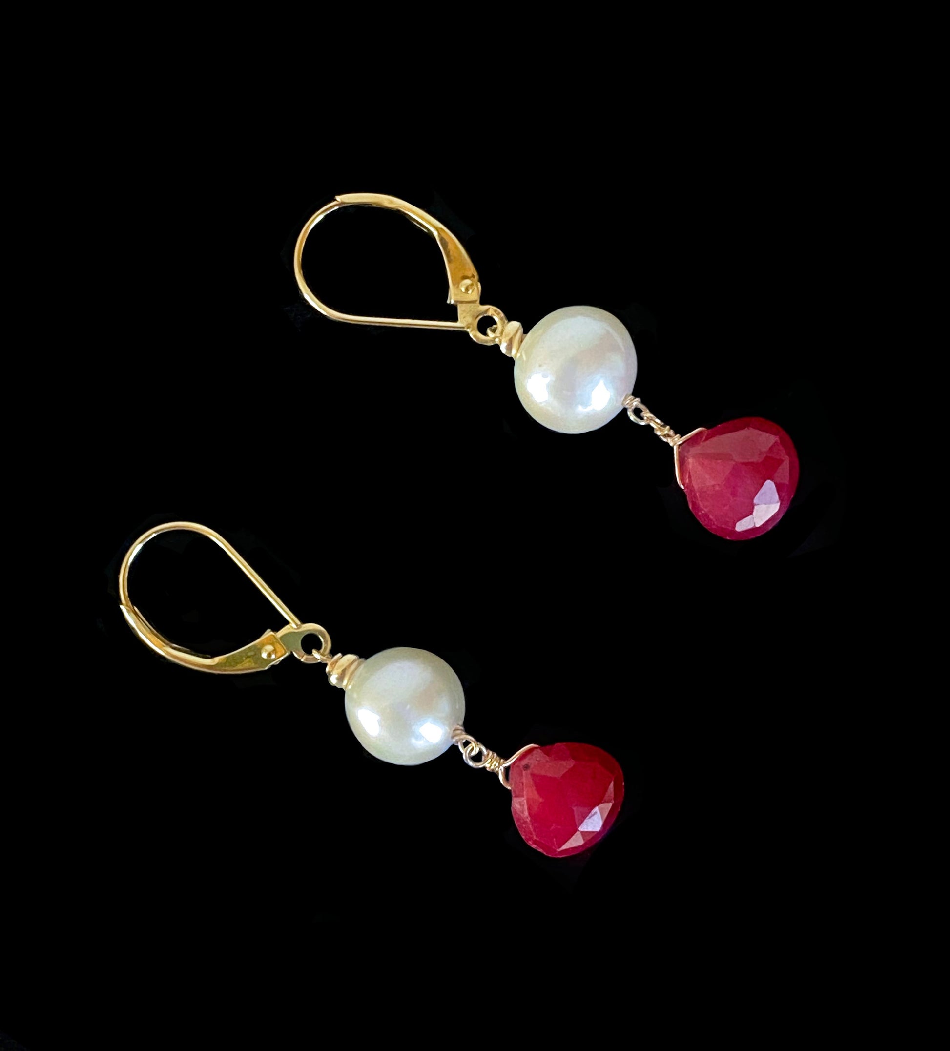 Ruby, Pearl & 14k Yellow Gold Lever Back Earrings