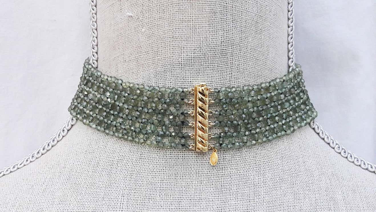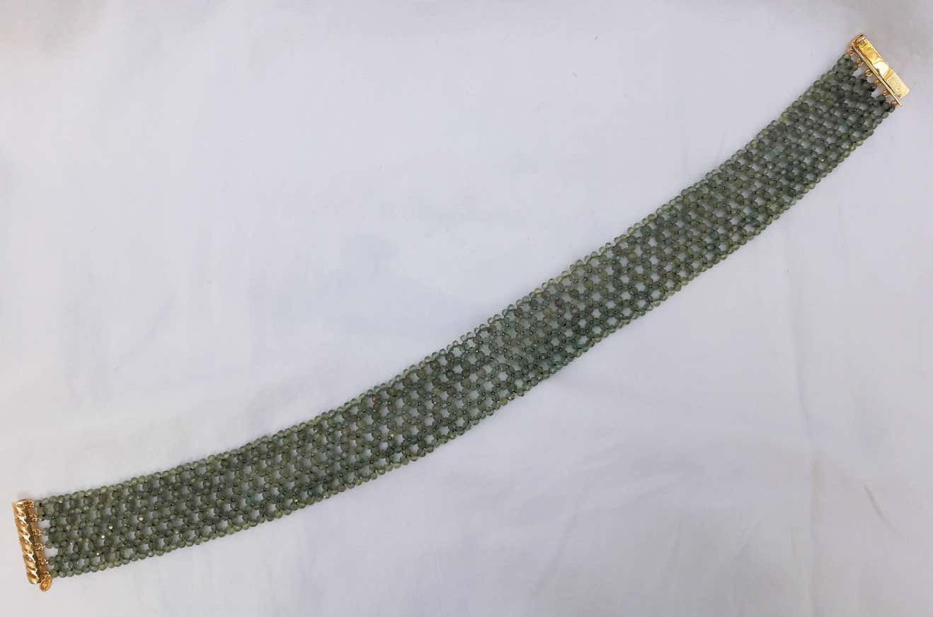 The faceted woven green onyx beaded choker was made by Marina J with tapered design and yellow gold plated silver clasp. The translucent green color of the onyx looks ethereal and lays lightly on the skin. This delicate choker has a gold plated sliding silver clasp, that is secure and easy to use. At 1.5 inches wide and 16 inches long the necklace fits comfortably on the necklace. The elegant lace-like design drapes around your neck makes your outfit one to remember.