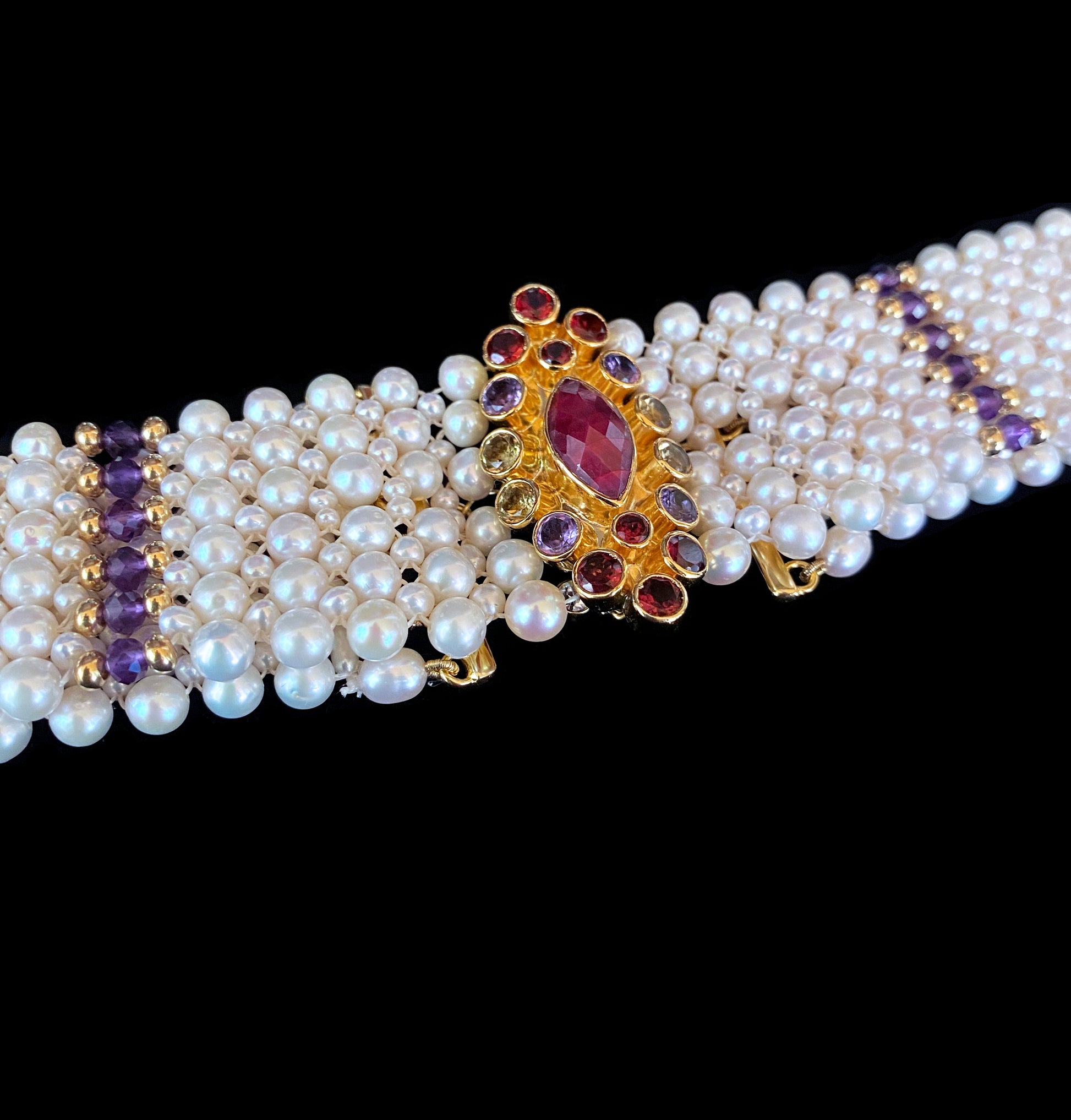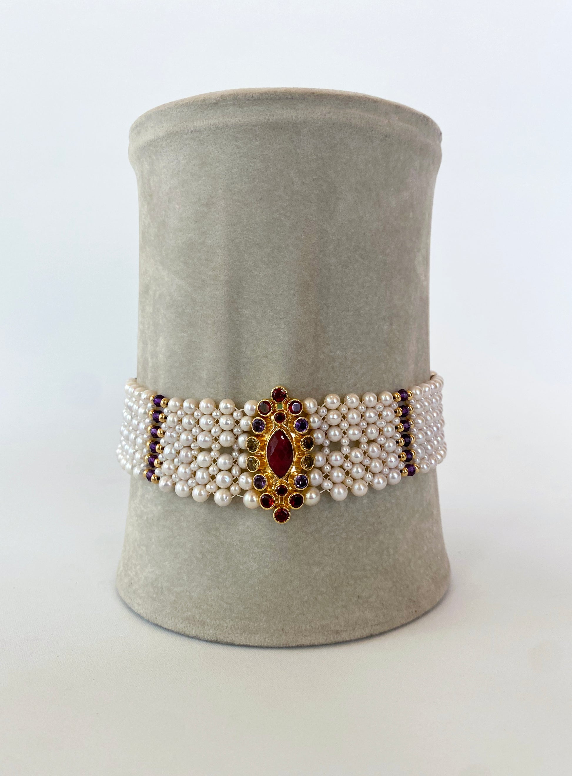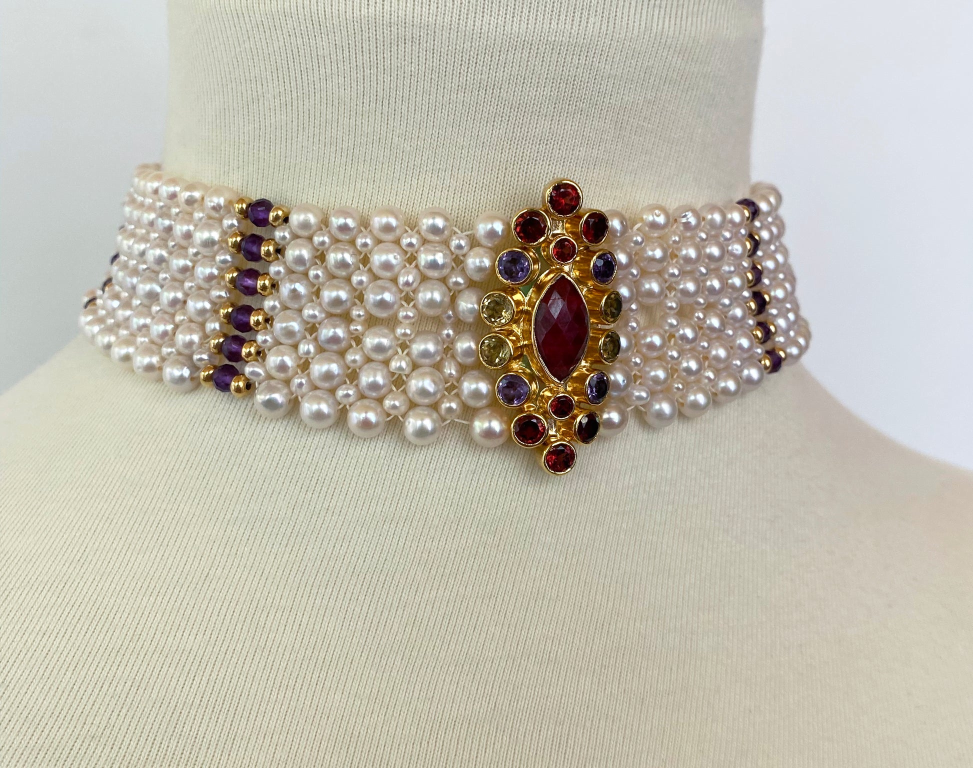 Gorgeous One of A Kind Choker made by Marina J . This elegant Choker is made of multi sized Pearls intricately woven together into a tight Lace like design. The Pearls are woven with a slight graduation allowing this Choker to sit perfectly along the natural curve of the neck. This piece frames a vintage 18 k Yellow Gold plated Silver brooch featuring a faceted Ruby surrounded by beautiful Amethysts, Citrin and Garnets-reworked into a remarkable One Of A Kind Centerpiece. Four rows of 18k Yellow Gold Plated beads and faceted Amethysts adorn the pearl woven band , perfectly matching and complimenting the multi gem centerpiece. the choker meets a 18 k Yellow Gold Plated adjustable clasp , allowing this piece to measure between 12.75 and 15 inches long.