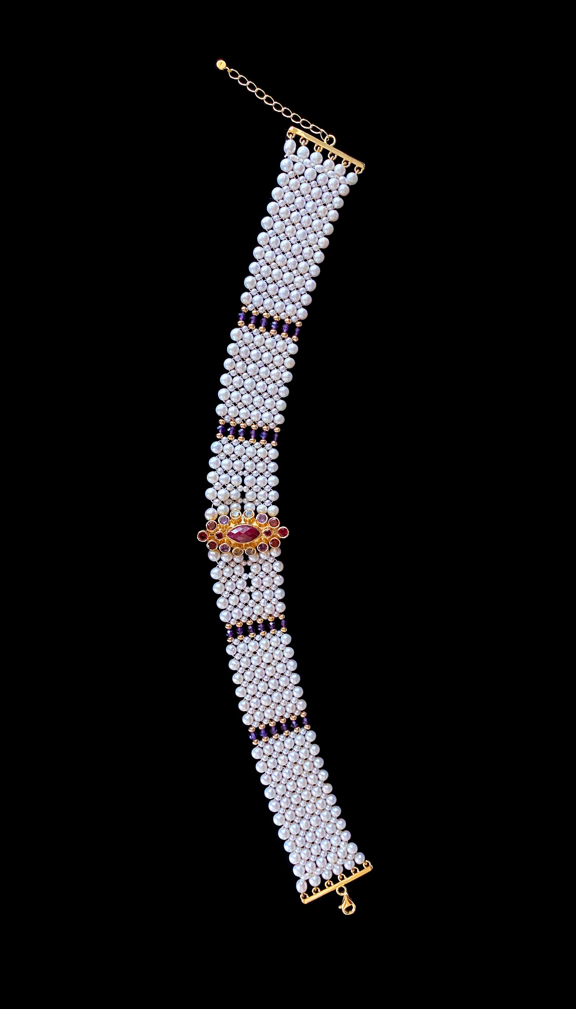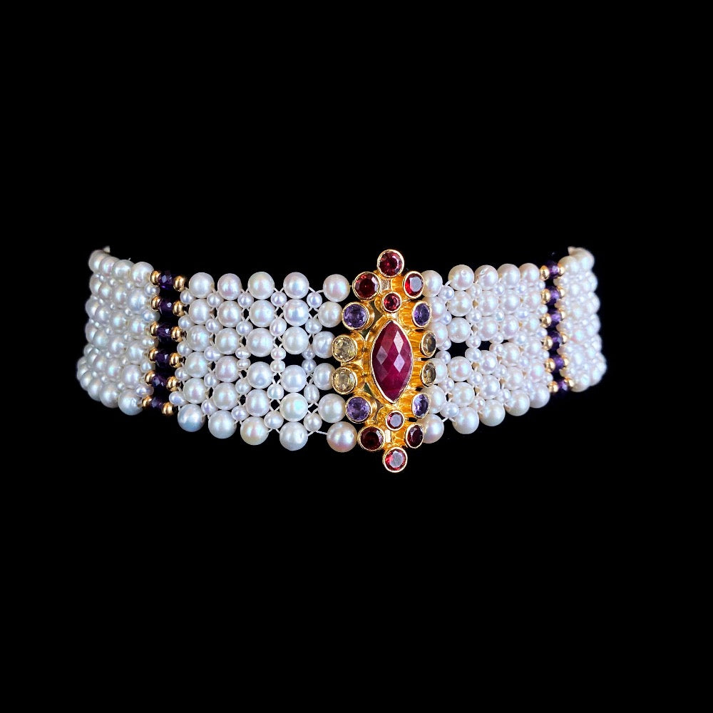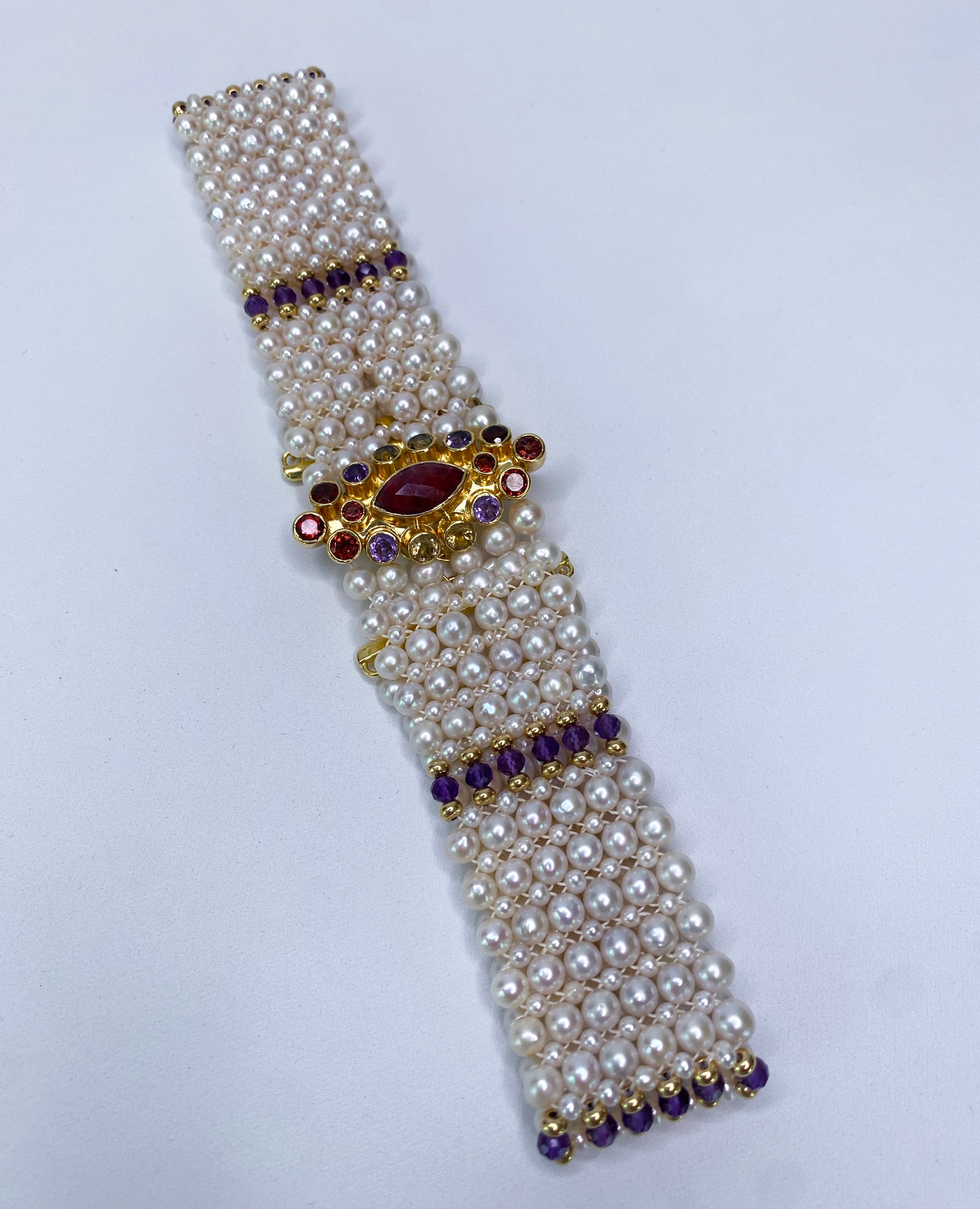 Gorgeous One of A Kind Choker made by Marina J . This elegant Choker is made of multi sized Pearls intricately woven together into a tight Lace like design. The Pearls are woven with a slight graduation allowing this Choker to sit perfectly along the natural curve of the neck. This piece frames a vintage 18 k Yellow Gold plated Silver brooch featuring a faceted Ruby surrounded by beautiful Amethysts, Citrin and Garnets-reworked into a remarkable One Of A Kind Centerpiece. Four rows of 18k Yellow Gold Plated beads and faceted Amethysts adorn the pearl woven band , perfectly matching and complimenting the multi gem centerpiece. the choker meets a 18 k Yellow Gold Plated adjustable clasp , allowing this piece to measure between 12.75 and 15 inches long.